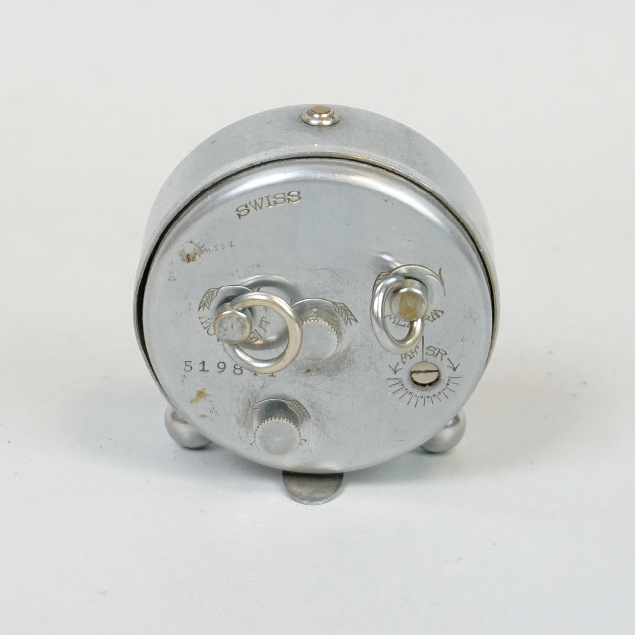 Weißmetall, Kugelfüße. Seriennummer 519841. Höhe 6,5 cm, Durchmesser ca. 6 cm.