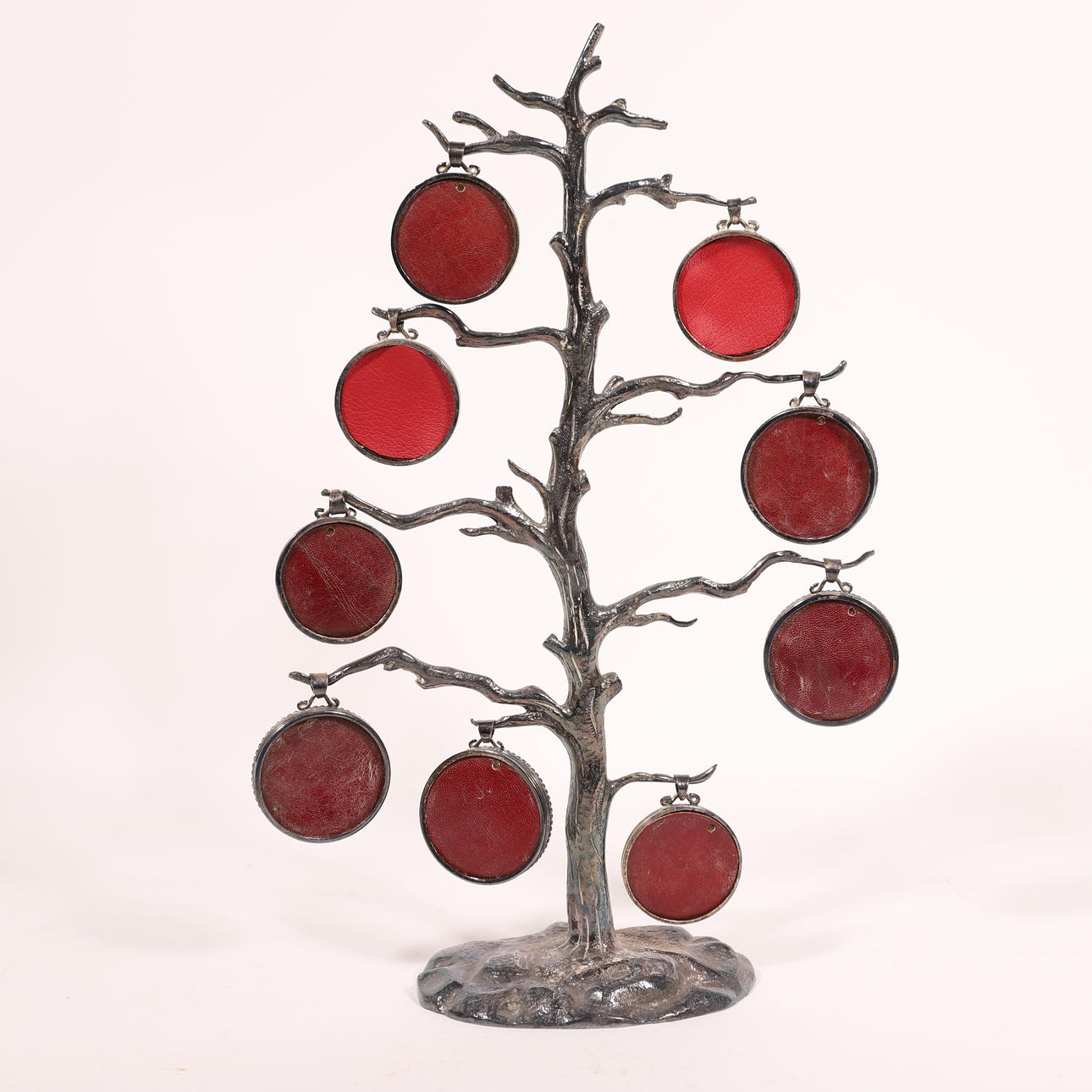 aus silbernem Metall mit perlmuttfarbenen kugelförmigen Bilderrahmen mit Glas und roter Rückseite. Markieren Sie auf der Vorderseite des Stückes, direkt am Ende des Stammes.