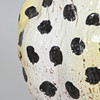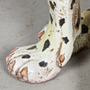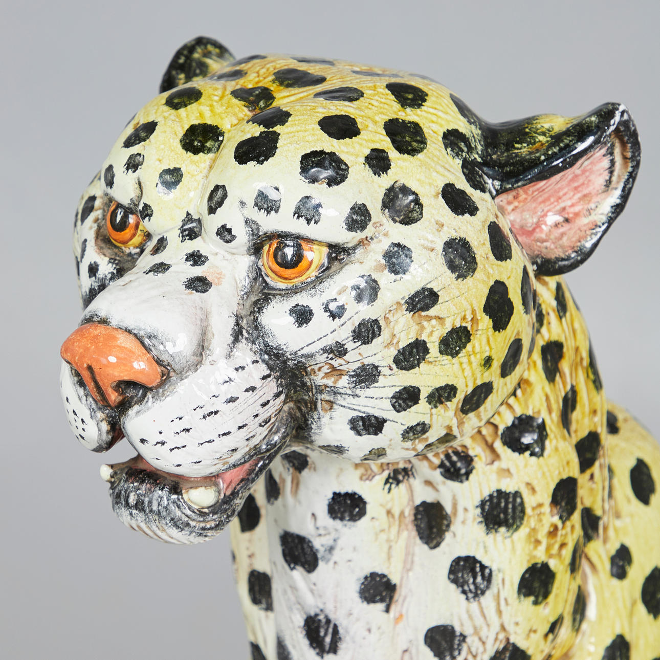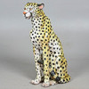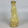 Figur / Skulptur, Leopard, Keramik. Figur aus polychrom glasierter Keramik in Form eines sitzenden Leoparden, den Kopf nach vorne gerichtet, H.96cm, B.37cm, T.51cm.