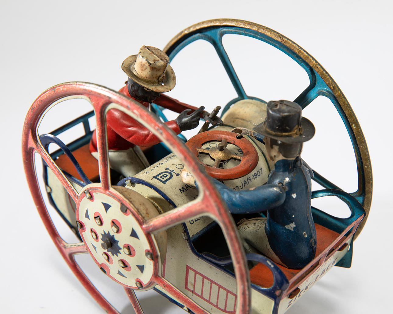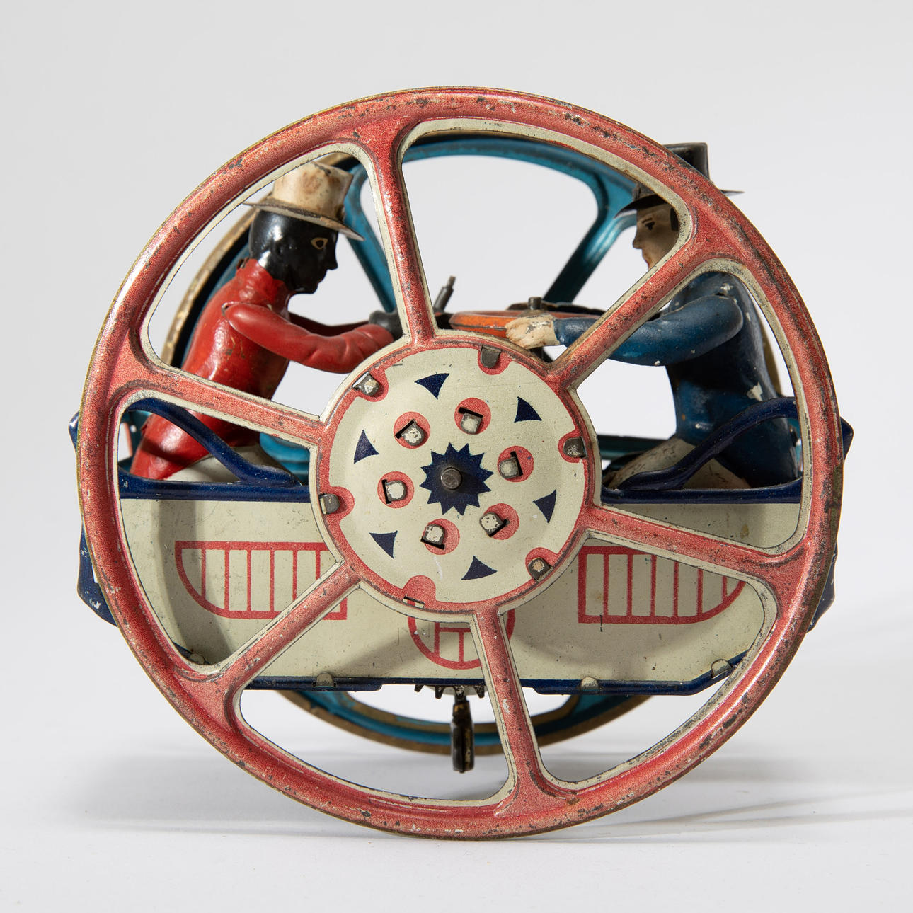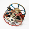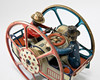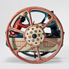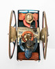 Gefährt auf zwei großen Rädern. Metallblech, polychromes Dekor.