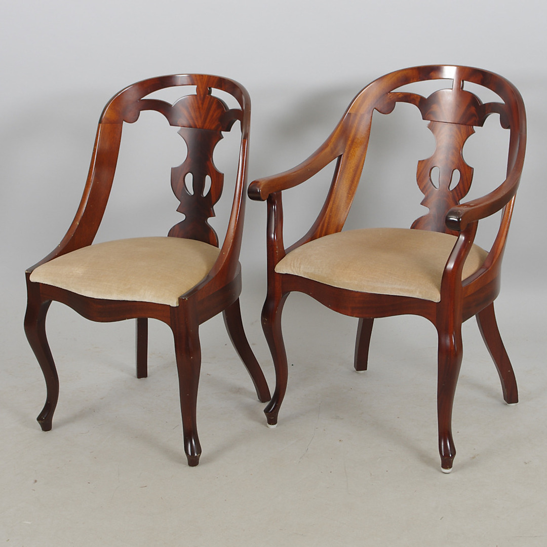 229149. SESSEL UND Stuhl, Mahagoni, sogenannte Göteborg-Stühle.