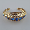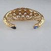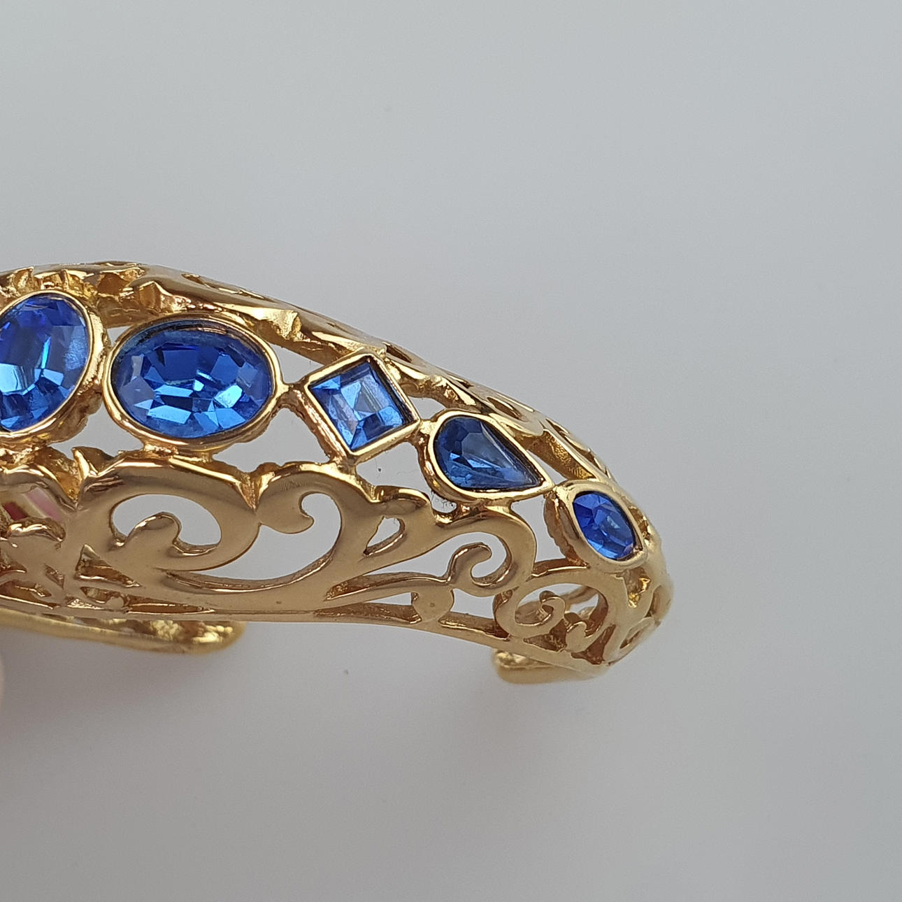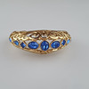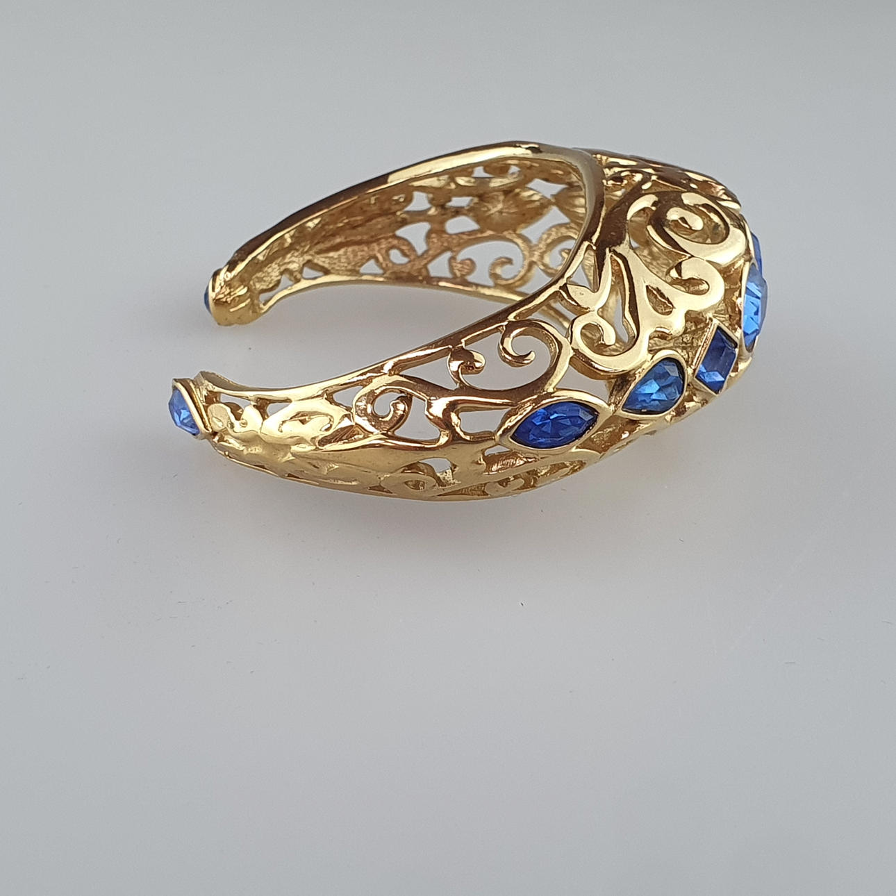 vergoldet, offene Armspange von ovaler Form, Durchbrucharbeit mit Rankenornamentik, Besatz mit saphirblauen Glaskristallen in unterschiedlichen Schliffarten, innen signiert sowie bezeichnet „Made in France“, ca.6 x 7 cm, ca. 40,9 g.