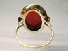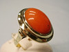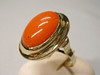 Er ist besetzt mit einem großen Cabochon aus polierter Mittelmeer-Koralle in schöner Farbe und sehr gut erhaltenem Glanz. Der große Sardegna-Korallen-Cabochon wird von einer glatten gestuften Spiegelfassung gehalten. An den Ringschultern sind polierte Auflagen angebracht.