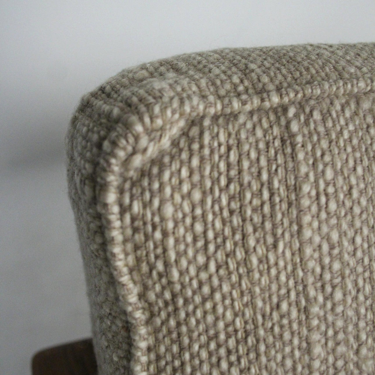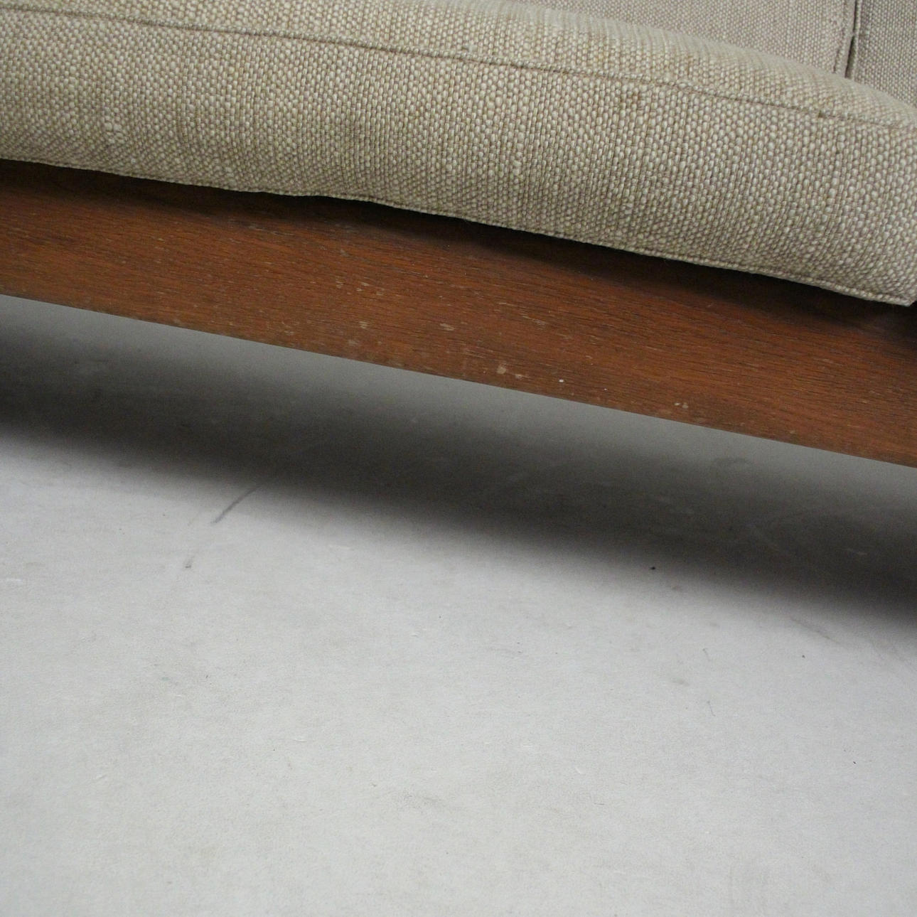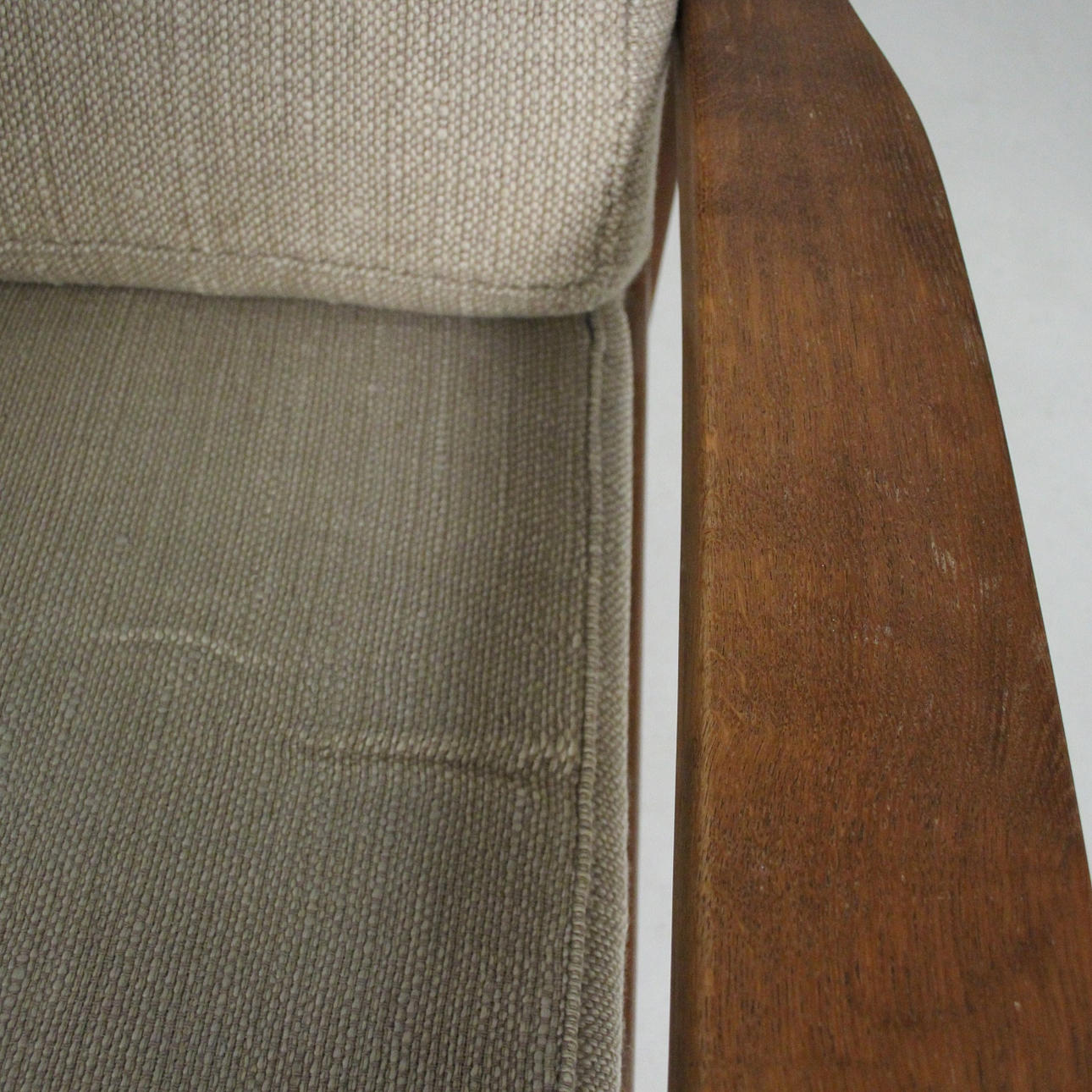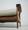 Material: Teakholz, Schaumstoff, textiles Flachgewebe in grober Wollqualität, Gummigurtung als Polstergrund.