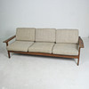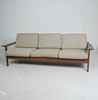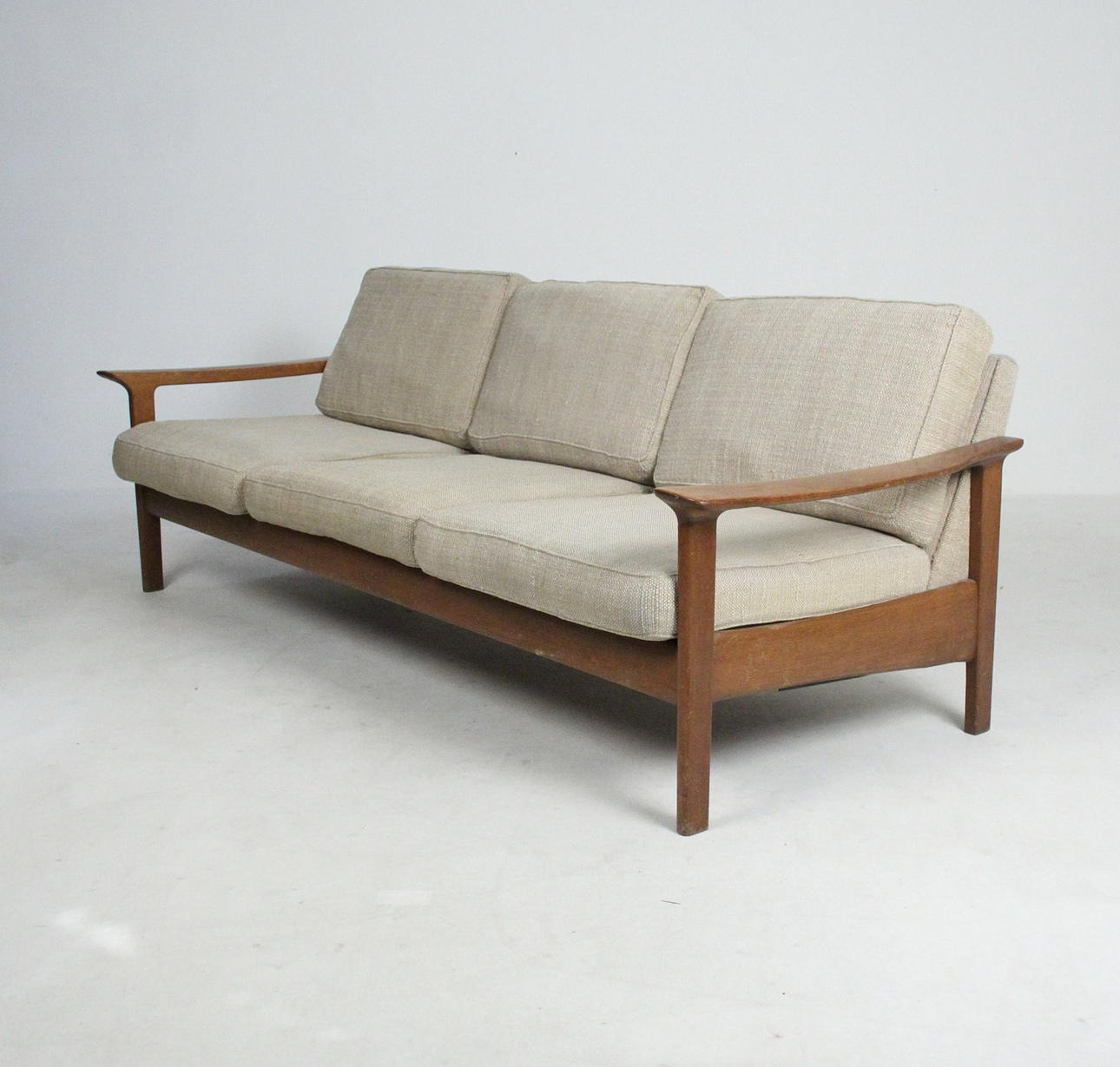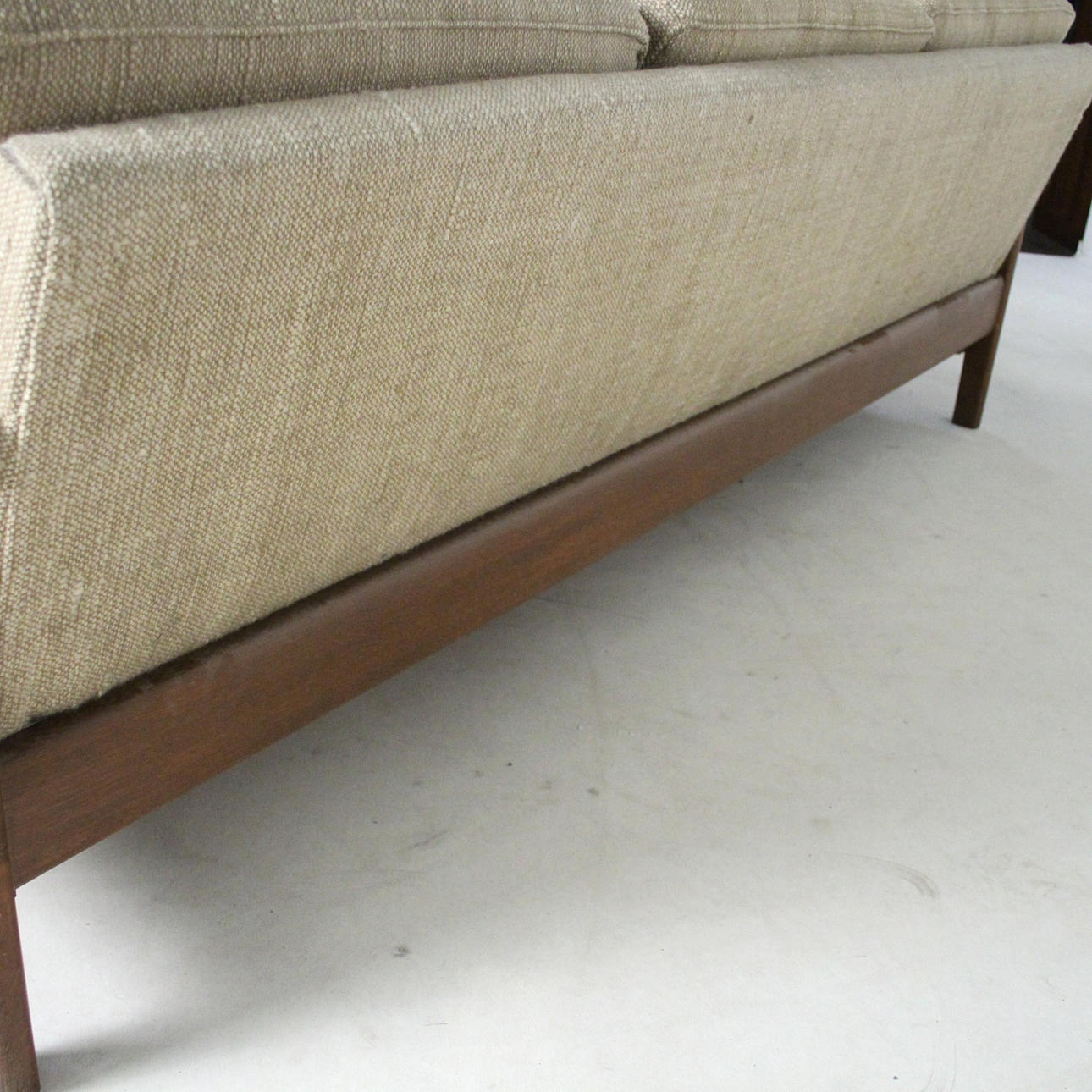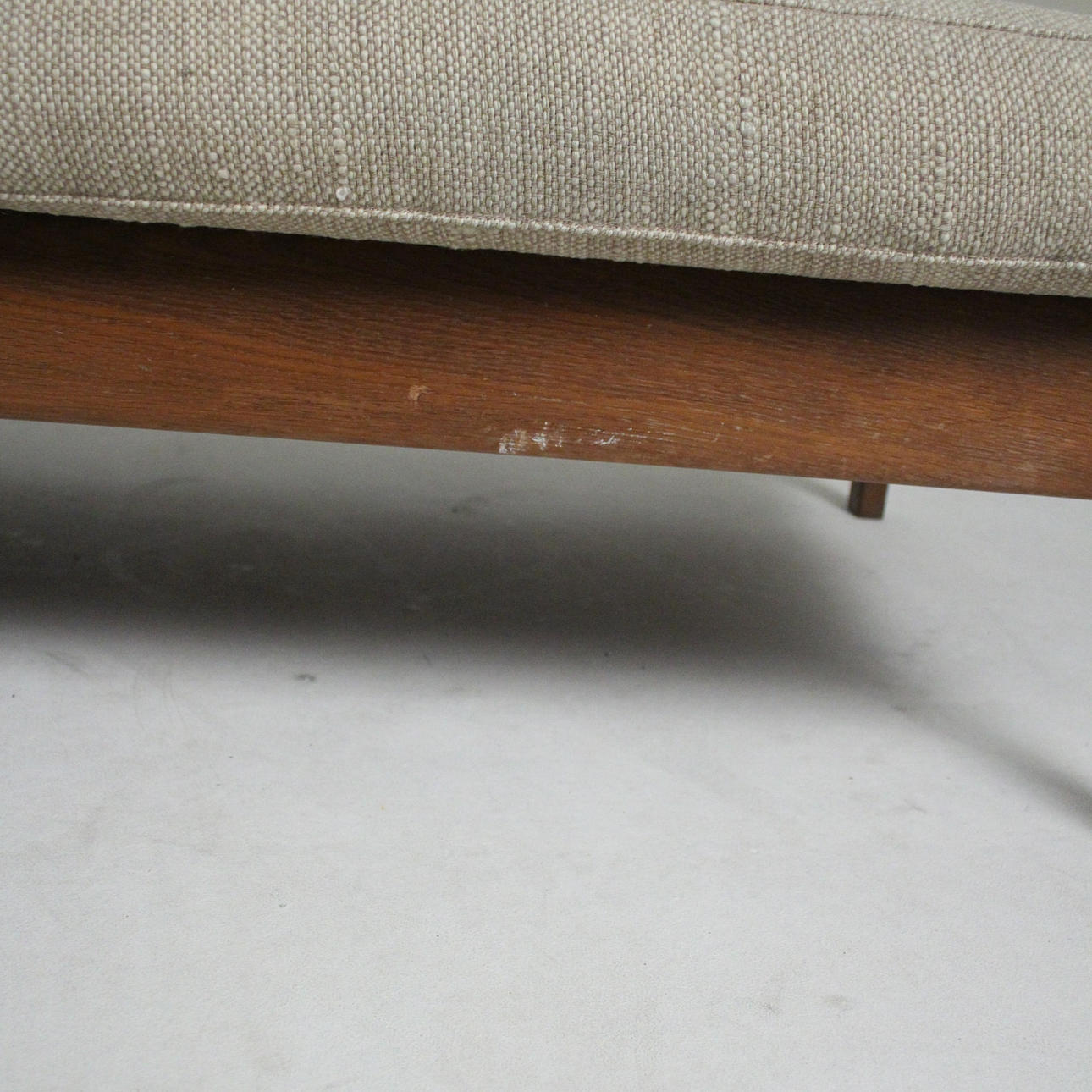 Material: Teakholz, Schaumstoff, textiles Flachgewebe in grober Wollqualität, Gummigurtung als Polstergrund.