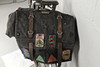 Carradice aus den 1950er Jahren, lange Satteltasche aus Leder mit Klappe, die mit historischen Abzeichen bedeckt ist.