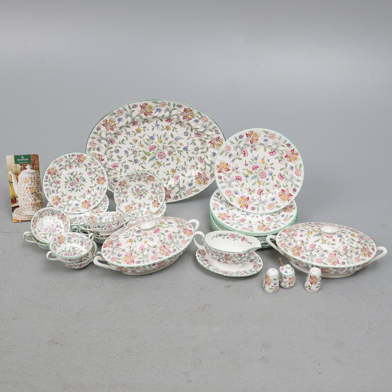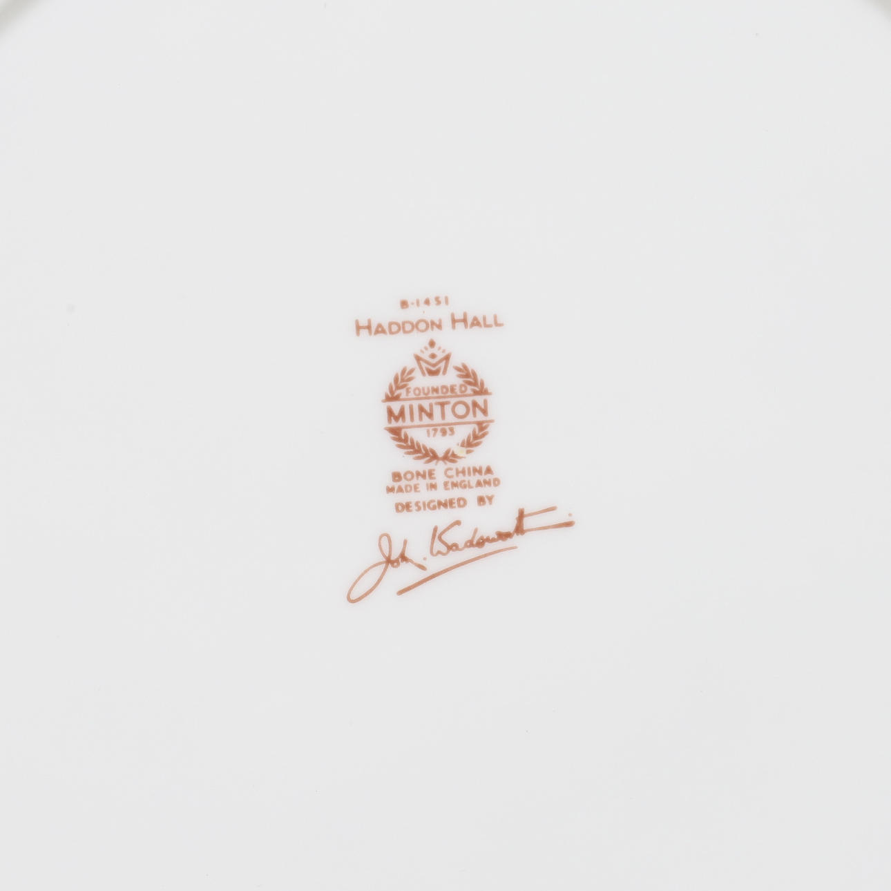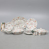 bestehend aus: 10 Speisetellern, 6 Käsetellern, 6 Suppentassen und Untersetzern, großer ovaler Platte, Sauciere mit festem Untergestell, 2 gedeckten Gemüsetellern, Salz, Pfeffer und Senf (35).