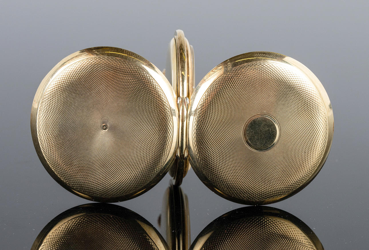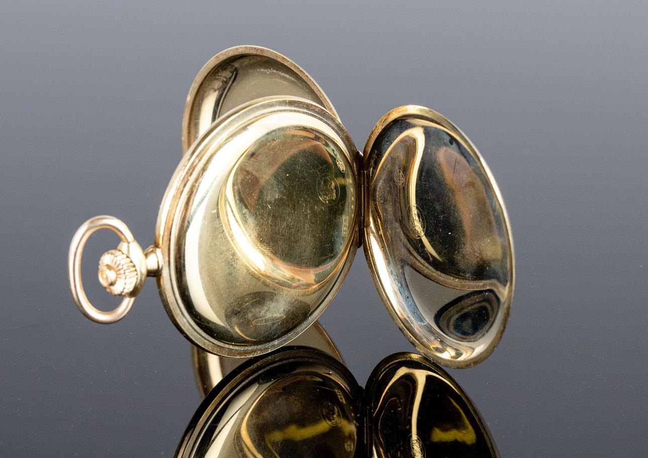 Gehäuse gefertigt aus 585er Gold, silbernes Zifferblatt mit Minuten- und Stundenzeiger und kleiner Sekunde. Handaufzug. Maße ca. Durchmesser Ø 5 cm. Stockhoms Auktionsverk garantiert nicht für die Funktionalität.