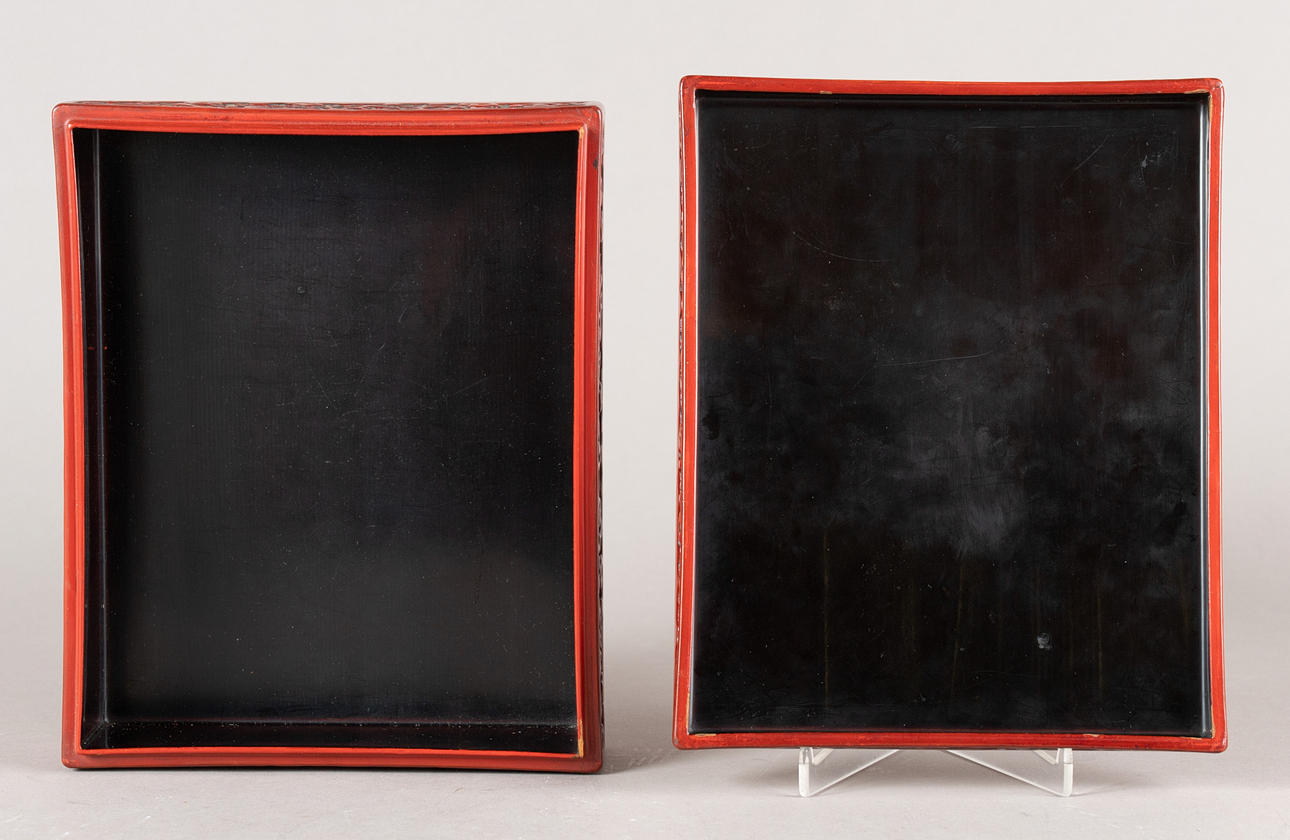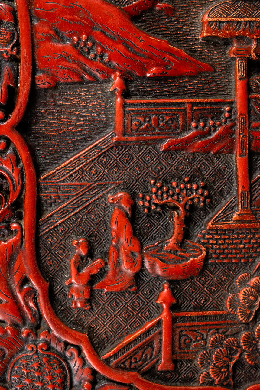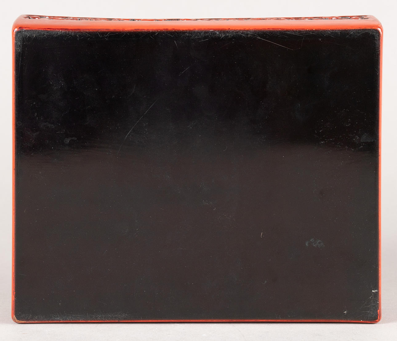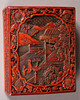 Rechteckiger Holzkorpus, allumfassend reich beschnittener Zierdekor. Auf dem Deckel reliefierte Figurenszene in Hoflandschaft in Kartusche, umgeben Blüten, vierseitig mit reliefierte Ranken, innen und unterseitig in Schwarz lackiert, HxBxT: ca. 9x20x25 cm
