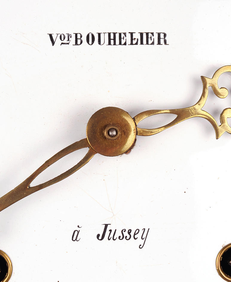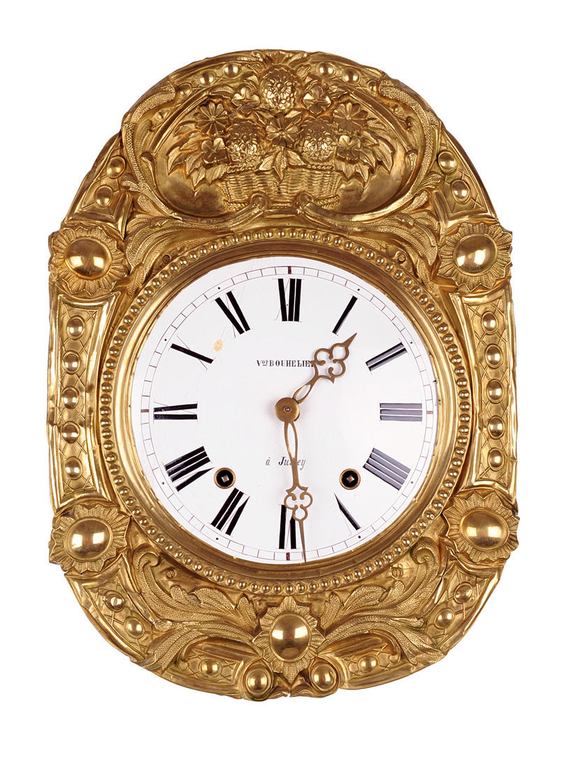 Geprägtes Messingblech-Fronton mit Blumenkorb-Dekor, Pendel passend. Emaille-Zifferblatt mit Besteller-Signatur und eingefassten Aufzugslöchern. Vermutlich Wochenwerk mit Stunden, Halbstunden- und Wiederholungsschlag auf Glocke. Provenienz: Jura.