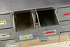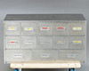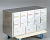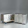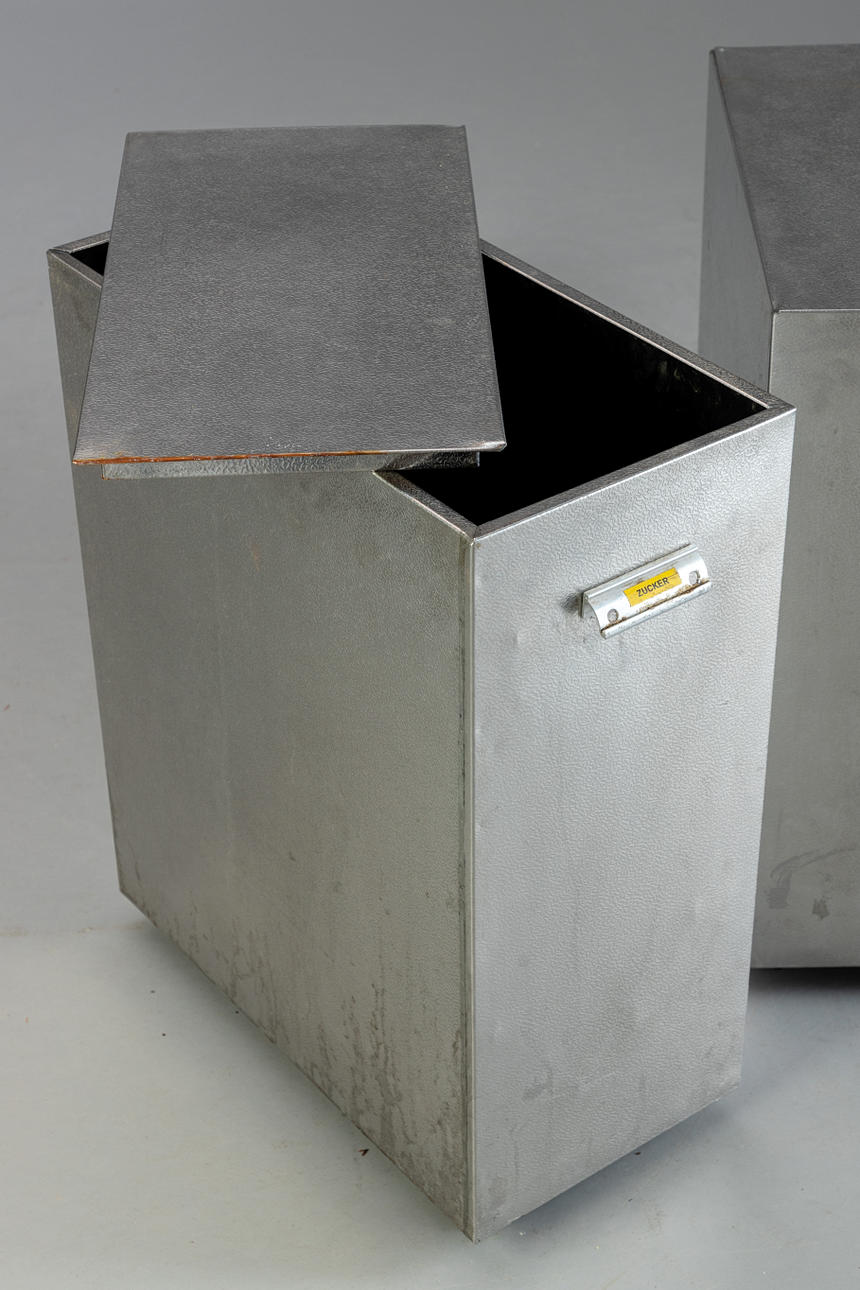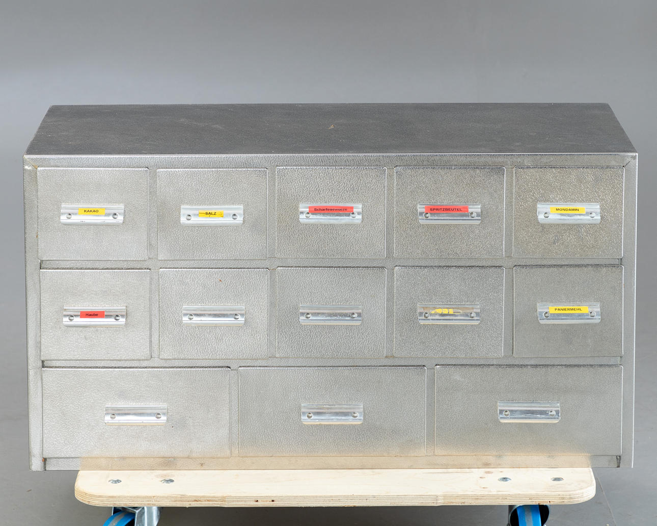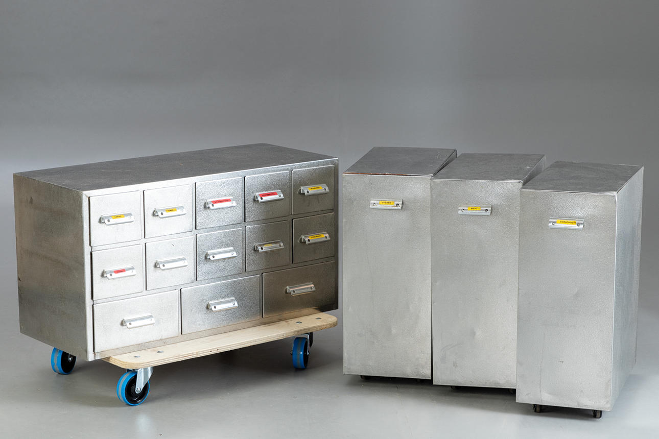 Schubladenelement und 3 Container aus Aluminiumblech, ursprünglich aus einer Bäckerei stammend. Schubladenelement mit 13 Schüben verschiedener Größen für diverse Backzutaten. 3 Container mit Deckel zum aufklappen und auf Rollen.
