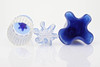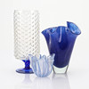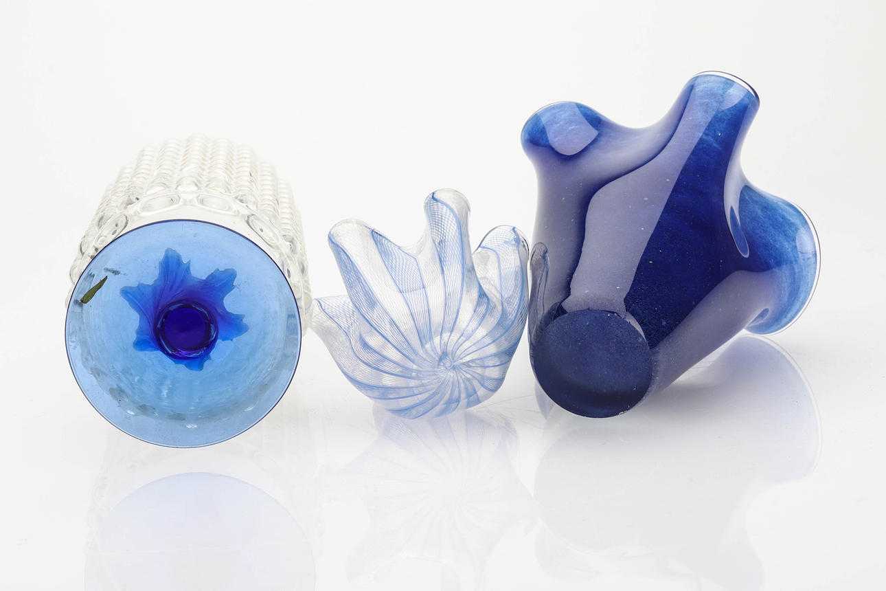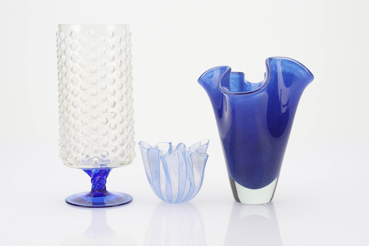 Vase mit "Blasen", blauer Fuß, Höhe 22,5 cm. Närduskvas blau, Venini, 8 cm. Vase Fazzoletto, blau, Höhe 18 cm.
