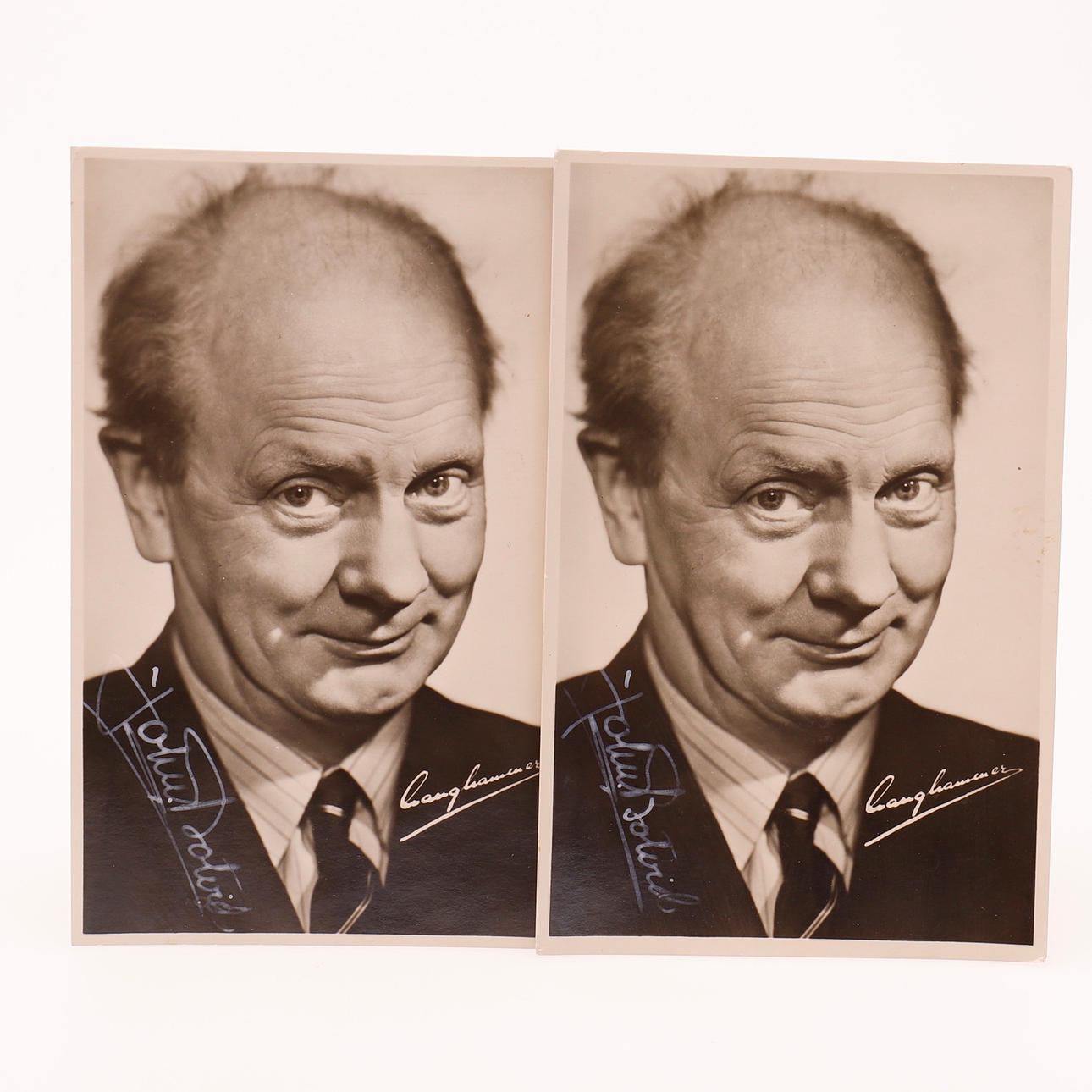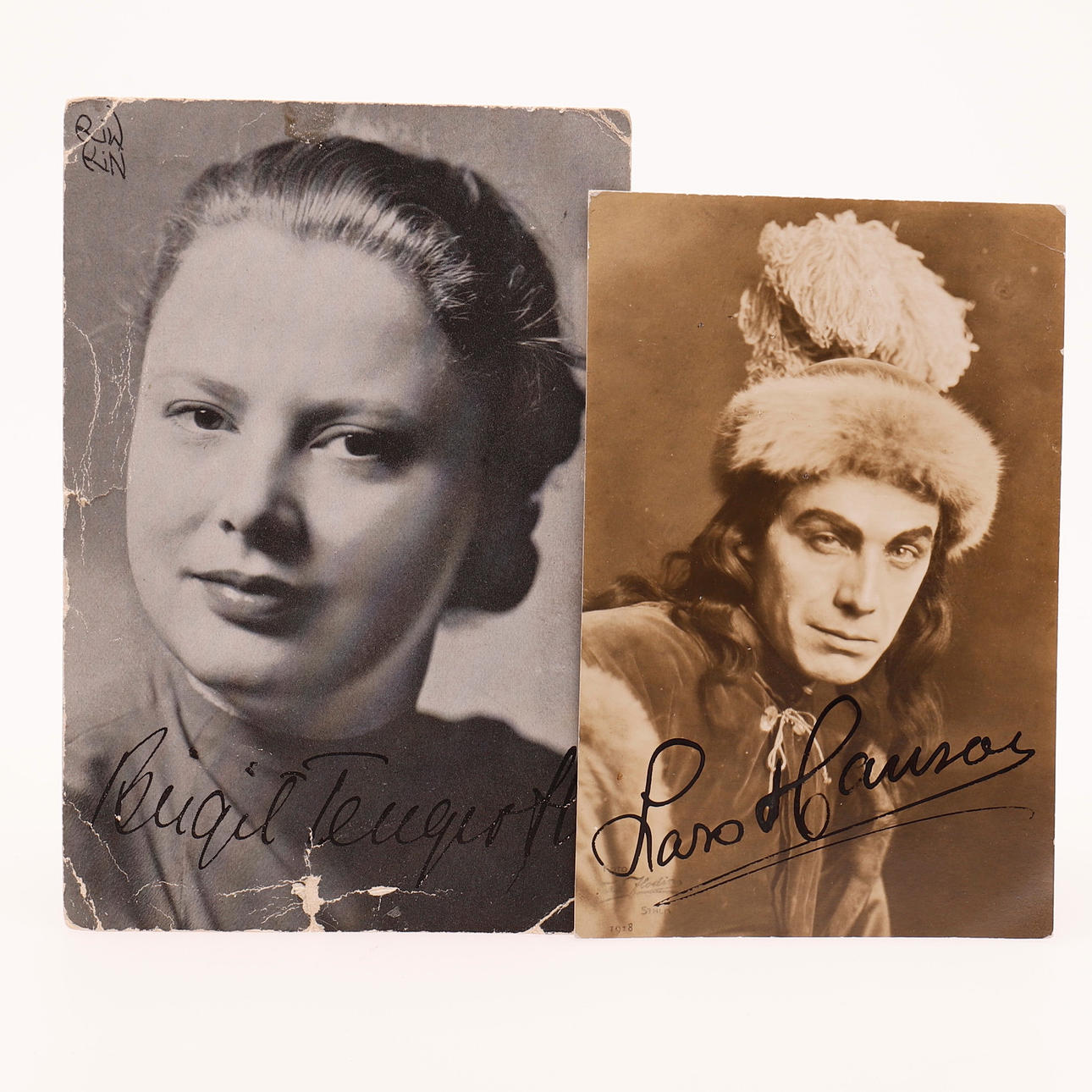 John Botvid - zwei signierte Fotos in Postkartengröße. Birgit Tengroth - signiertes Foto in Postkartengröße. Lars Hansson - signiertes Foto in Postkartengröße. Edvard Persson - signiertes Foto in Postkartengröße. Rosita Serrano - Signiertes Foto in Postkartengröße. Maurice Chevalier - signiert auf der Rückseite von Postkarten zusammen mit einer Reihe unbekannter Namen. Gustav V - signierte Karte. Alle in unterschiedlicher Qualität, außer Gustav V, der in guter Qualität ist.