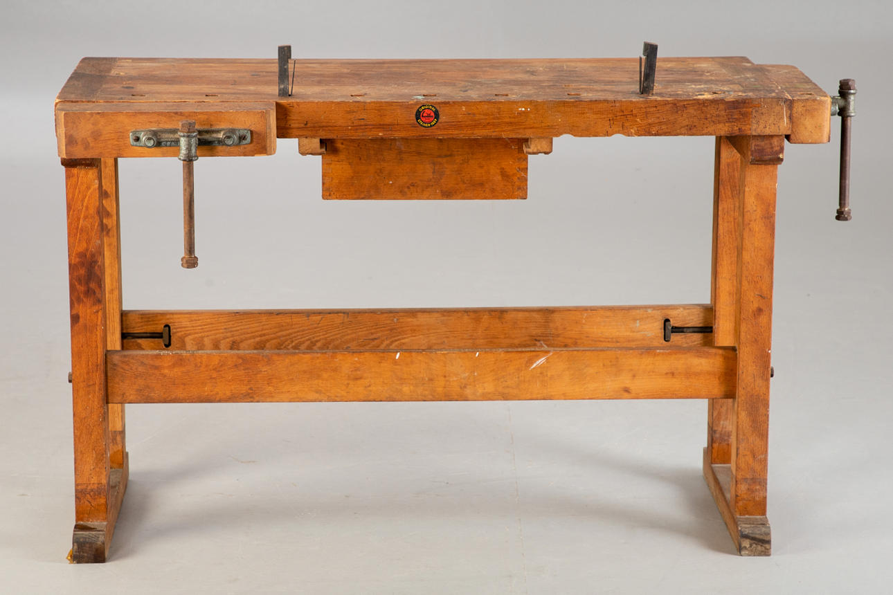 Hobelbank von Steiner. Hartholzgestell in Kufenform, 2 Spannzangen und 1 Schublade. Mit Herstellerplakette.