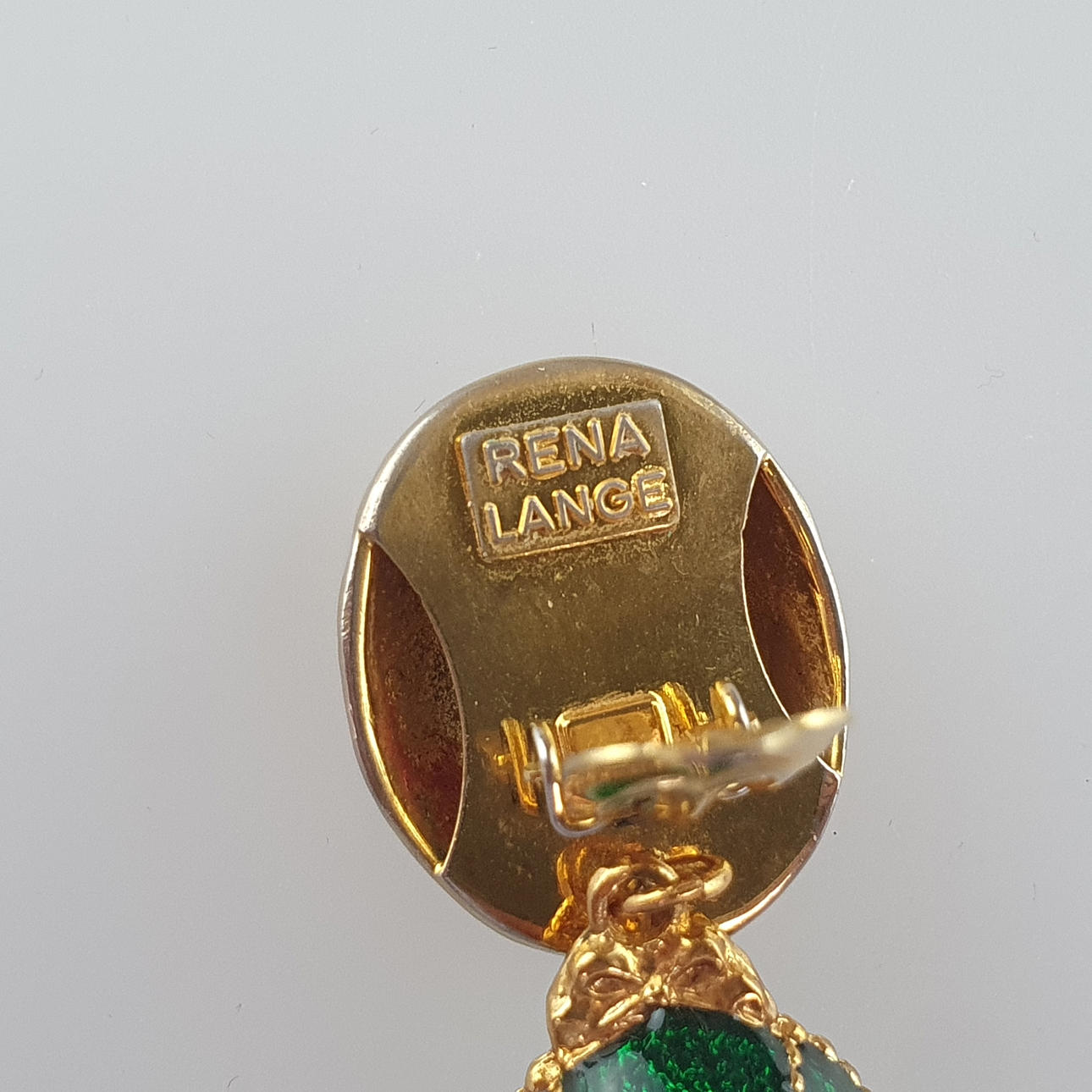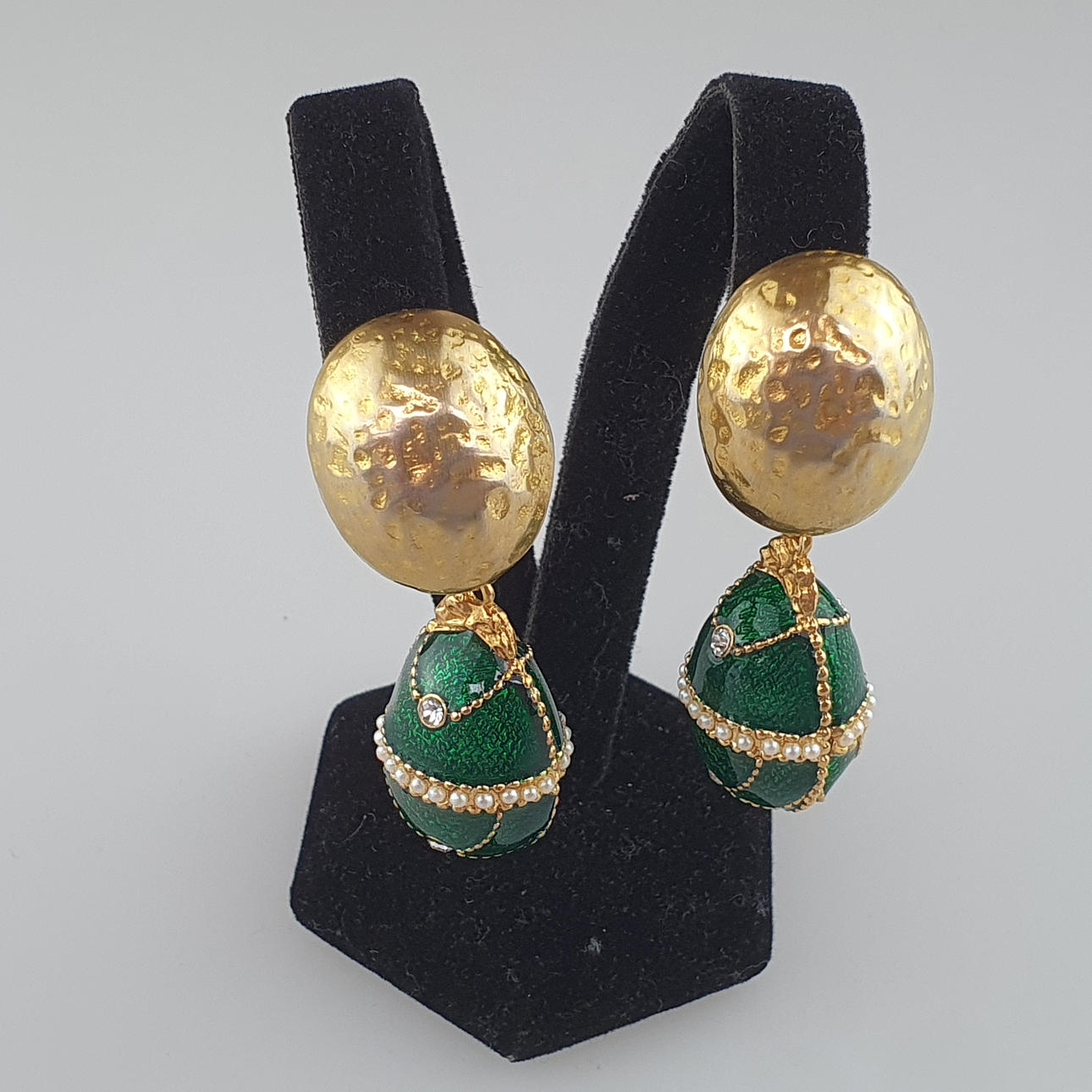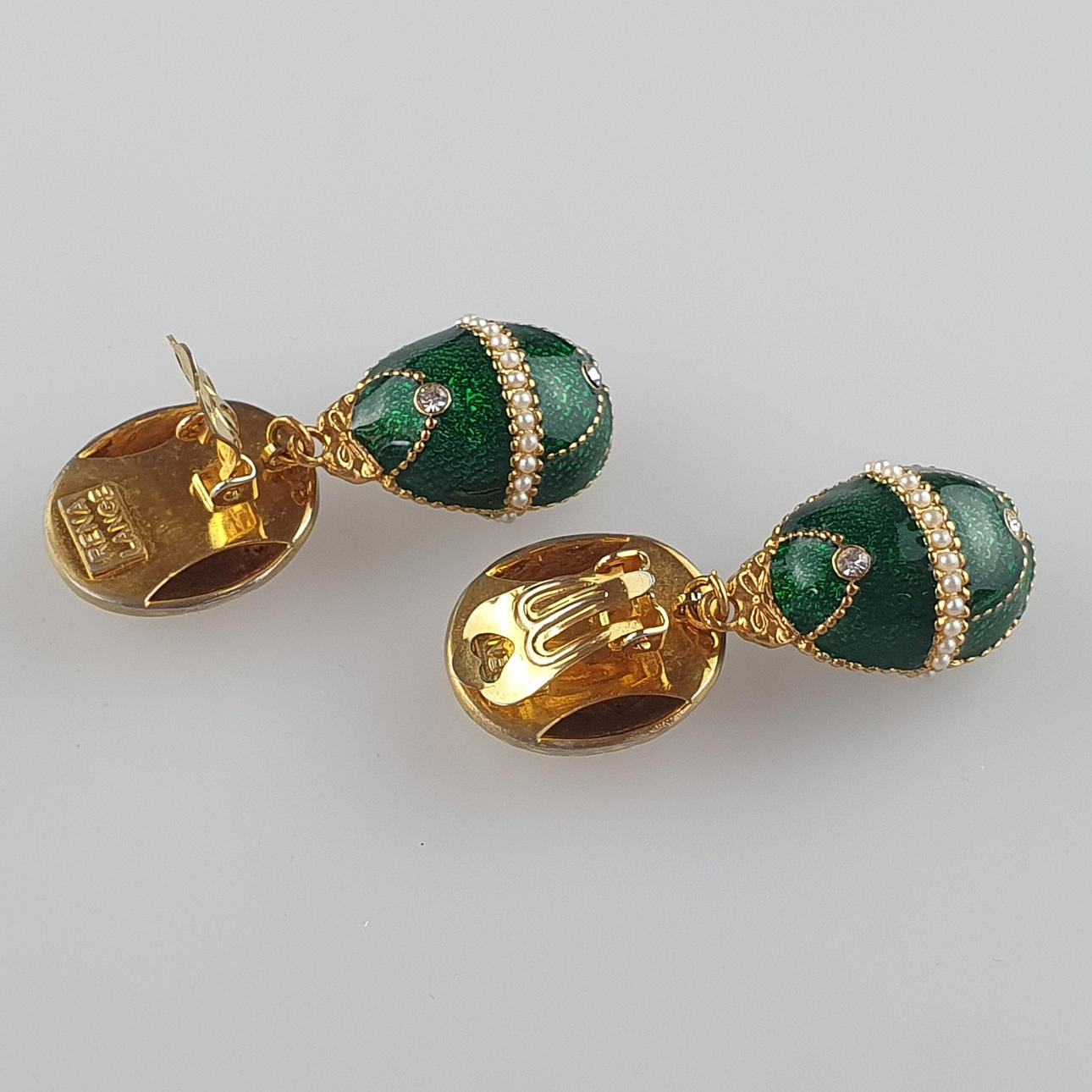 vergoldetes Metall, ovoide Abhängungen emailliert und verziert im Stil von Fabergé, gemarkt „RENA LANGE“, H. ca. 5,4 cm, Gesamtgewicht ca. 37,7 g.