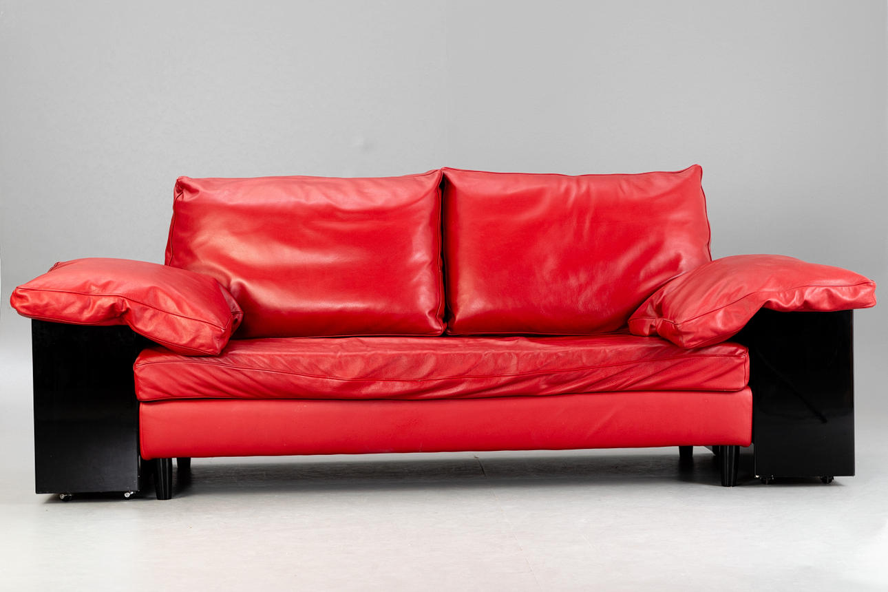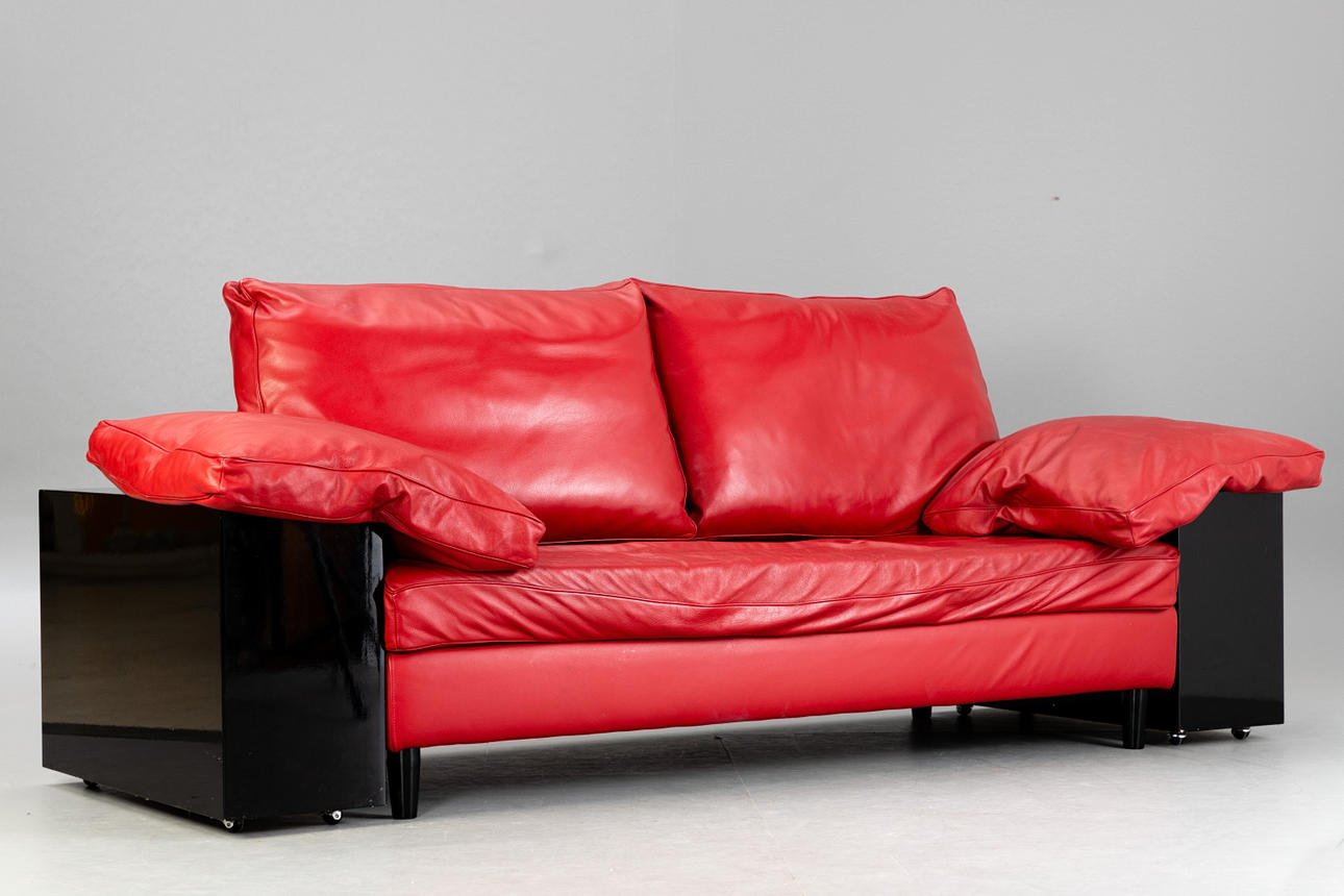 ClassiCon. Sofa 2-Sitzer 'Lota' von Eileen Gray. Entwurf: 1924. Gepolsterter Buchenrahmen mit Federkern. Eingehakte Seitenteile aus MDF in schwarz hochglanzlackiert. Lose aufliegende Kissen und Sitzpolsterung mit rotem Leder bezogen.