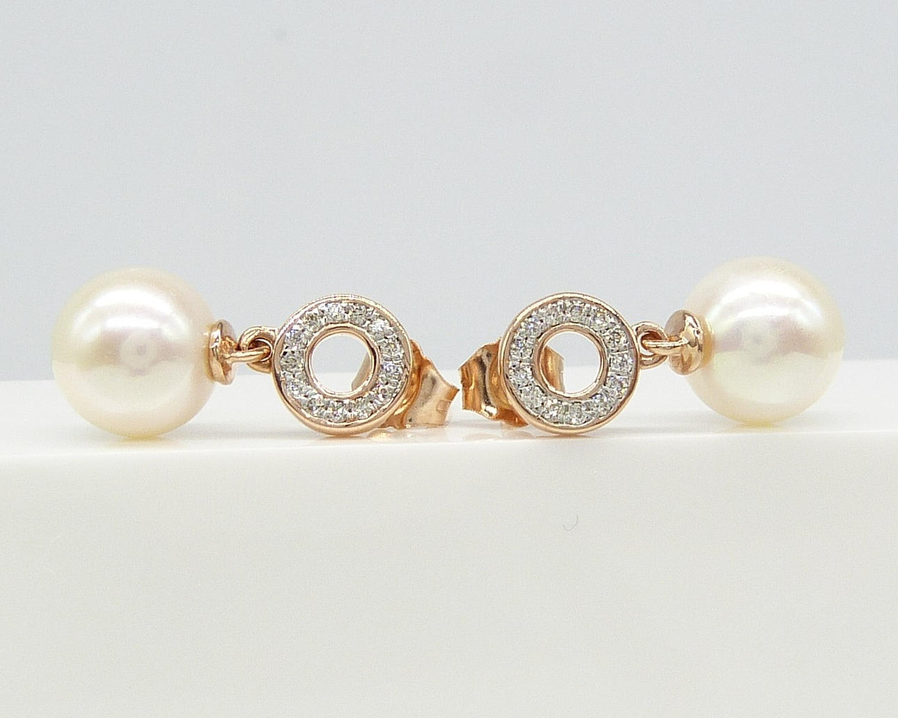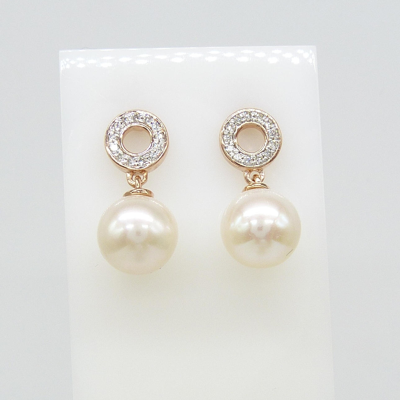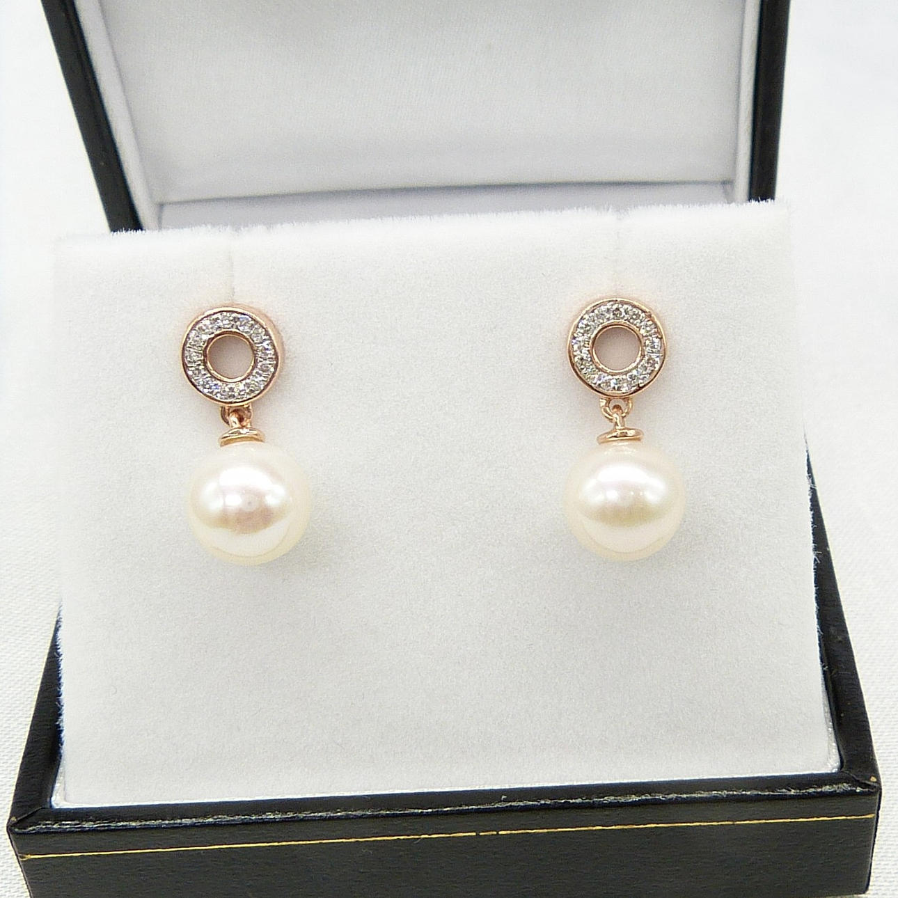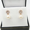 Ein Paar Halo-Ohrringe aus 9 Karat Roségold mit Zuchtperlen und DIAMANT mit Schmetterlingsverschluss, verpackt.