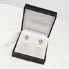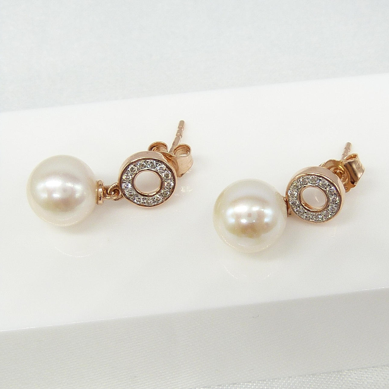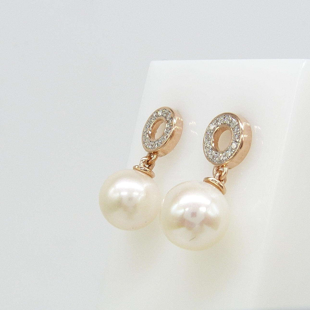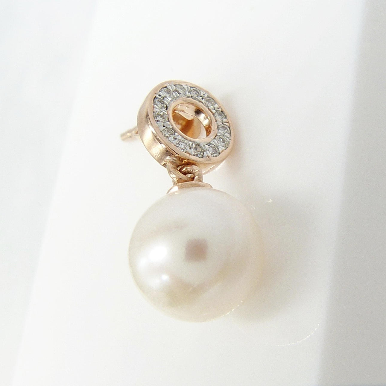 Ein Paar Halo-Ohrringe aus 9 Karat Roségold mit Zuchtperlen und DIAMANT mit Schmetterlingsverschluss, verpackt.