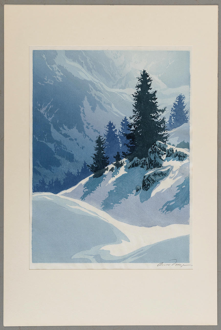 Oscar Droege (1898-1982/83), Berglandschaft, Farbholzschnitt auf Japanpapier, rechts unten signiert, ca. 39,7 x 29,5 cm, ungerahmt in Passepartout ca. 60 x 40 cm.