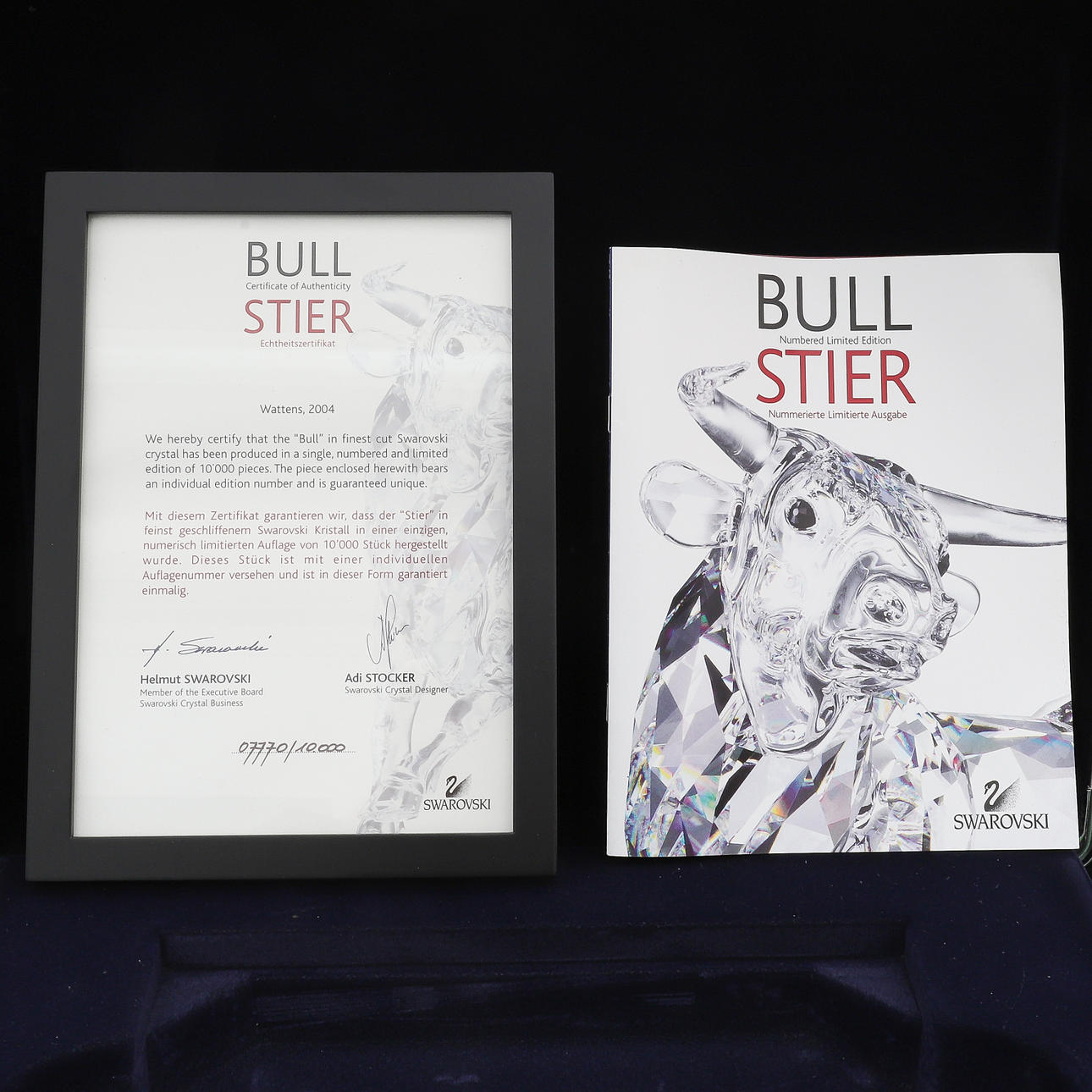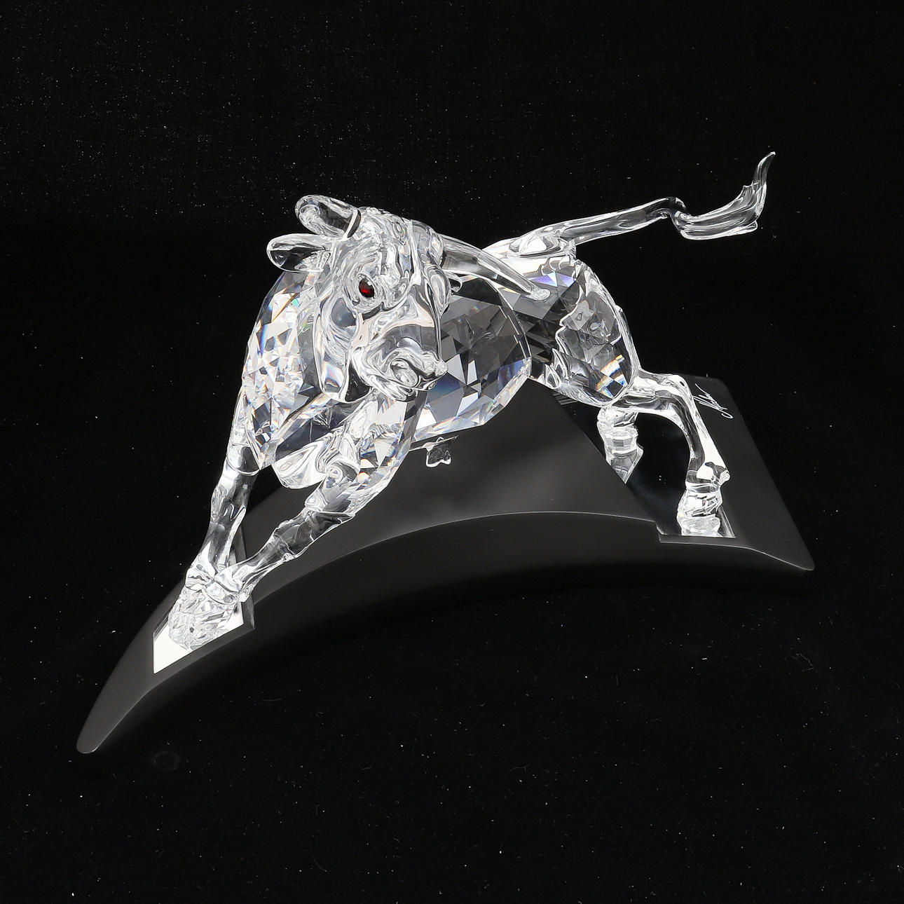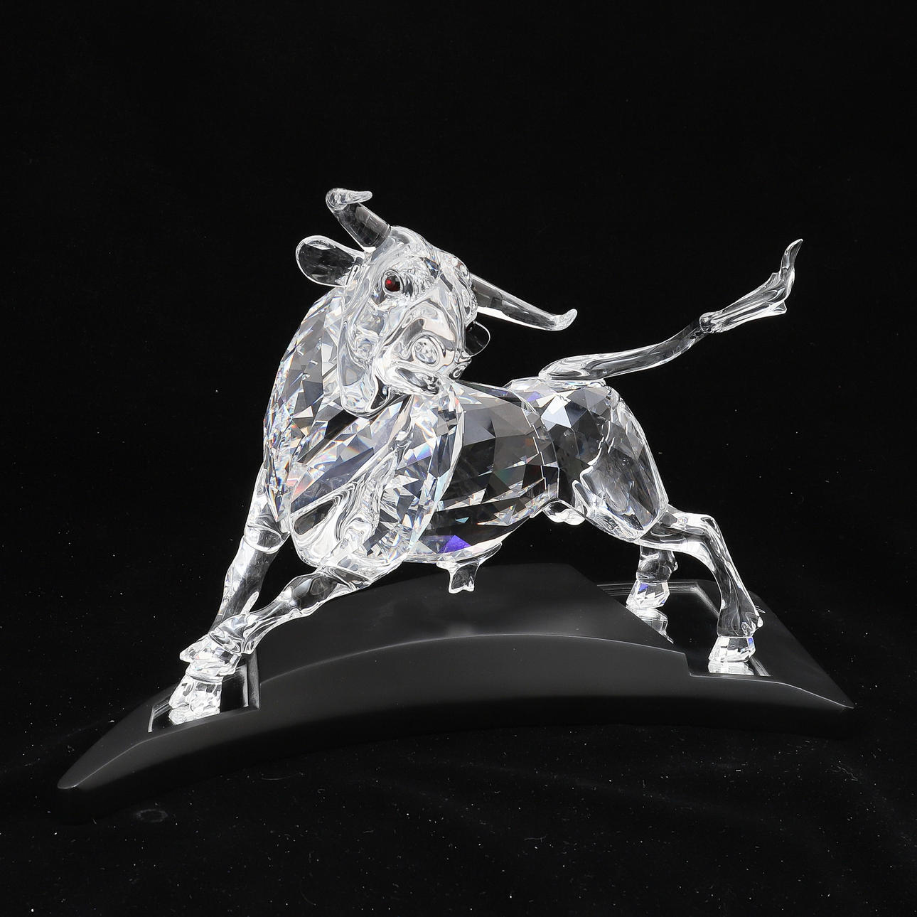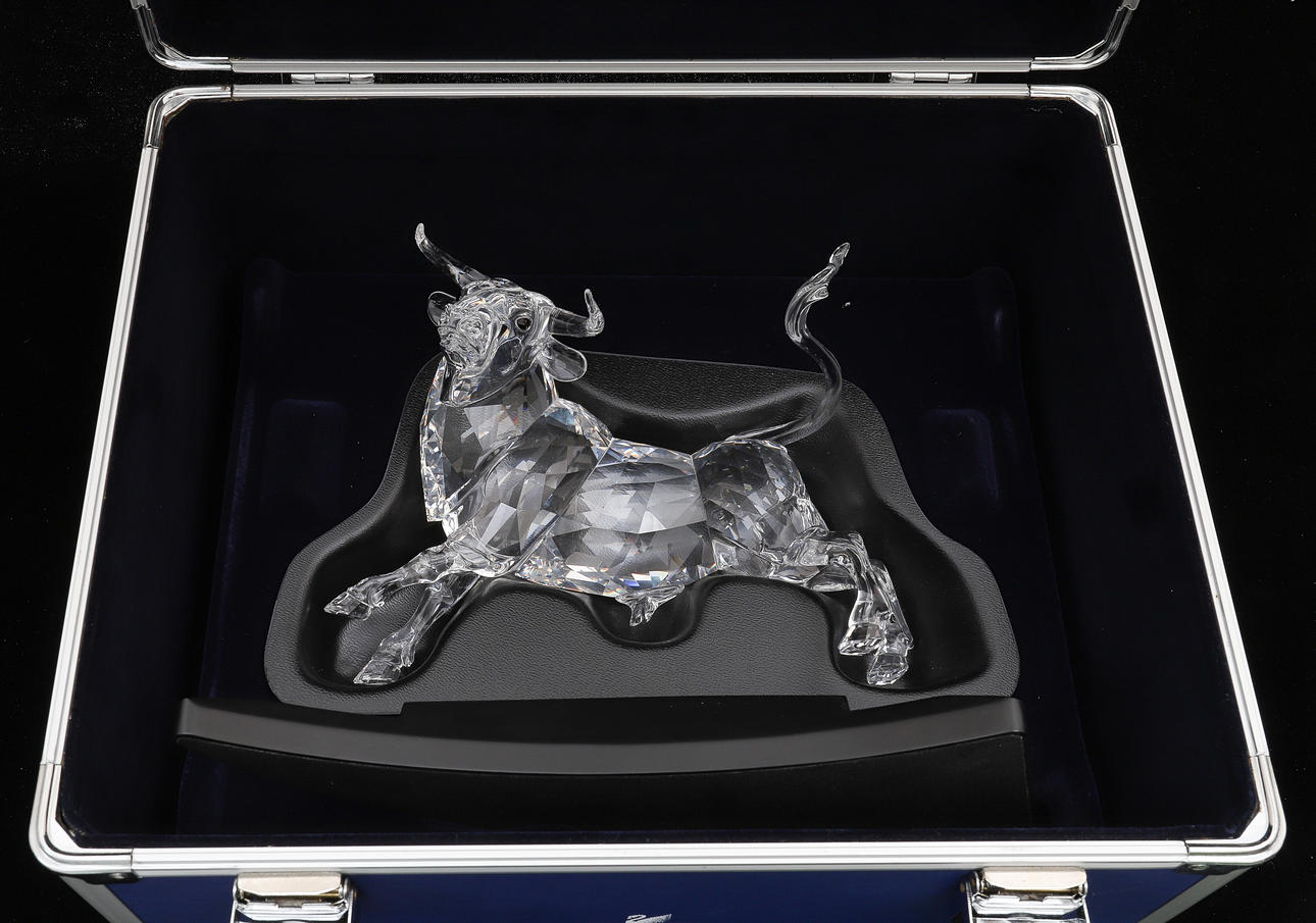 Nummer 628483, limitierte Auflage 07770/10.000 Designer Adi Stocker, der Stier in klarem, facettiertem Kristall, mit schwarz/roten Augen, zusammen mit einem schwarzen Ständer, mit Spiegeln an beiden Seiten, signiert, mit einem gerahmten Zertifikat, alles im Original enthalten abschließbare Hartschalenbox mit Tragegriff nach oben, mit Schlüsseln.