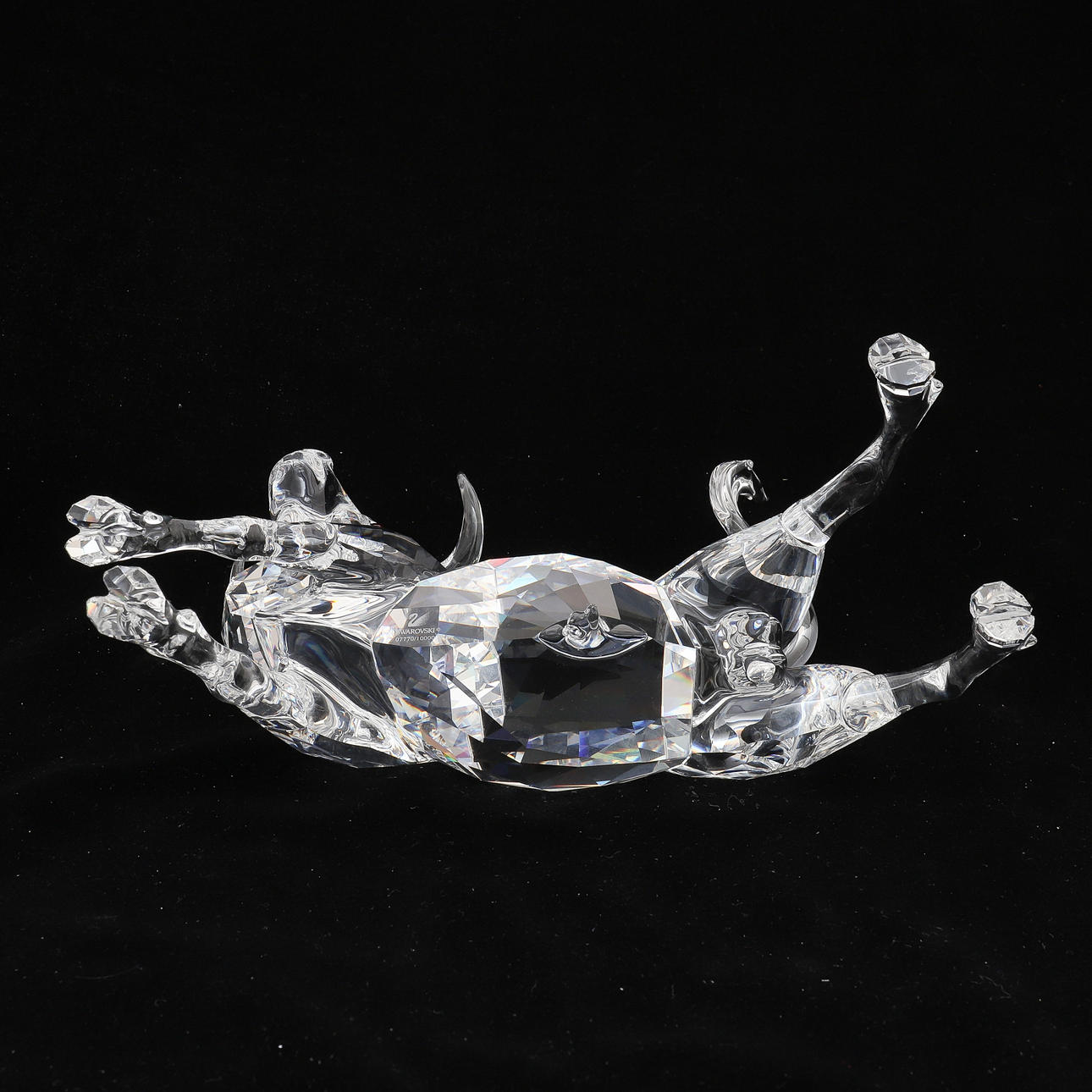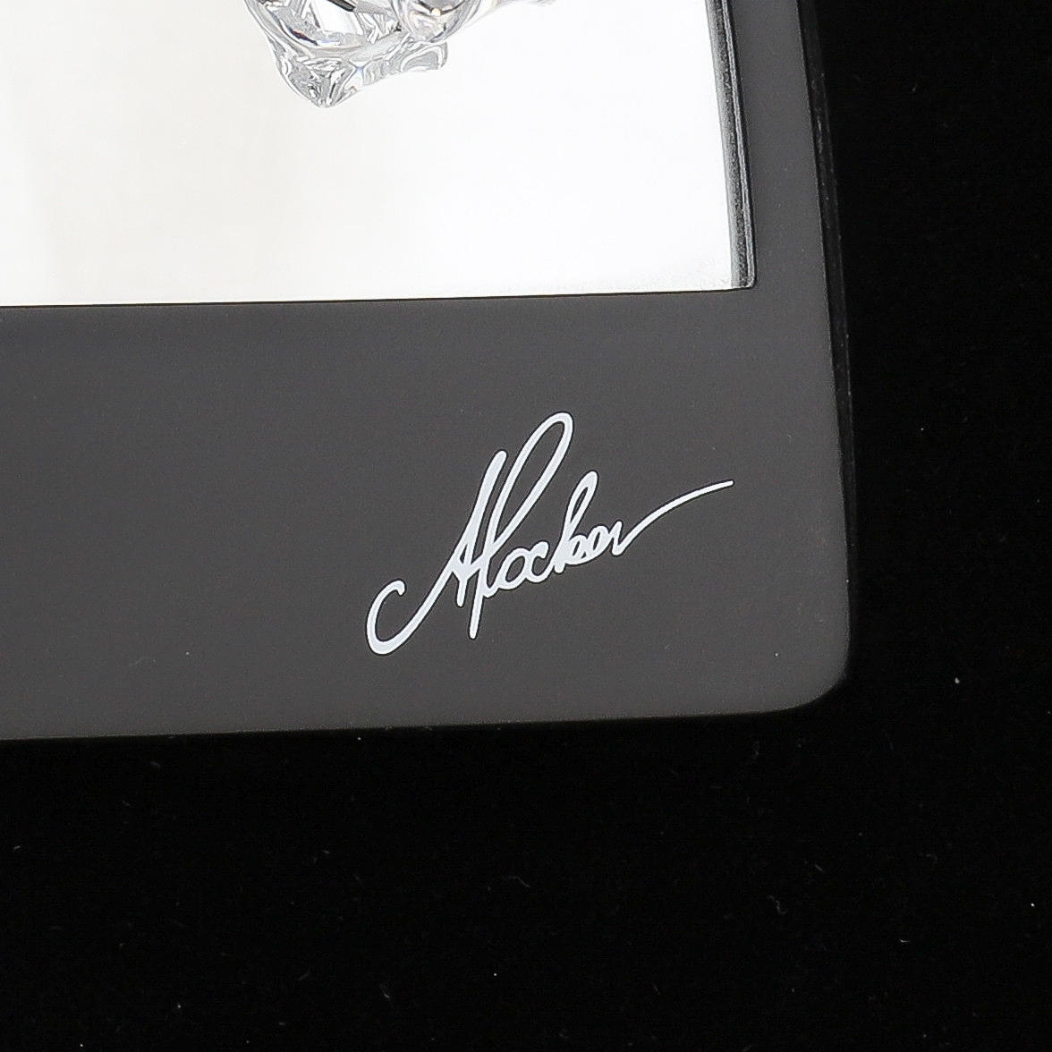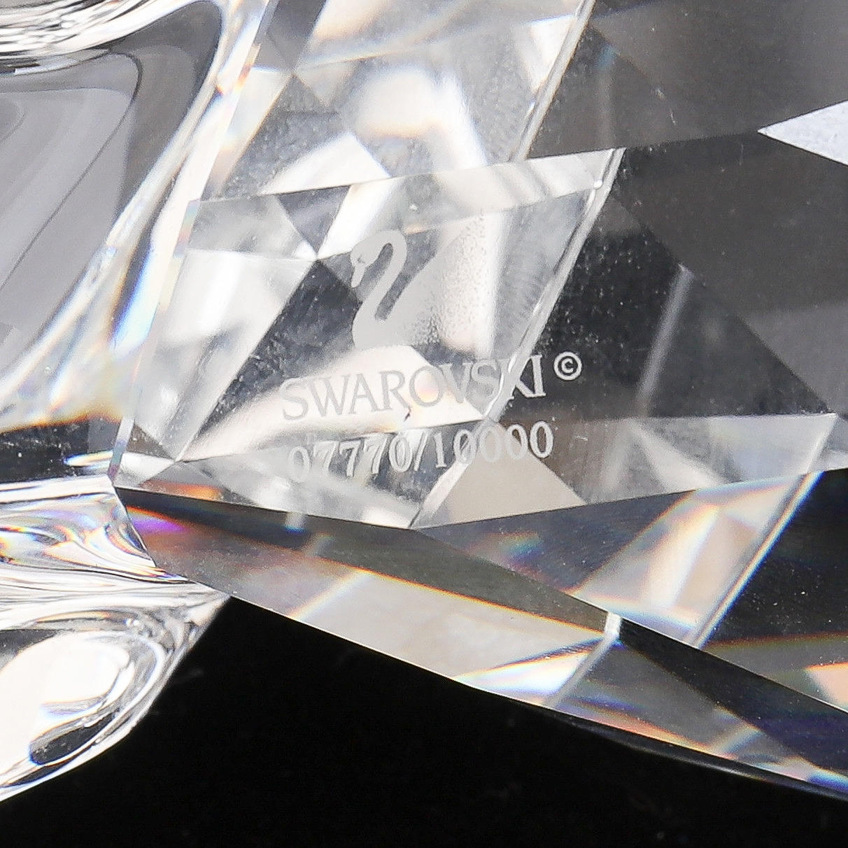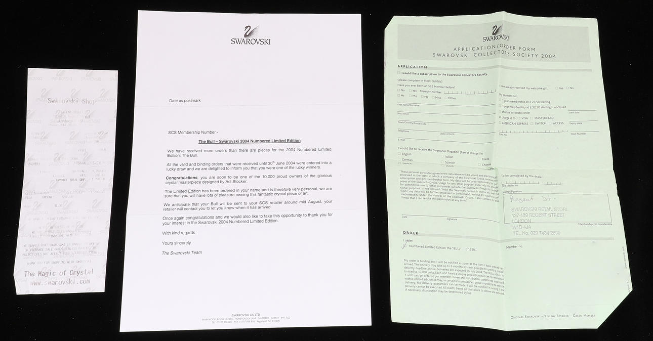 Nummer 628483, limitierte Auflage 07770/10.000 Designer Adi Stocker, der Stier in klarem, facettiertem Kristall, mit schwarz/roten Augen, zusammen mit einem schwarzen Ständer, mit Spiegeln an beiden Seiten, signiert, mit einem gerahmten Zertifikat, alles im Original enthalten abschließbare Hartschalenbox mit Tragegriff nach oben, mit Schlüsseln.