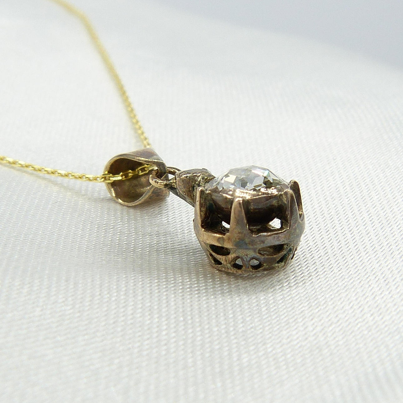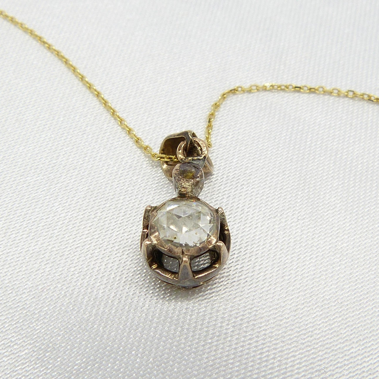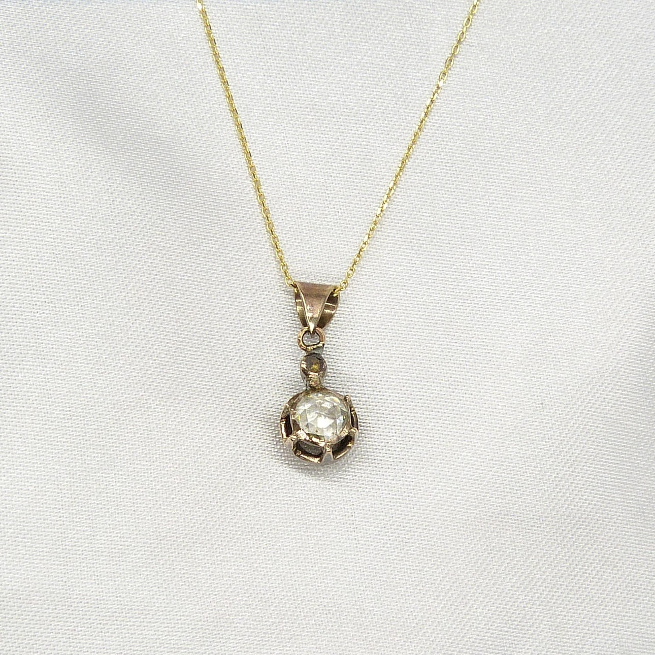 Der Vintage-Eastern-Anhänger ist mit einer Lünette und einer Kralle besetzt und mit einem runden DIAMANT im Rosenschliff von 0,30 ct und einem kleineren DIAMANT im Ballen besetzt.