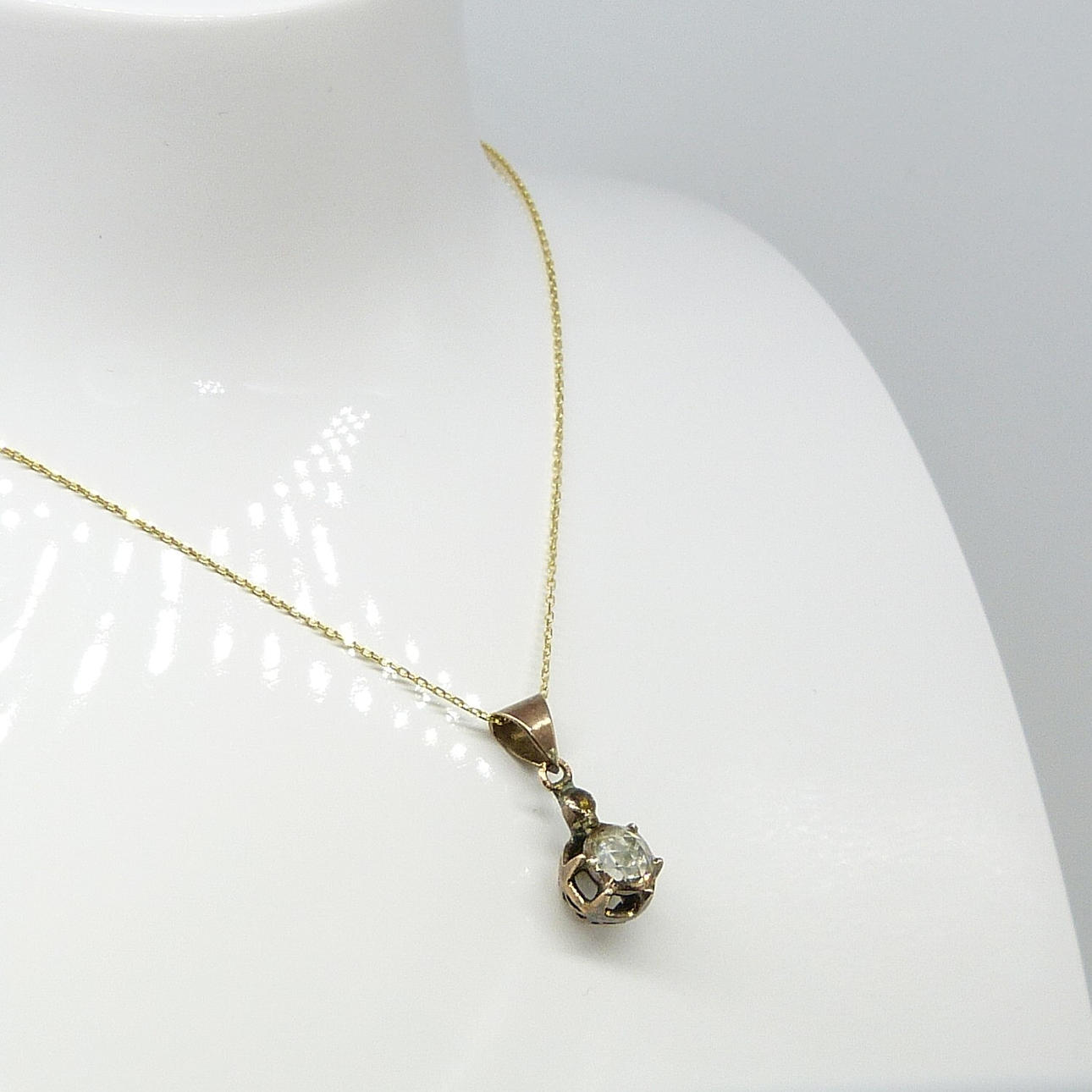 Ein handgefertigter Solitär-Anhänger mit DIAMANT im Rosenschliff von 0,30 Karat und Ankergliederkette in Gelbgold, verpackt.