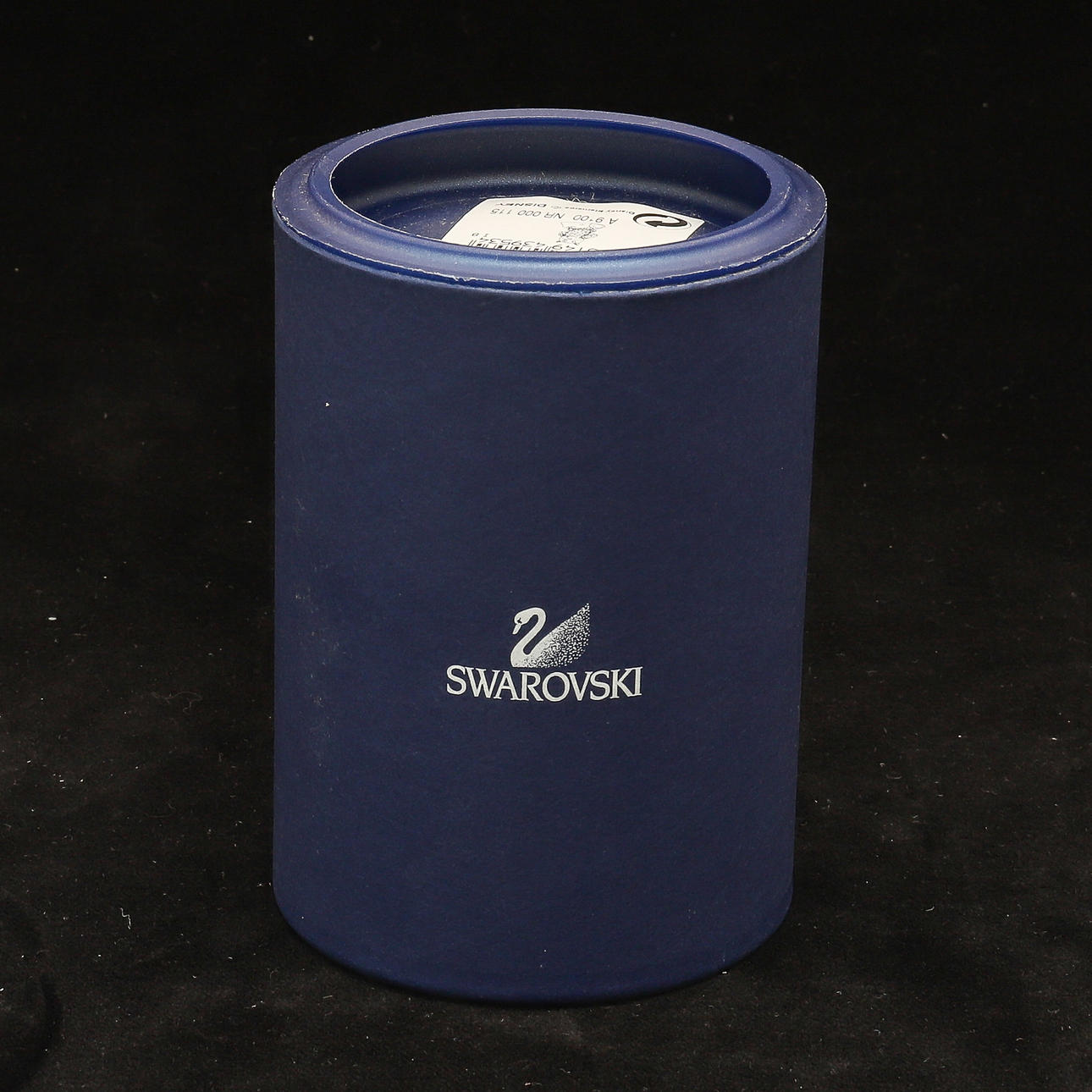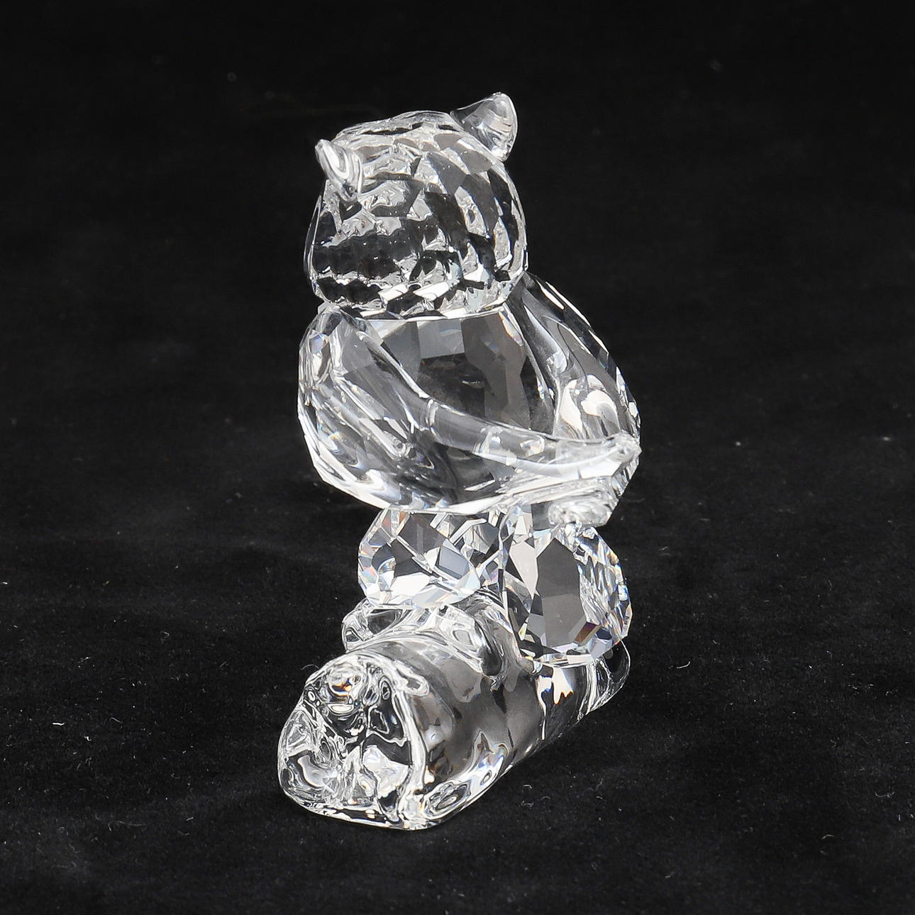 Nummer 943953, in klarem, facettiertem Kristall, mit schwarzen Augen und gefrostetem Bart, sitzt auf einem unfacettierten Baumstamm, 6 cm hoch, in Originalverpackung.