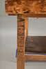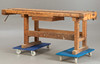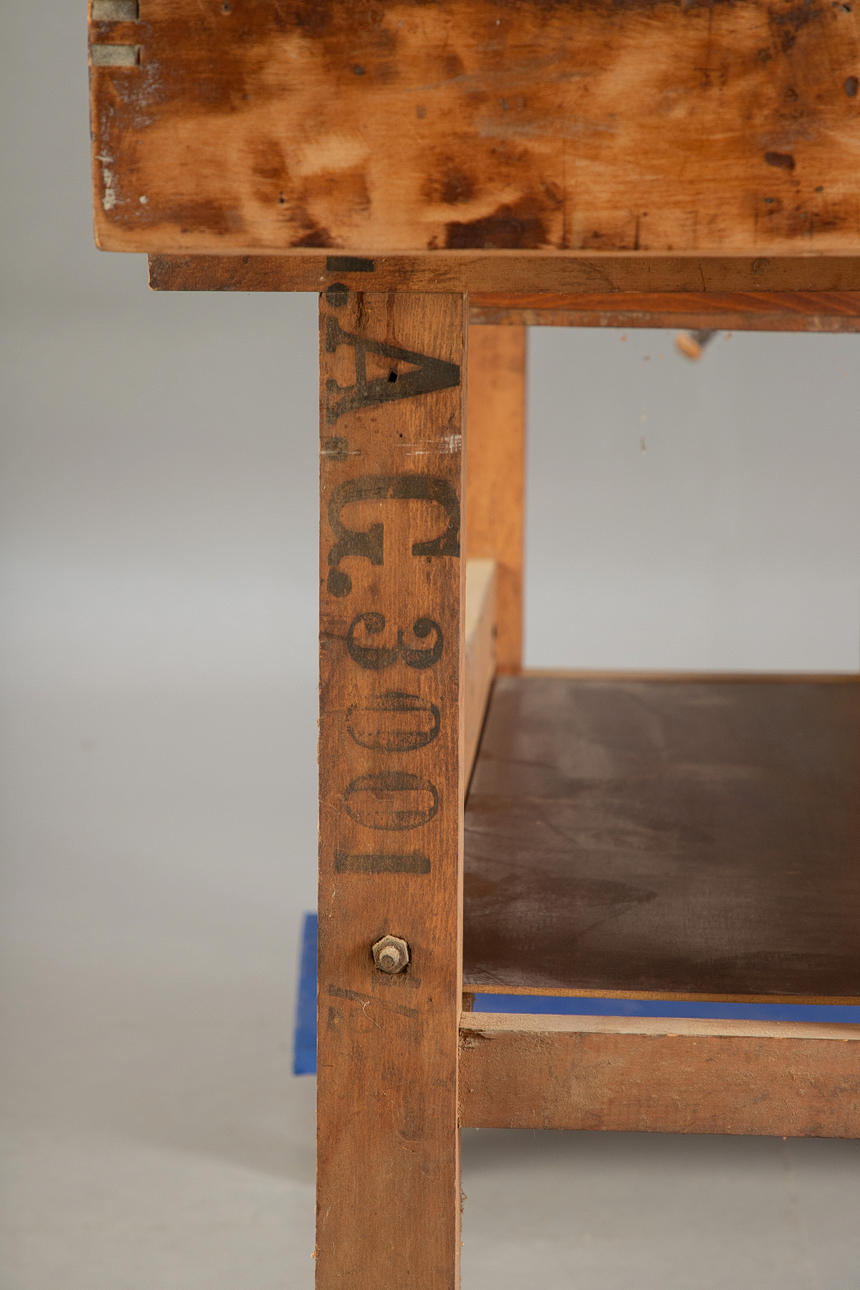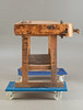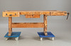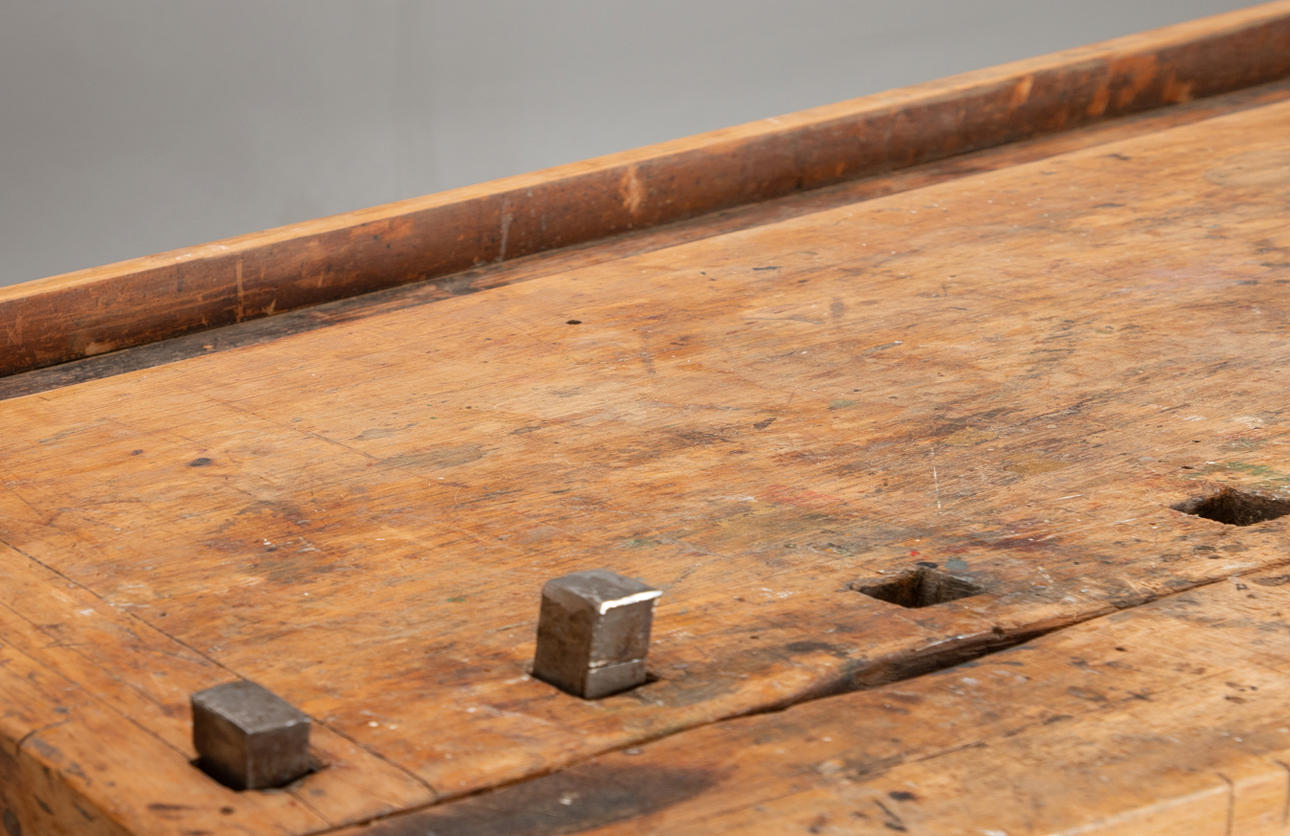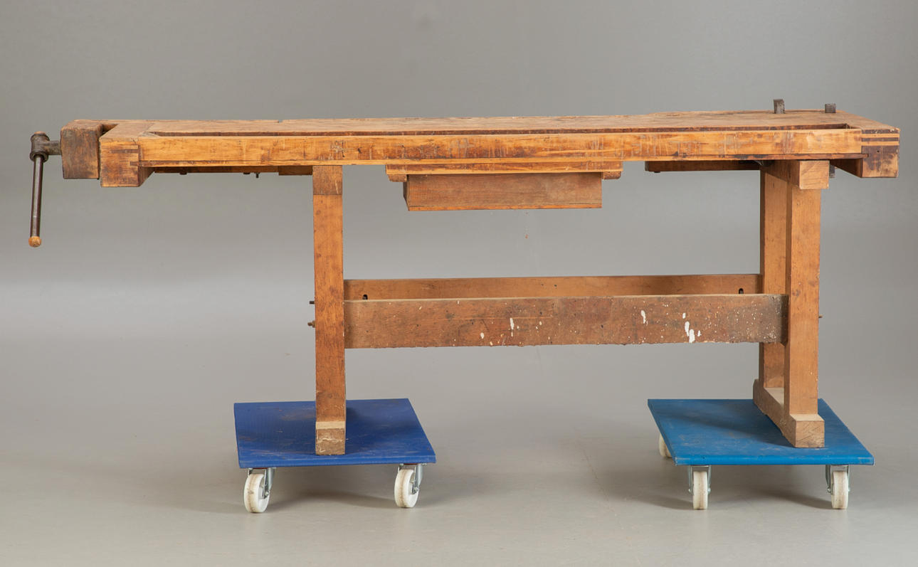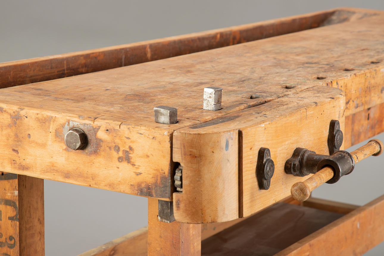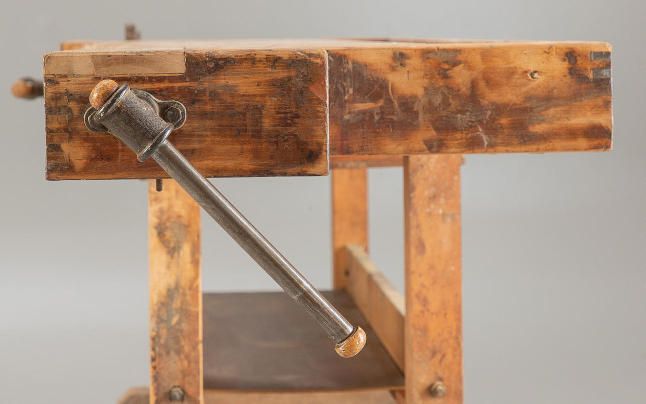 Hobelbank aus den Jahren um die Jahrhundertwende Anfang des 20. Jh. Hartholzgestell in Kufenform. Ausgestattet mit 2 Spannzangen und 1 Schublade und Ablage unterhalb der Arbeitsfläche. Originale Patina.