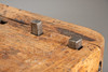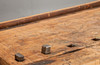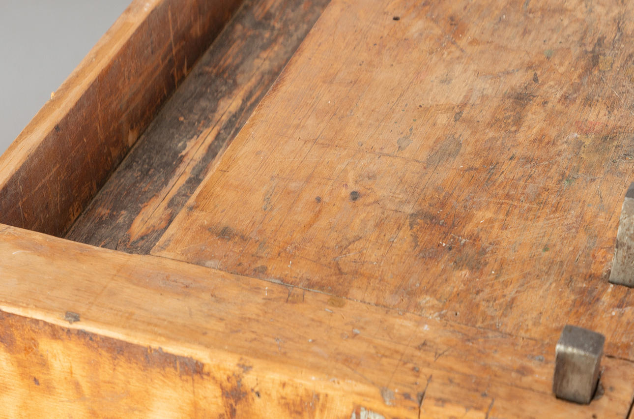 Gebrauchsspuren vorhanden. Patinert. Schloss und Schlüssel der Schublade fehlen.