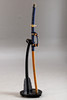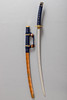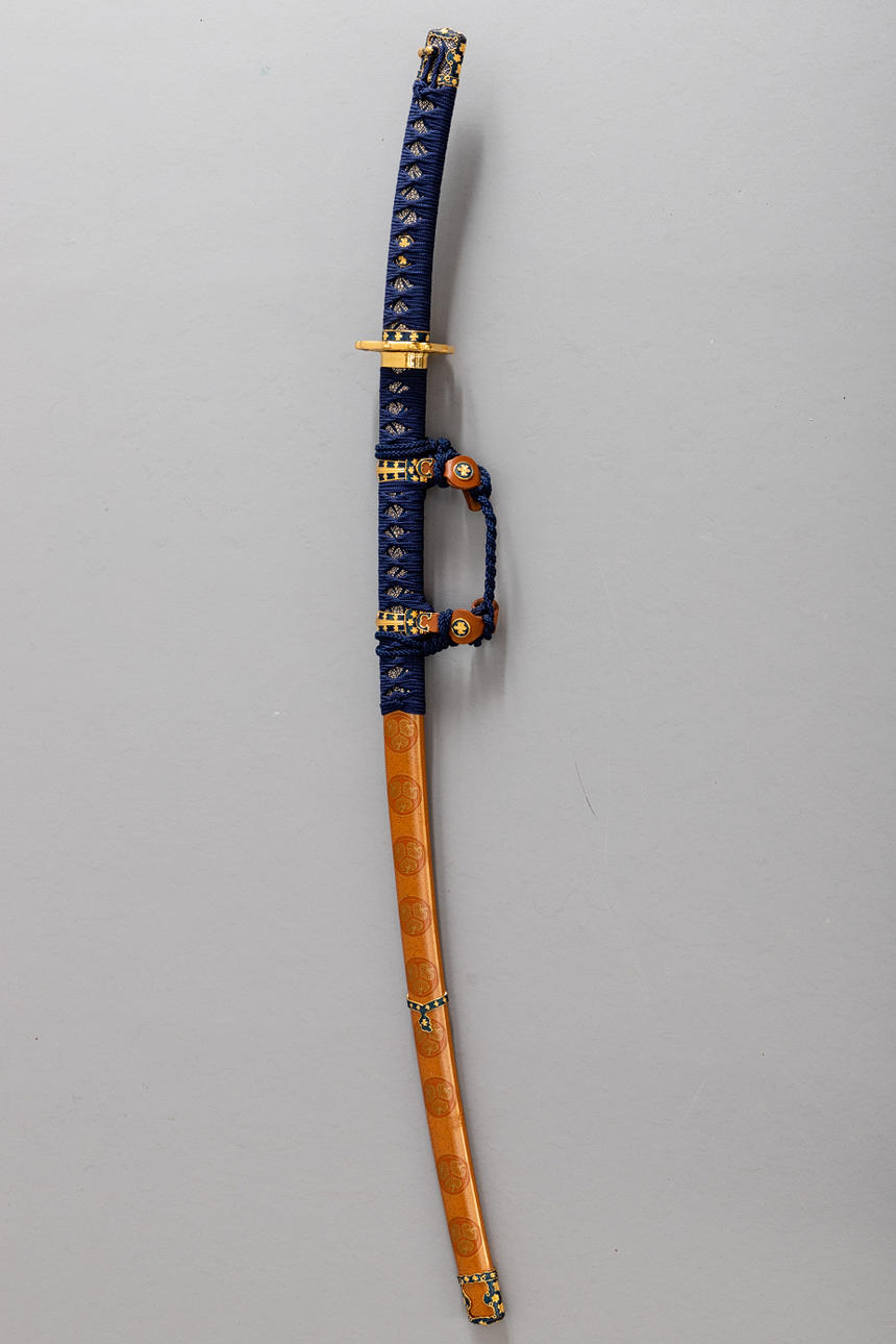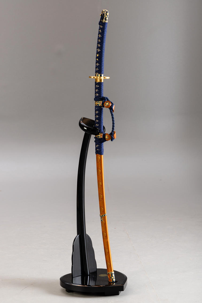 Neuwertiges Franklin Mint Samurai Schwert mit Scheide und Ständer. Das kaiserliche Schwert des Samurai. Griff mit blauer Kordel umwunden und mit Goldverzierungen geschmückt. Diese Nachbildung des Tachi Samurai-Schwertes wurde in Toledo/Spanien hergestellt. Echtheitszertifikat und Broschüre vom Hersteller vorhanden. Gesamtlänge mit Scheide ca. 105 cm. Halterständer Höhe ca. 69 cm.