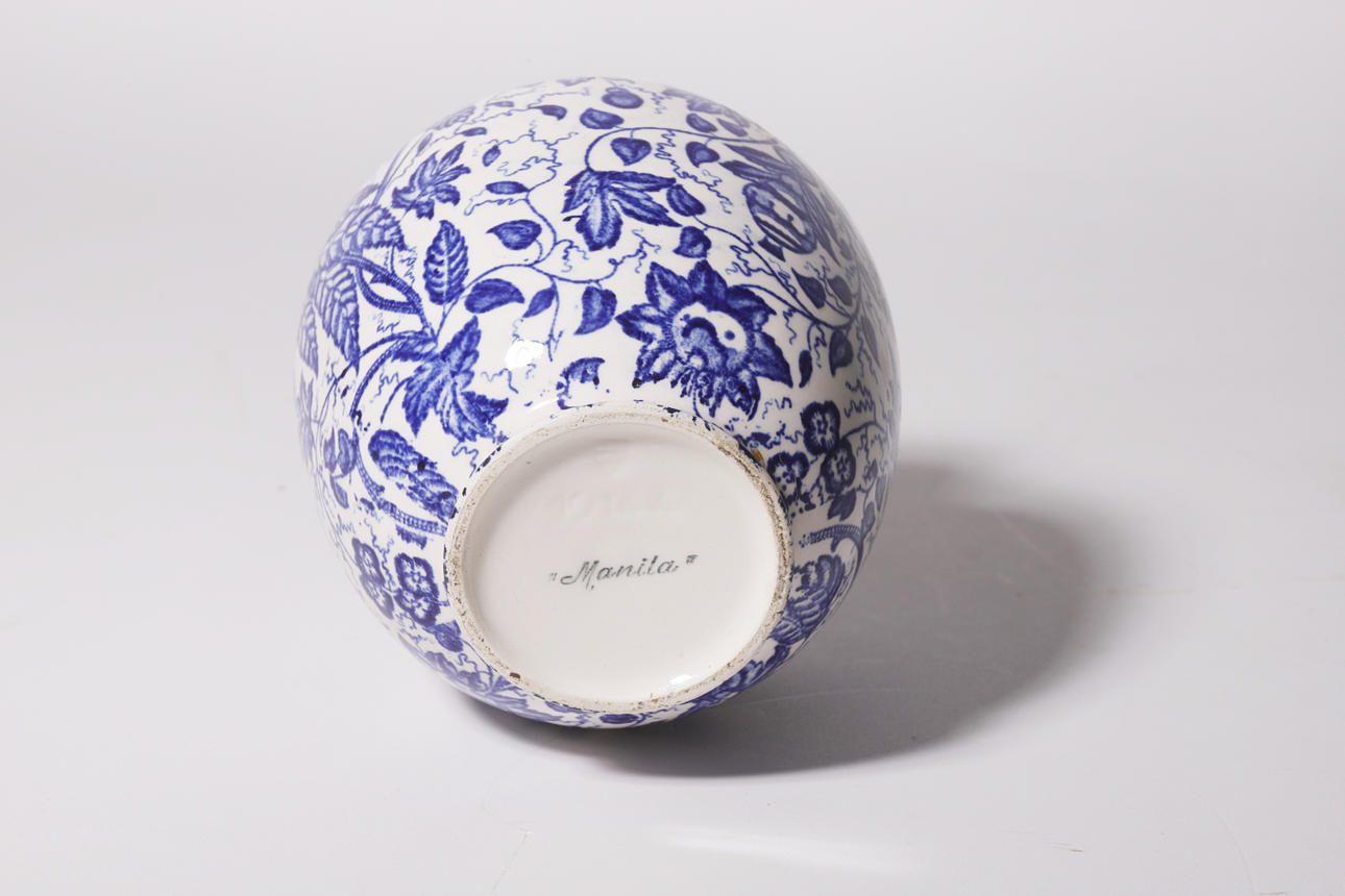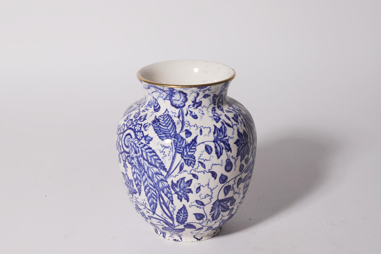 Kleine Vase aus Wiener Porzellan mit Sockel signiert "Manila" und geschnittener Marke. Blau gemusterte Blattdekoration. Goldrand.