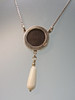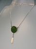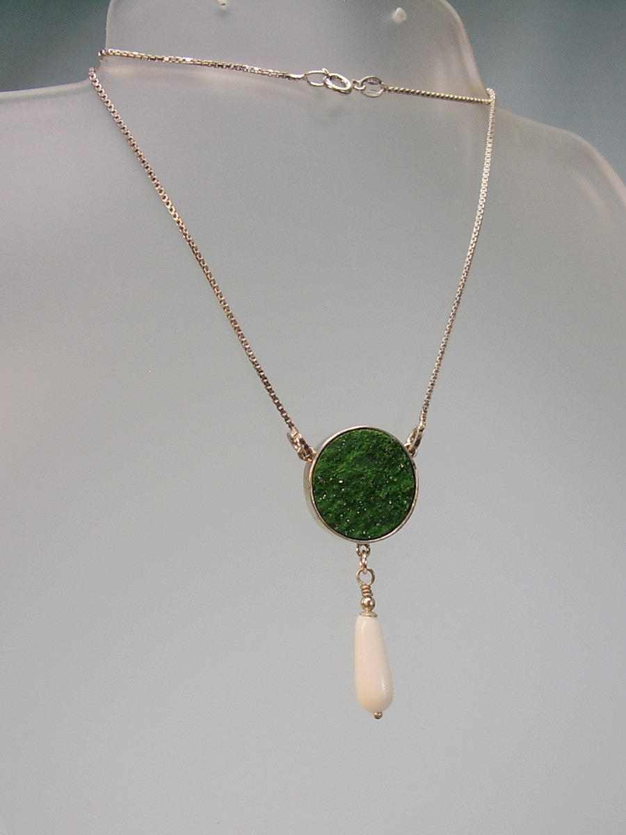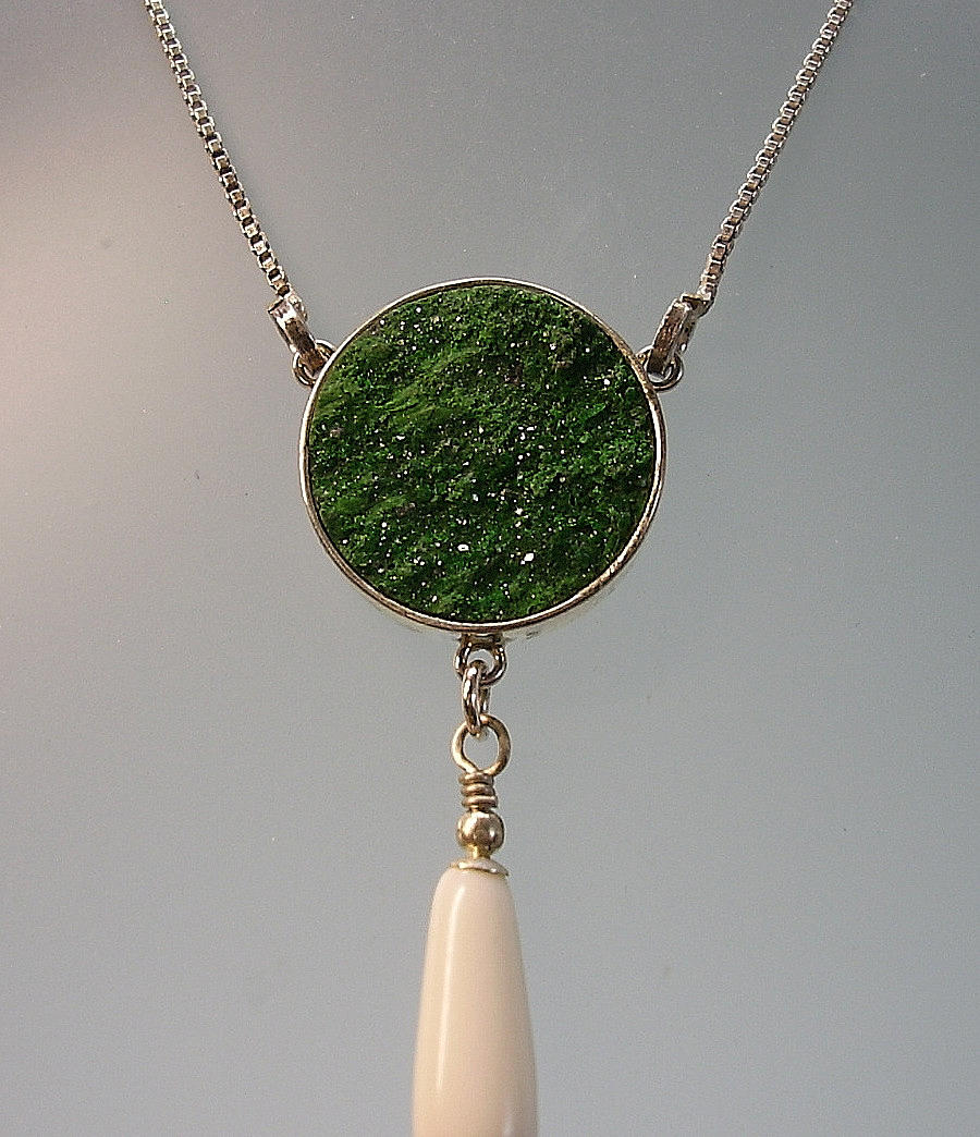 Das Designer Collier ist in Silber 835 gearbeitet und punziert. Das runde Mittelteil ist besetzt mit einem glatt gefassten Uwarovit / Uvarovite mit natürlicher Strukur in handgearbeiteter Fassung. Daran ist ein polierter Beintropfen beweglich abgehängt.