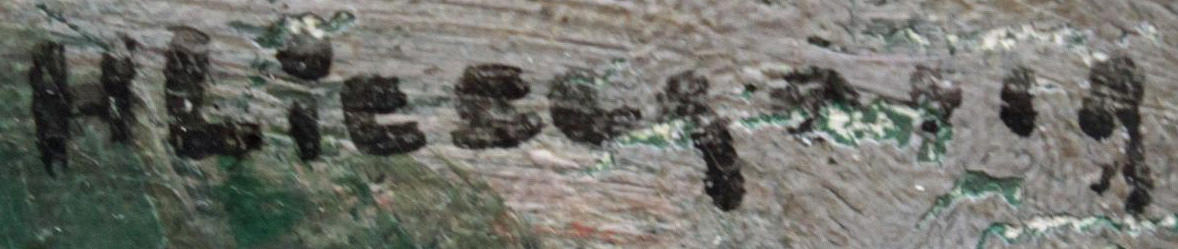 Geb. 1858 in Duisburg, gest. 1945 in Düsseldorf, deutscher Landschaftsmaler der Düsseldorfer Schule. Öl auf Leinwand, u. li. sig. H. Liesegang. „Bauern bei der Arbeit“, Darstellung von arbeitenden Bauern an einem Kanal mit Schiff und Kate, im Hintergrund eine Mühle. Maße: 34 x 44 cm. Rahmen.