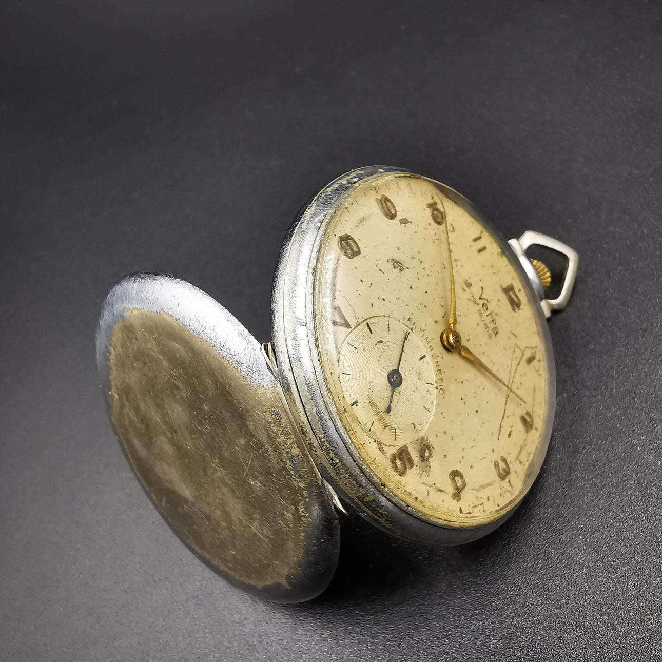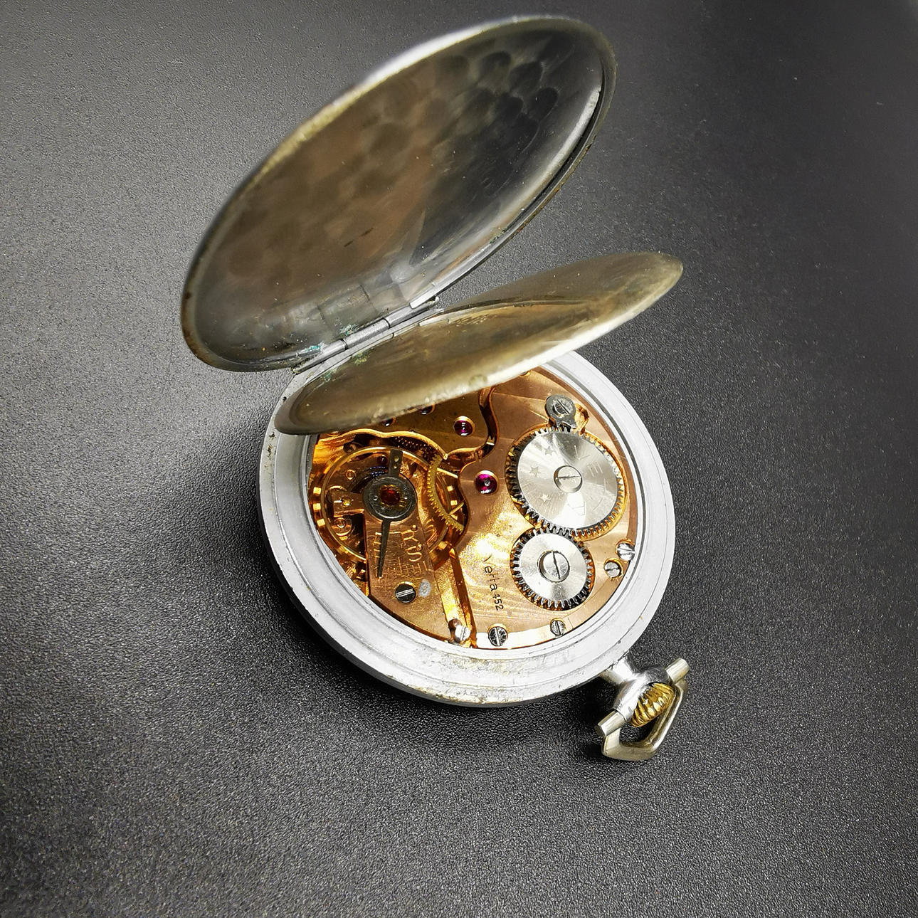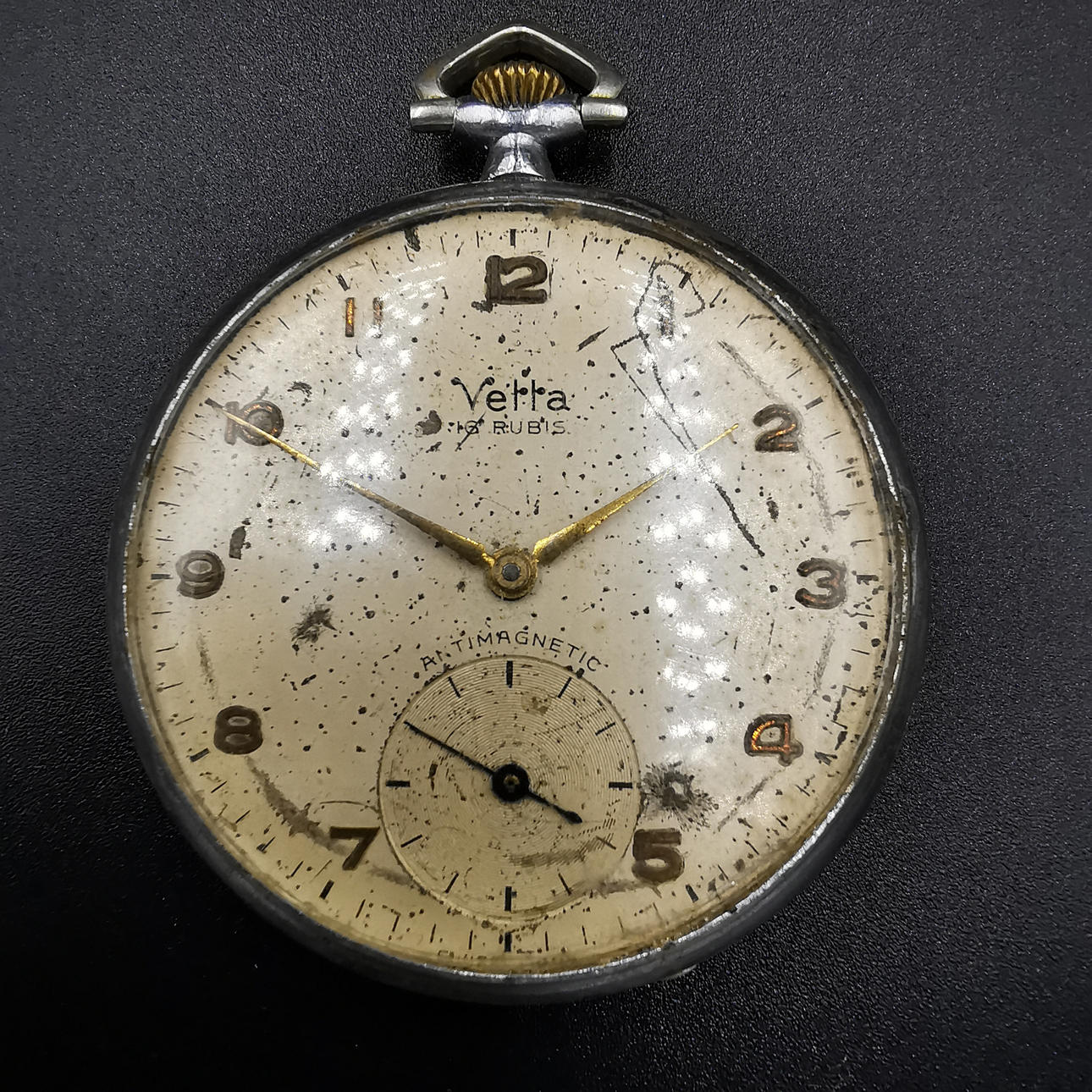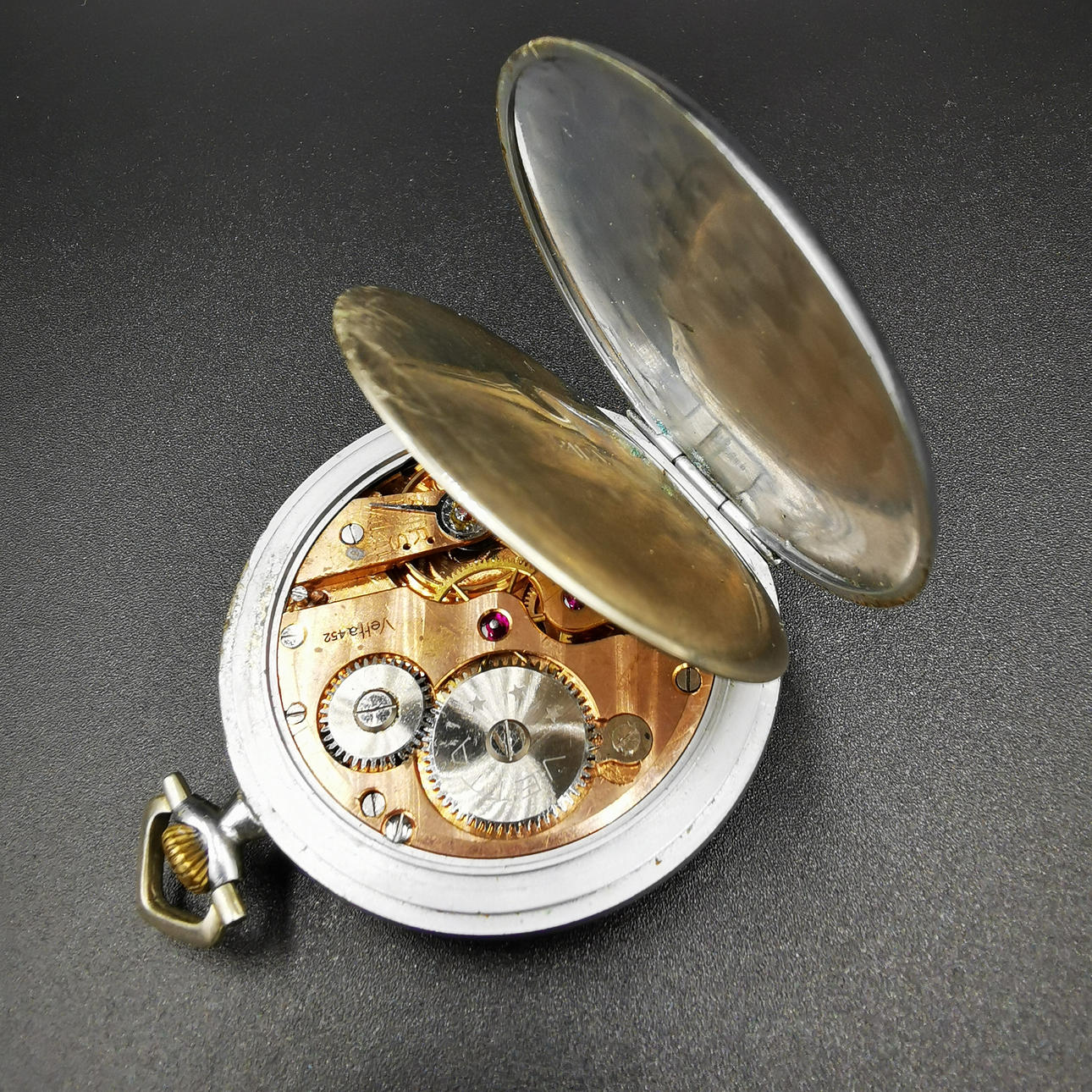 Die erste Taschenuhr ist eine Vetta-Uhr, die auf dem Zifferblatt aufgedruckt ist, gefolgt von „16 Rubis“, was übersetzt „16 Juwelen“ bedeutet. Wir haben auch „Anti Magnetic“ direkt über der Sekundenanzeige aufgedruckt. Das Wort Vetta ist in die Rückplatte eingraviert und neben „452“ auch in die Mechplatte eingraviert. Die Uhr hat mehrere altersbedingte Markierungen, die ihren Charme noch verstärken.