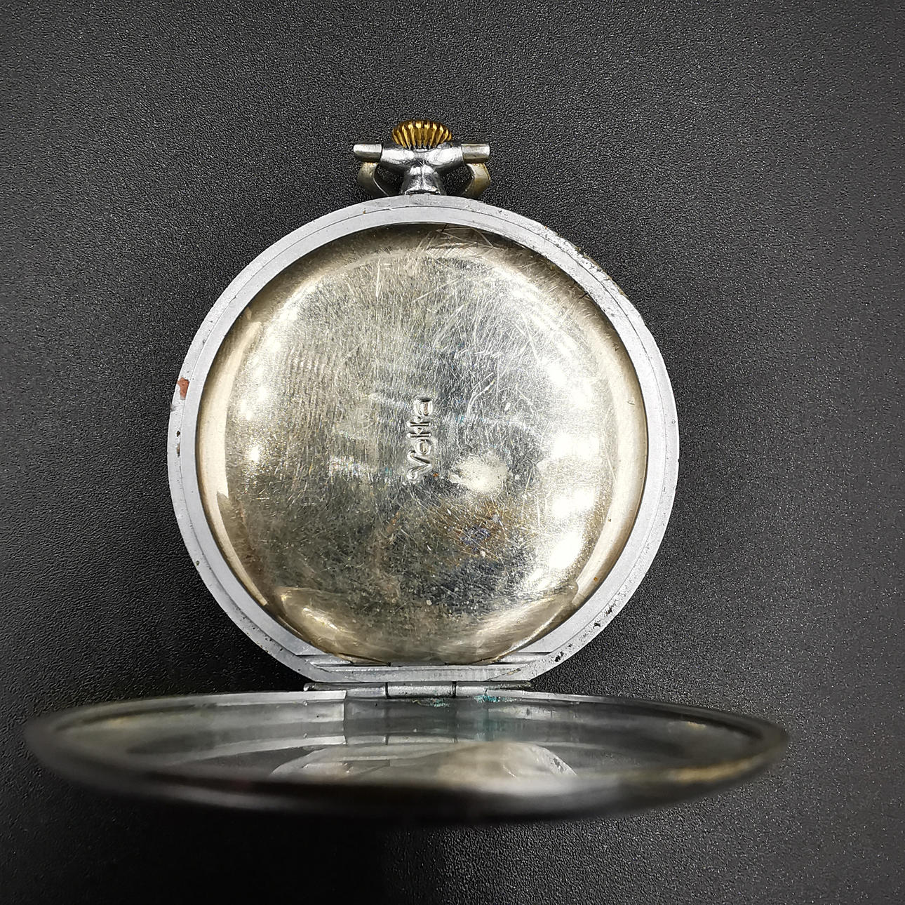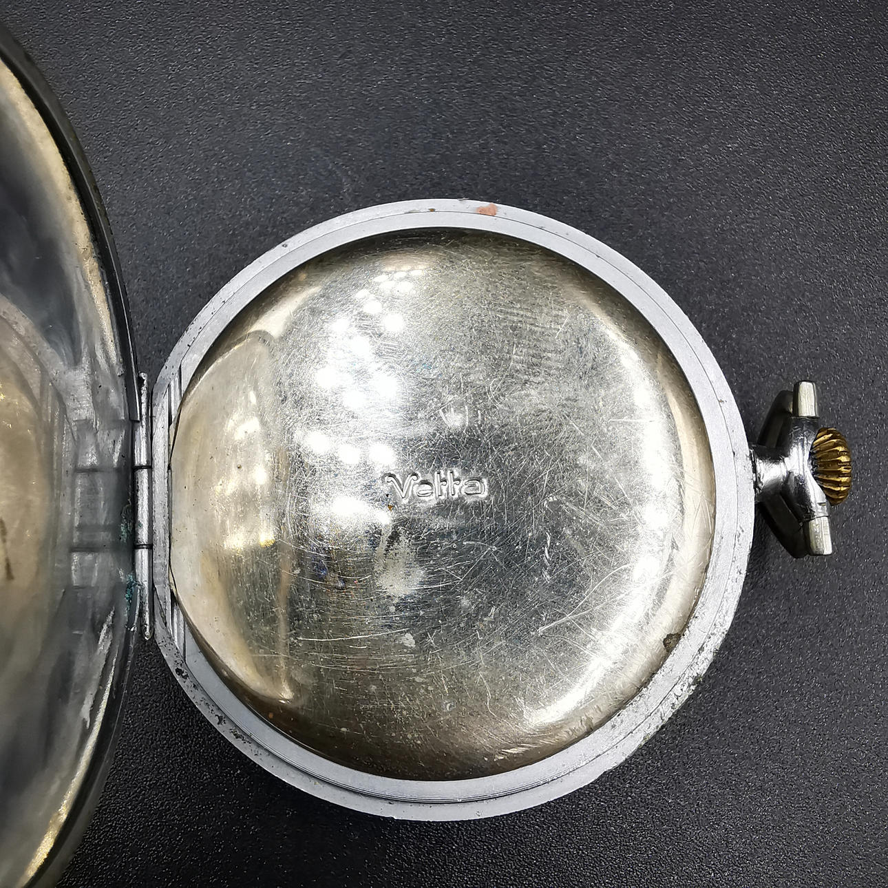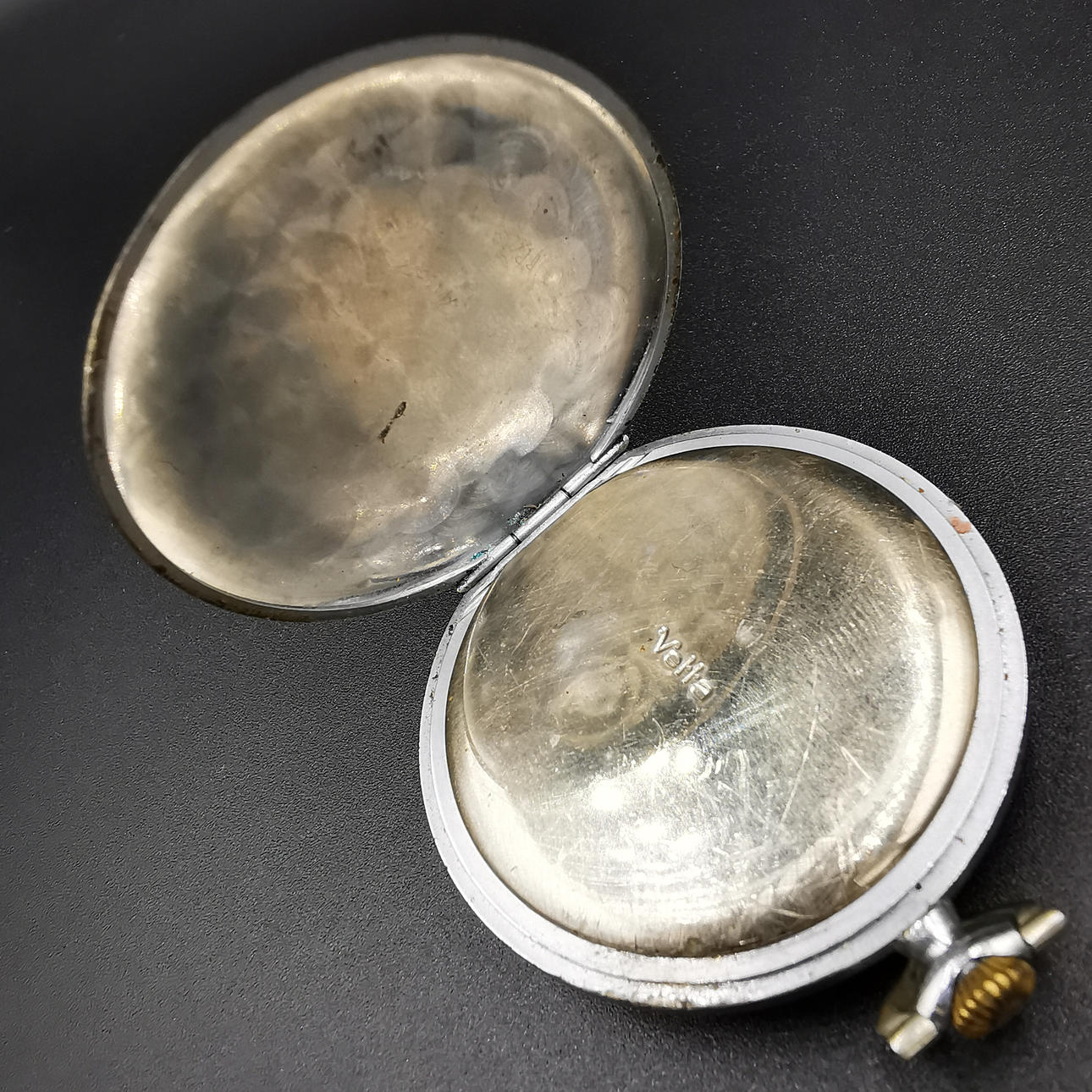 Die erste Taschenuhr ist eine Vetta-Uhr, die auf dem Zifferblatt aufgedruckt ist, gefolgt von „16 Rubis“, was übersetzt „16 Juwelen“ bedeutet. Wir haben auch „Anti Magnetic“ direkt über der Sekundenanzeige aufgedruckt. Das Wort Vetta ist in die Rückplatte eingraviert und neben „452“ auch in die Mechplatte eingraviert. Die Uhr hat mehrere altersbedingte Markierungen, die ihren Charme noch verstärken.