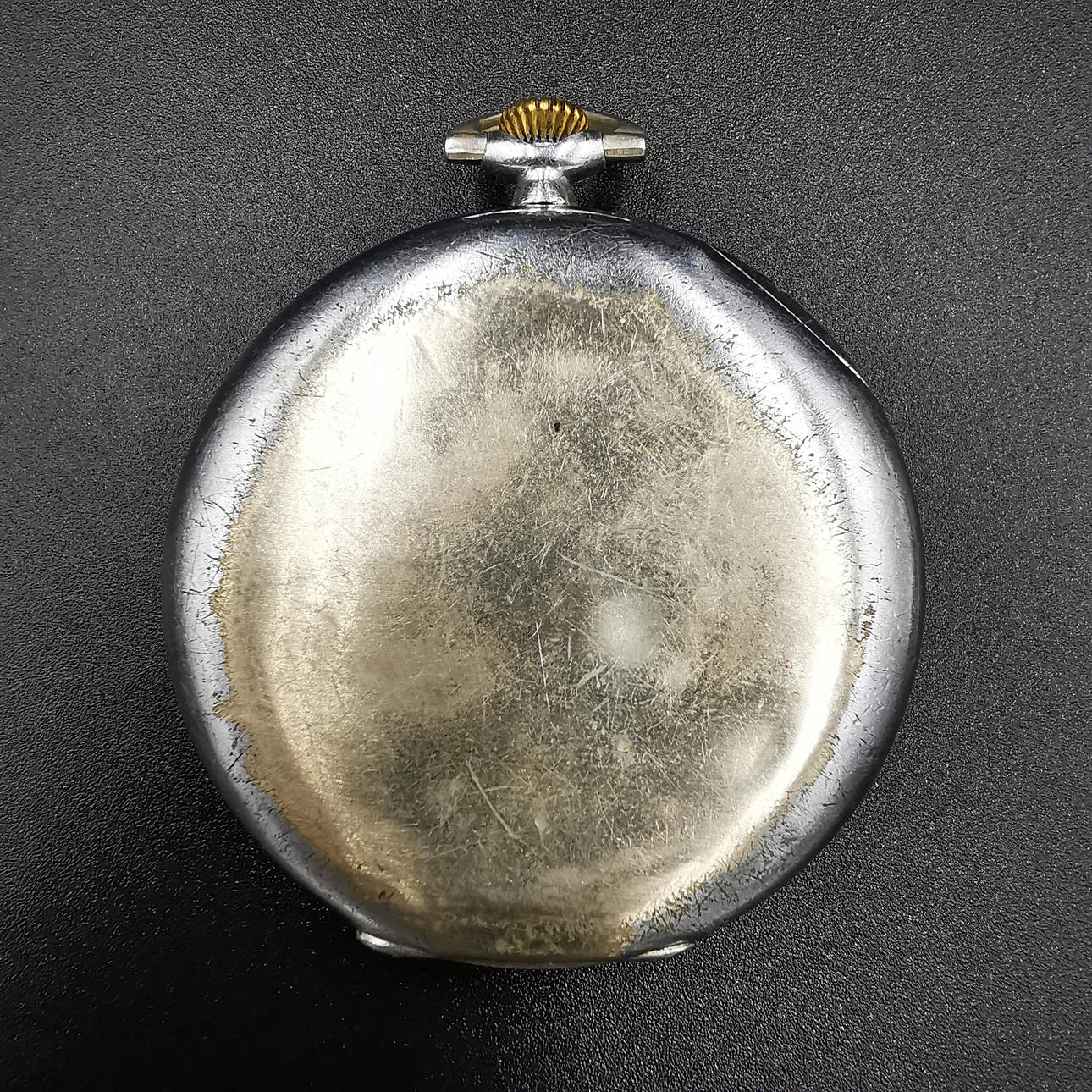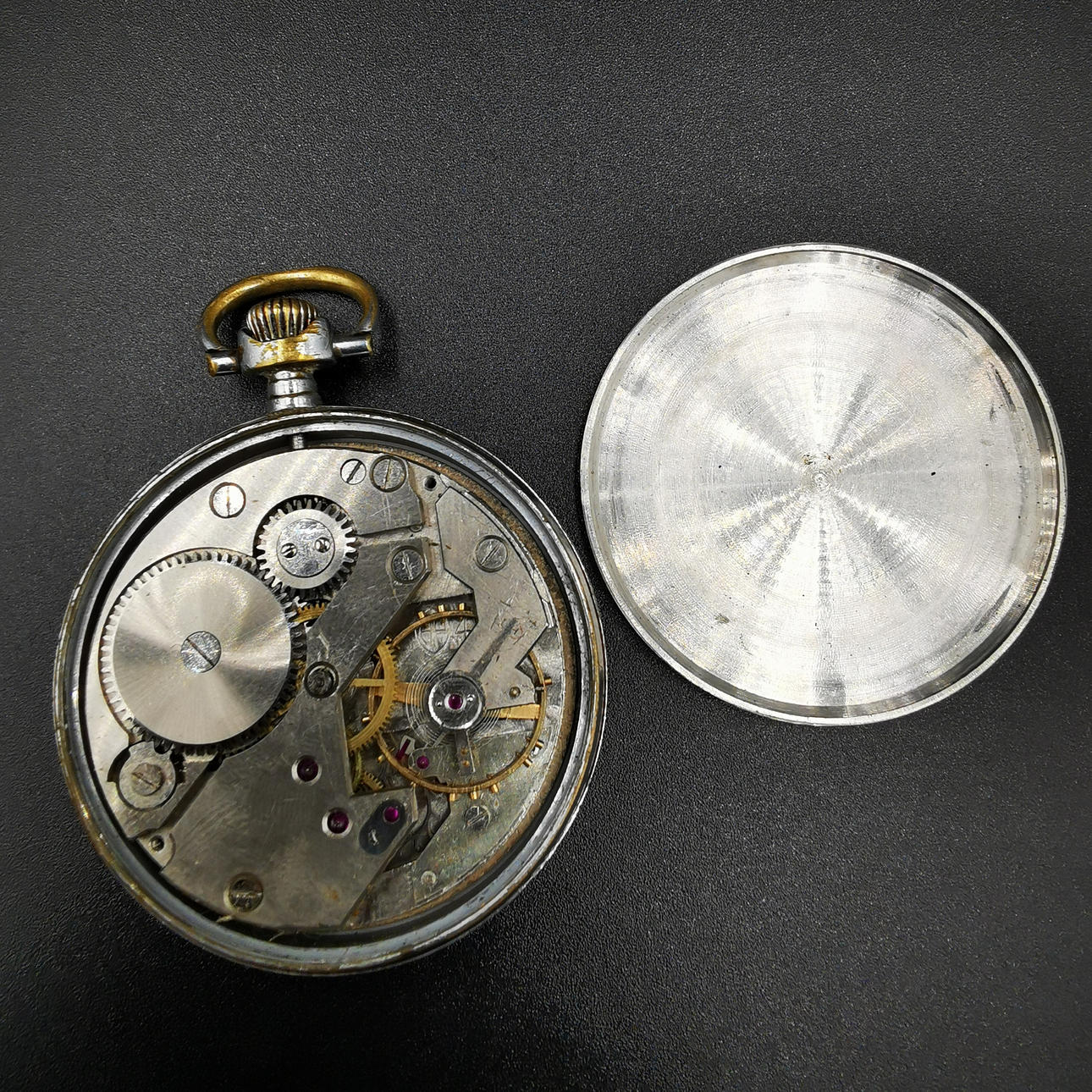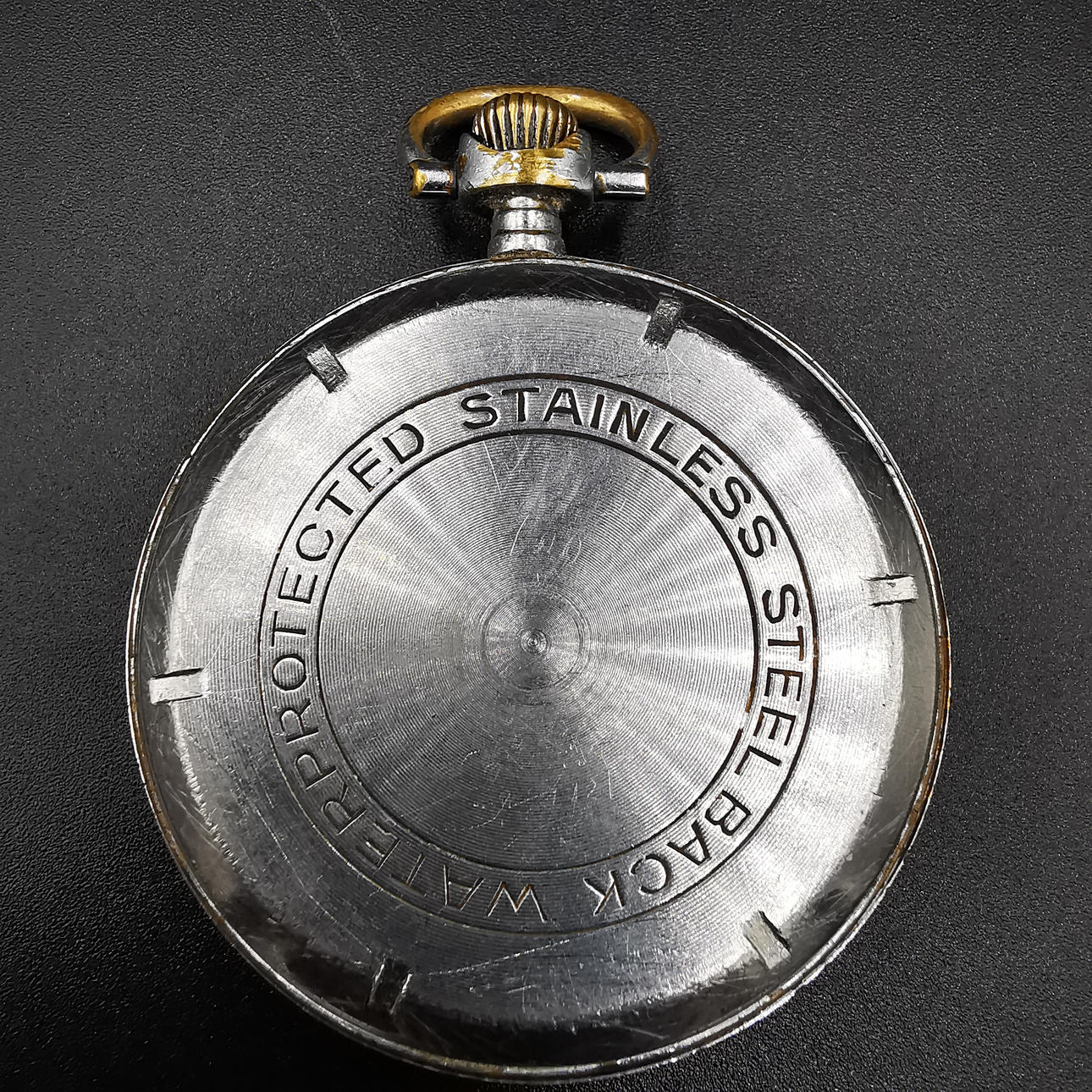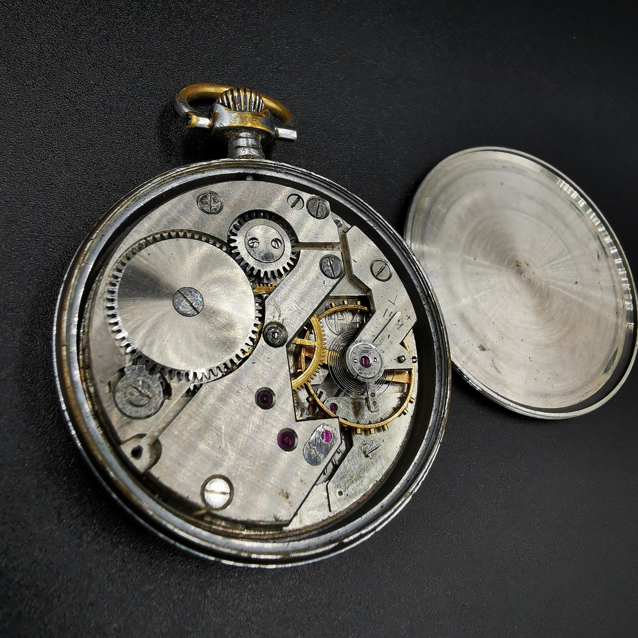 Die erste Taschenuhr ist eine Vetta-Uhr, die auf dem Zifferblatt aufgedruckt ist, gefolgt von „16 Rubis“, was übersetzt „16 Juwelen“ bedeutet. Wir haben auch „Anti Magnetic“ direkt über der Sekundenanzeige aufgedruckt. Das Wort Vetta ist in die Rückplatte eingraviert und neben „452“ auch in die Mechplatte eingraviert. Die Uhr hat mehrere altersbedingte Markierungen, die ihren Charme noch verstärken.