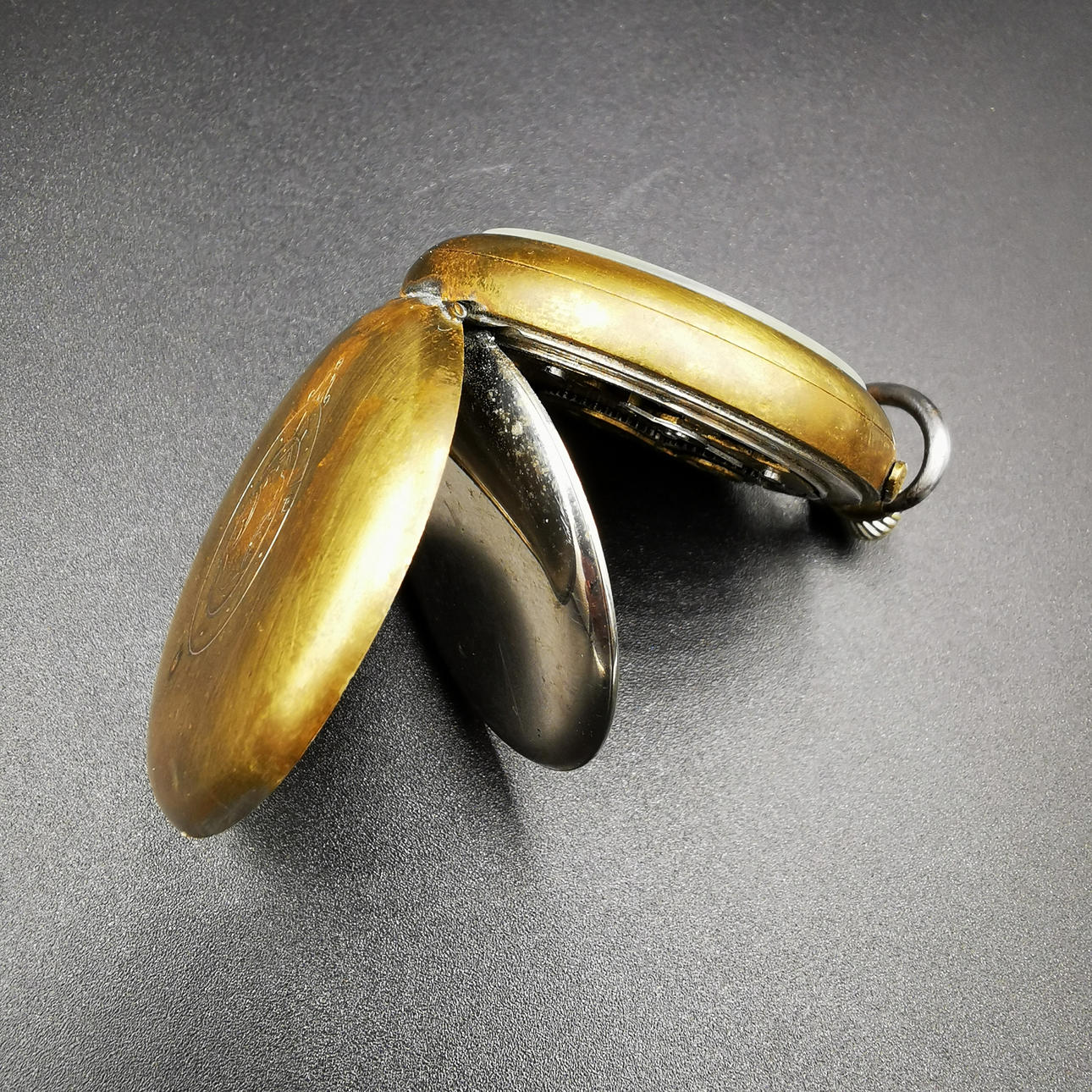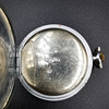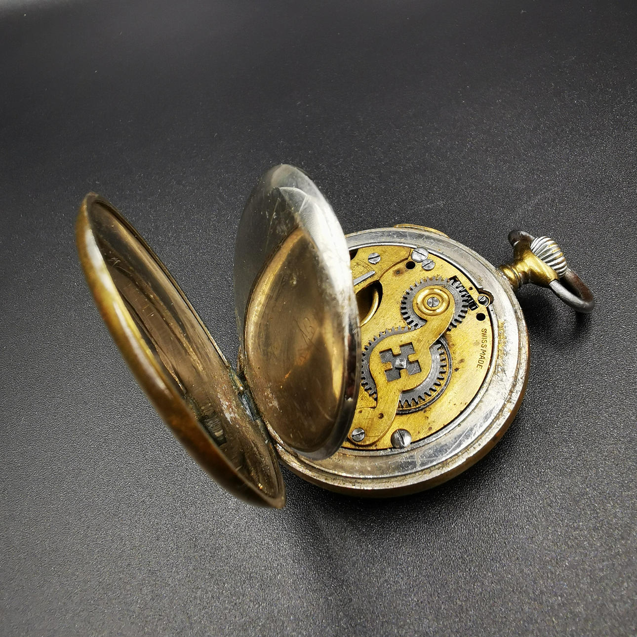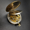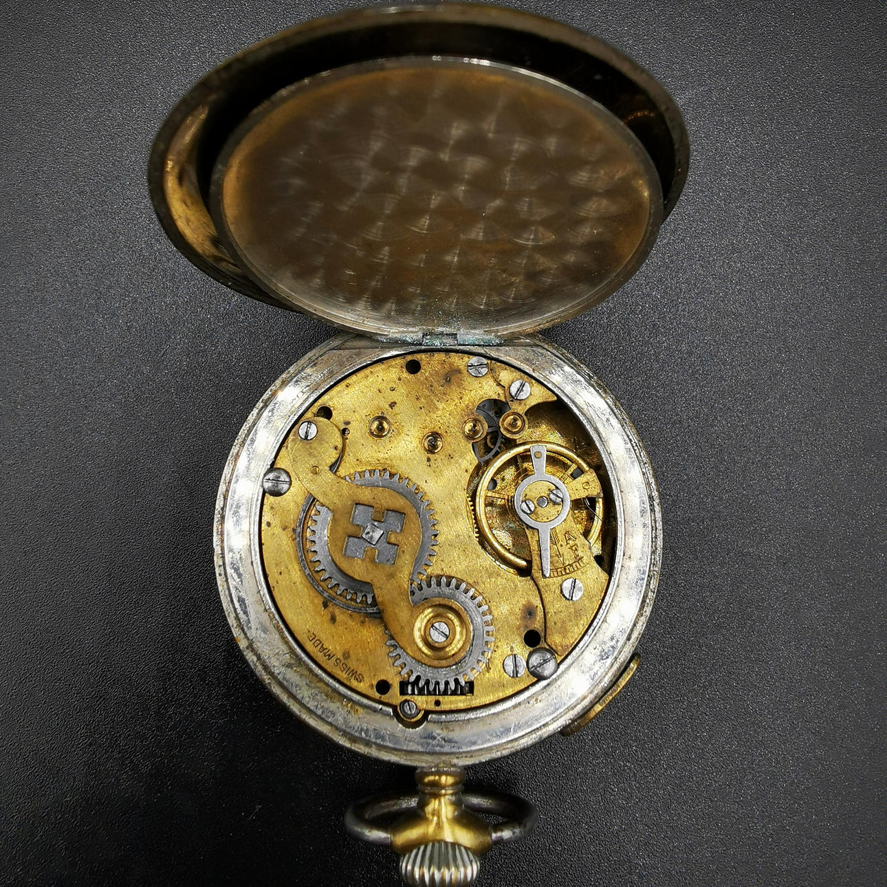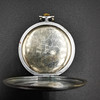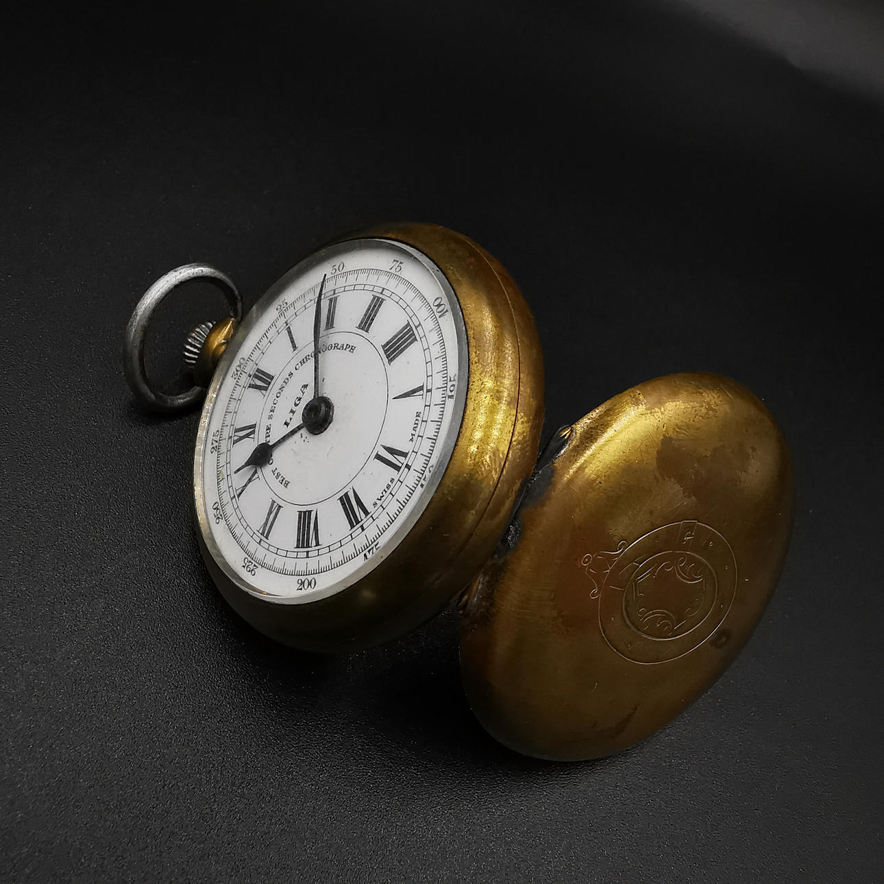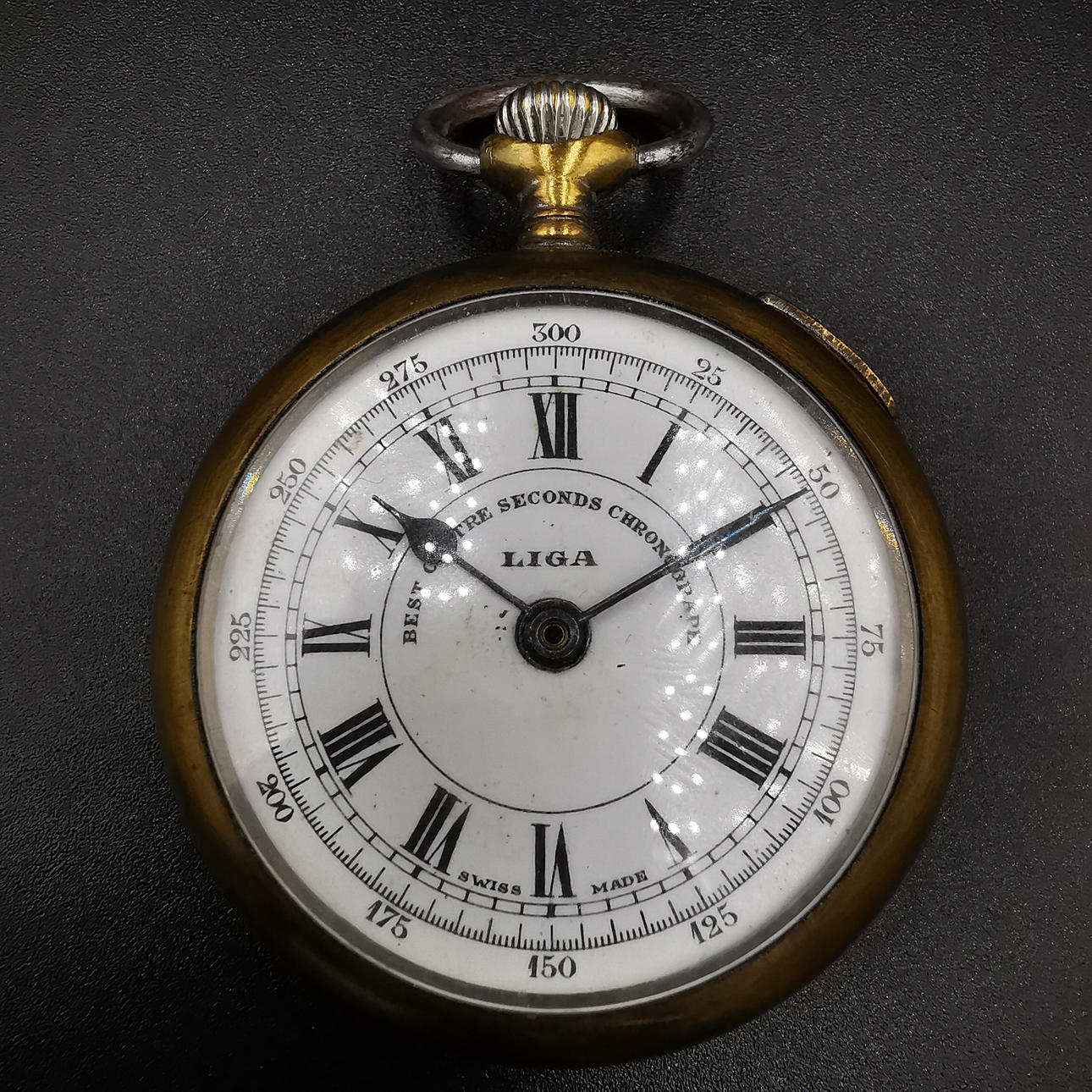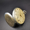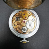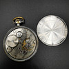 Die zweite Taschenuhr ist eine Liga-Taschenuhr, die in der Mitte des Zifferblatts bedruckt ist. Die Uhr ist mit römischen Ziffern bedruckt und unten auf dem Ziffernblatt mit „Swiss Made“ gekennzeichnet. Die Uhr hat eine große Gravur auf der Rückseite und schließt locker.