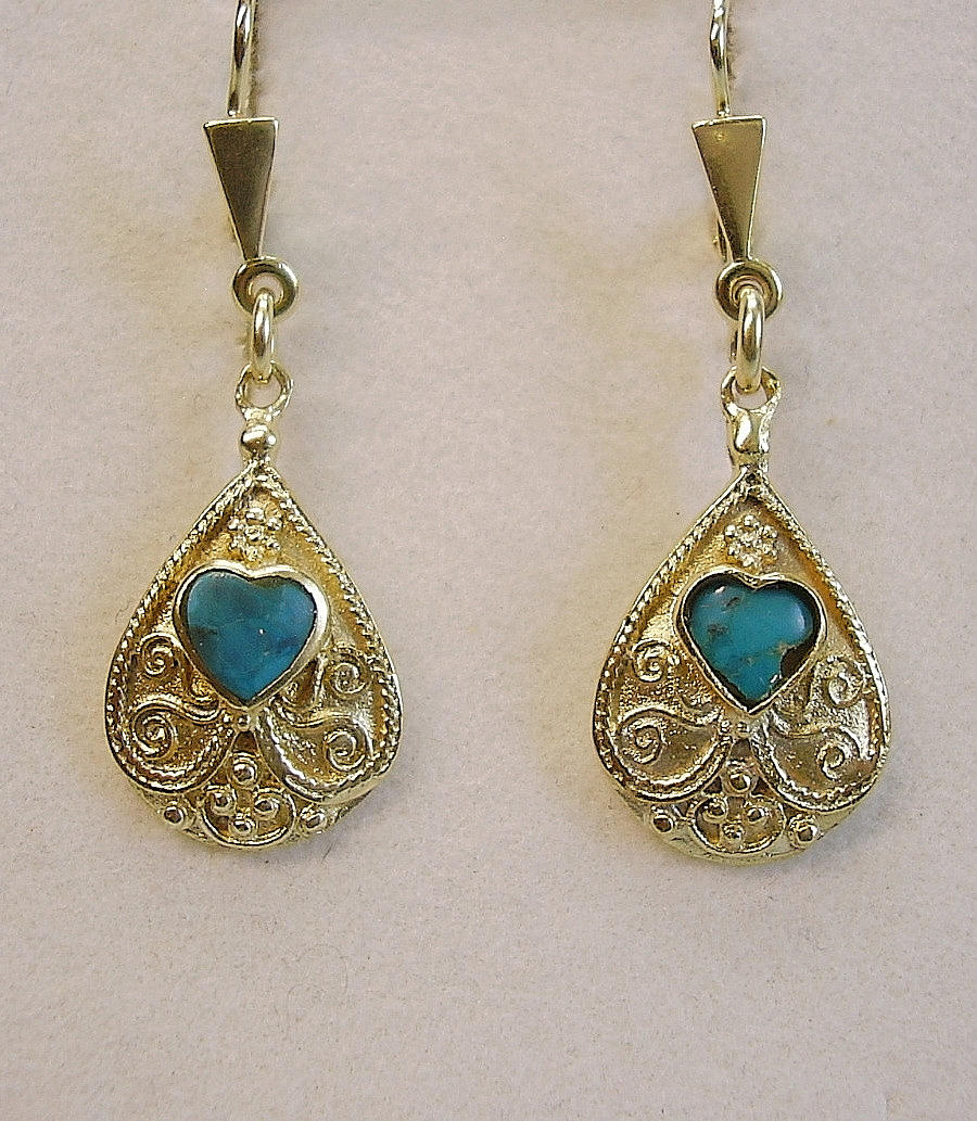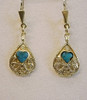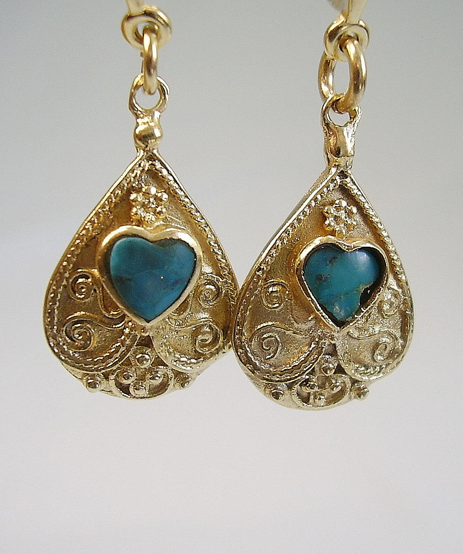 Tropfenförmige filigran verzierte Abhängungen sind mit jeweils einem Türkis-Herz besetzt.