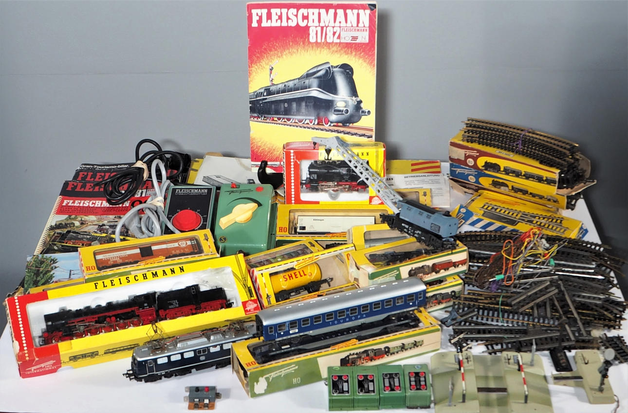 Fleischmann 50058 Fleischmann 4029 Fleischmann Holz 461024 x 2 Fleischmann Merch 1427 Fleischmann Kuhlwagen 1462 Fleischmann 1451A Fleischmann 1467 Fleischmann 5596 Fleischmann Shell H01465 Fleischmann 2 Stück + 1, 1413B Fleischmann Kran 1495 Fleischmann Lokomotive E10 134 5 Stück Zeitschriftenständer/4 Stück Transformator und Anschlüsse.