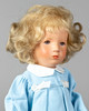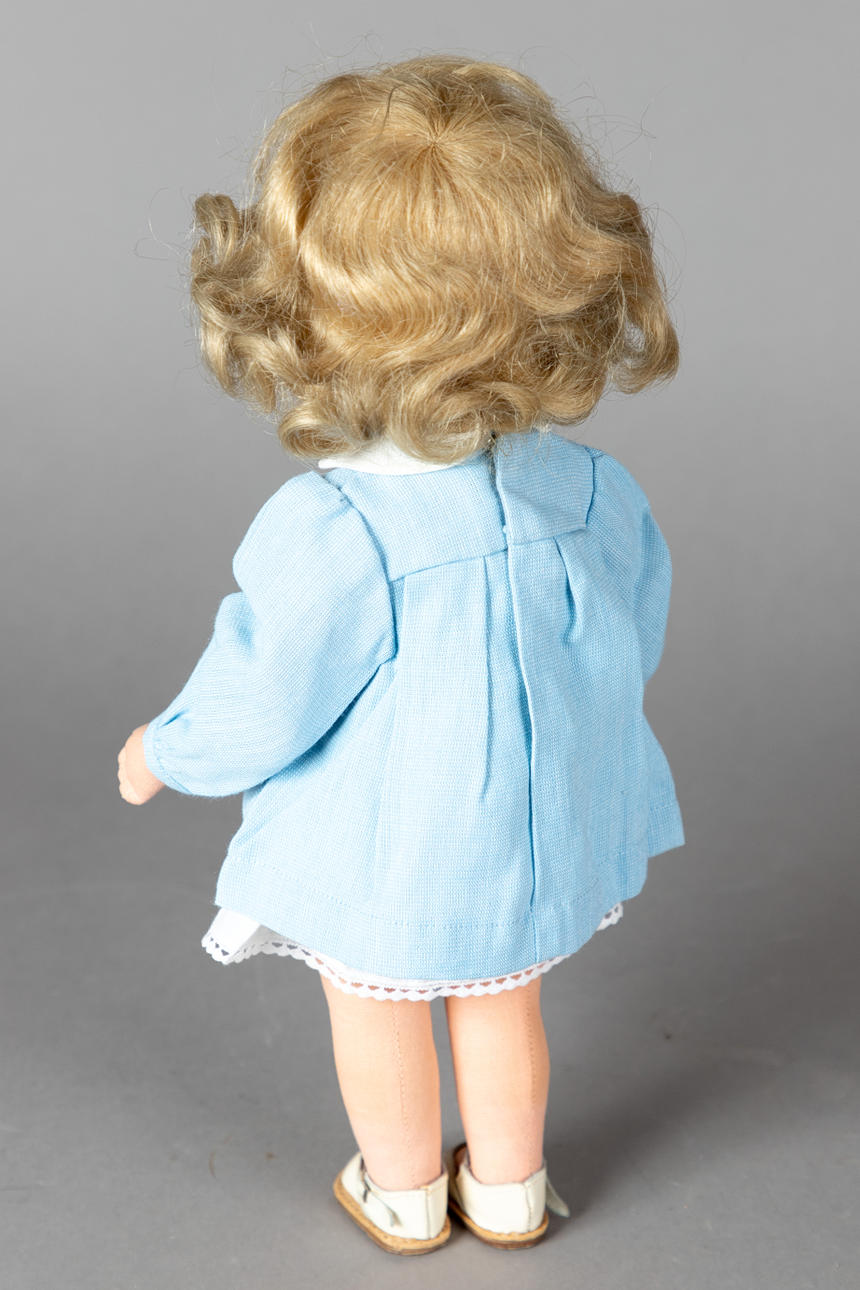 Käthe Kruse Puppe "Gundula" im Originalkarton mit Plakette, 1960er Jahre, Gesicht fein bemalt mit blauen Augen und roten Augeninnenpunkten, blonde Perücke aus Echthaar leicht gelockt, Körper aus Stoff gestopft, runder Halslatz, locker angenähte Arme mit Rück- und Ellbogennaht, Beine mit rückseitiger Naht, unter den Füßen gestempelt: US Zone 21. Juli 1962 / Käthe Kruse, Größe ca. 35 cm.