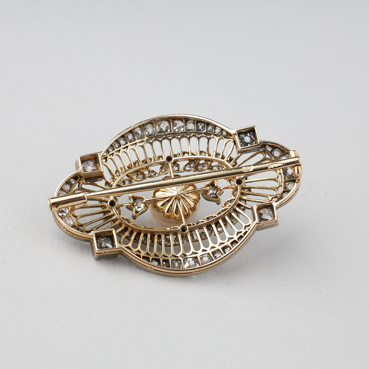 Vier Eckdiamanten im Altschliff zus. ca. 1,00 ct, weitere Diamanten zus. ca. 1,50 ct, Perlendurchmesser 10 mm, Maße 47 x 31 mm, Gewicht ca. 12,1 g, russische Briefmarken.