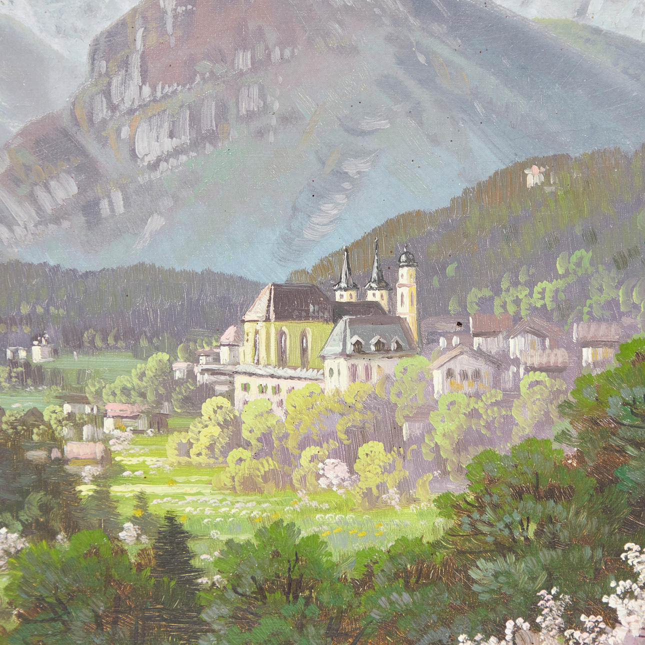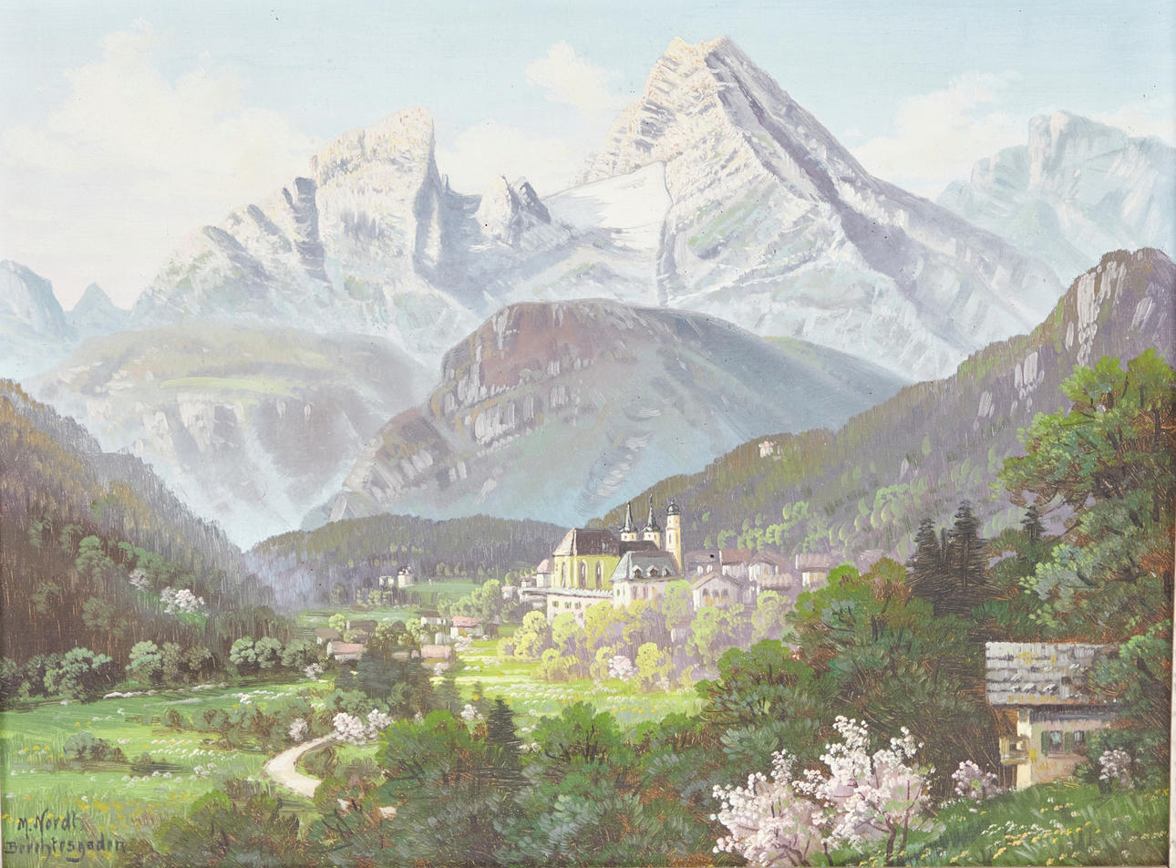 Max Nordt (1895-1979), Gemälde, Berchtesgaden bei Tag, Öl auf Leinwand. Darstellung einer sommerlichen Talansicht mit Stiftskirche und den sich darüber erhebenden Berchtesgadener Alpen, unten links signiert und topographiert, 37,5x48cm (60x72cm).