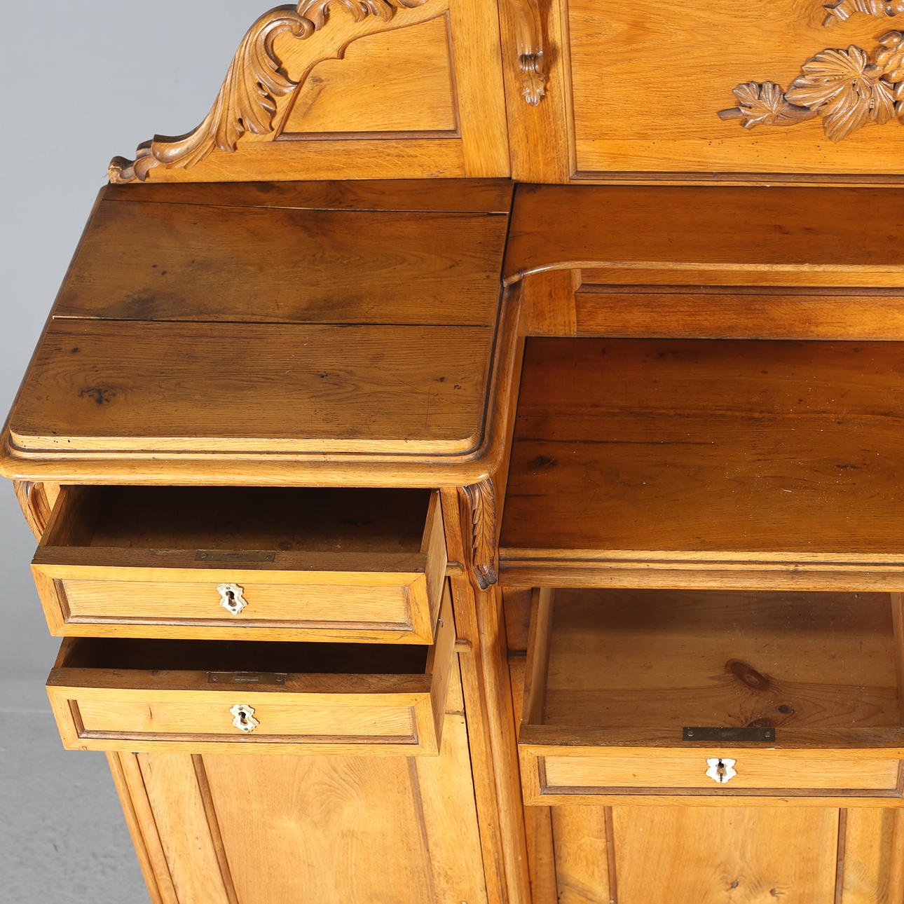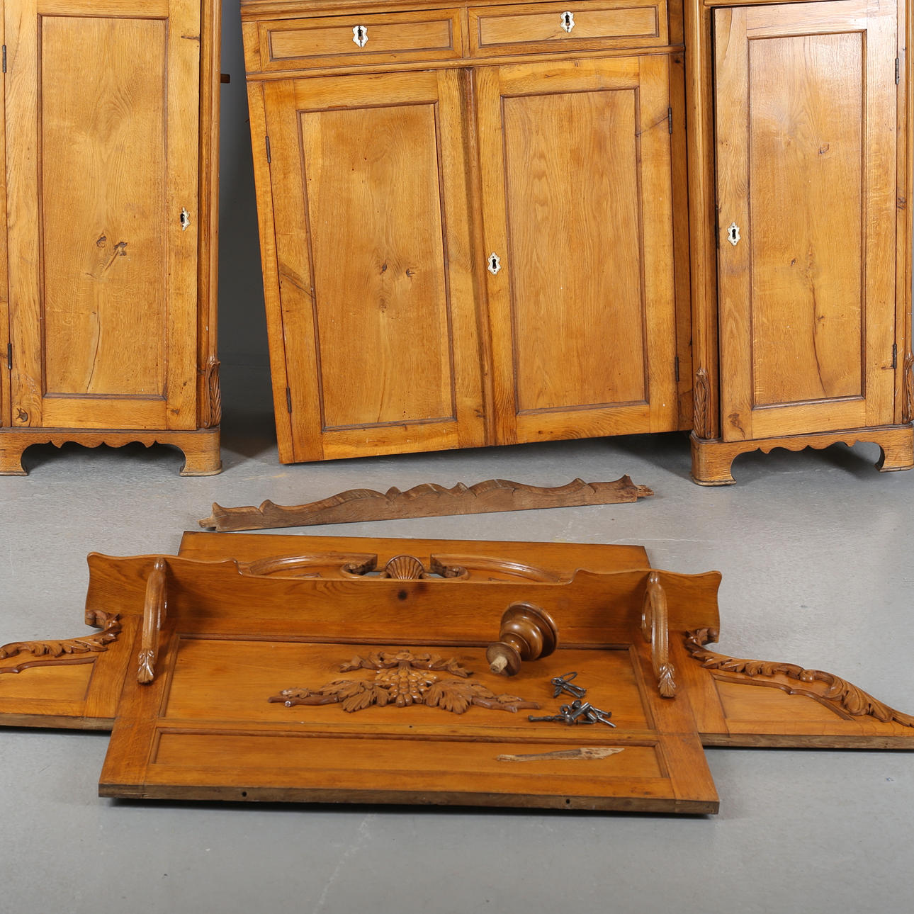 Abnehmbar, siehe Bilder. Größtenteils lose Teile, Gebrauchsspuren sowie Beschädigungen, Maskenzunge, Trockenrisse. Bei Abholung eine Tragehilfe mitbringen!!!