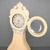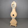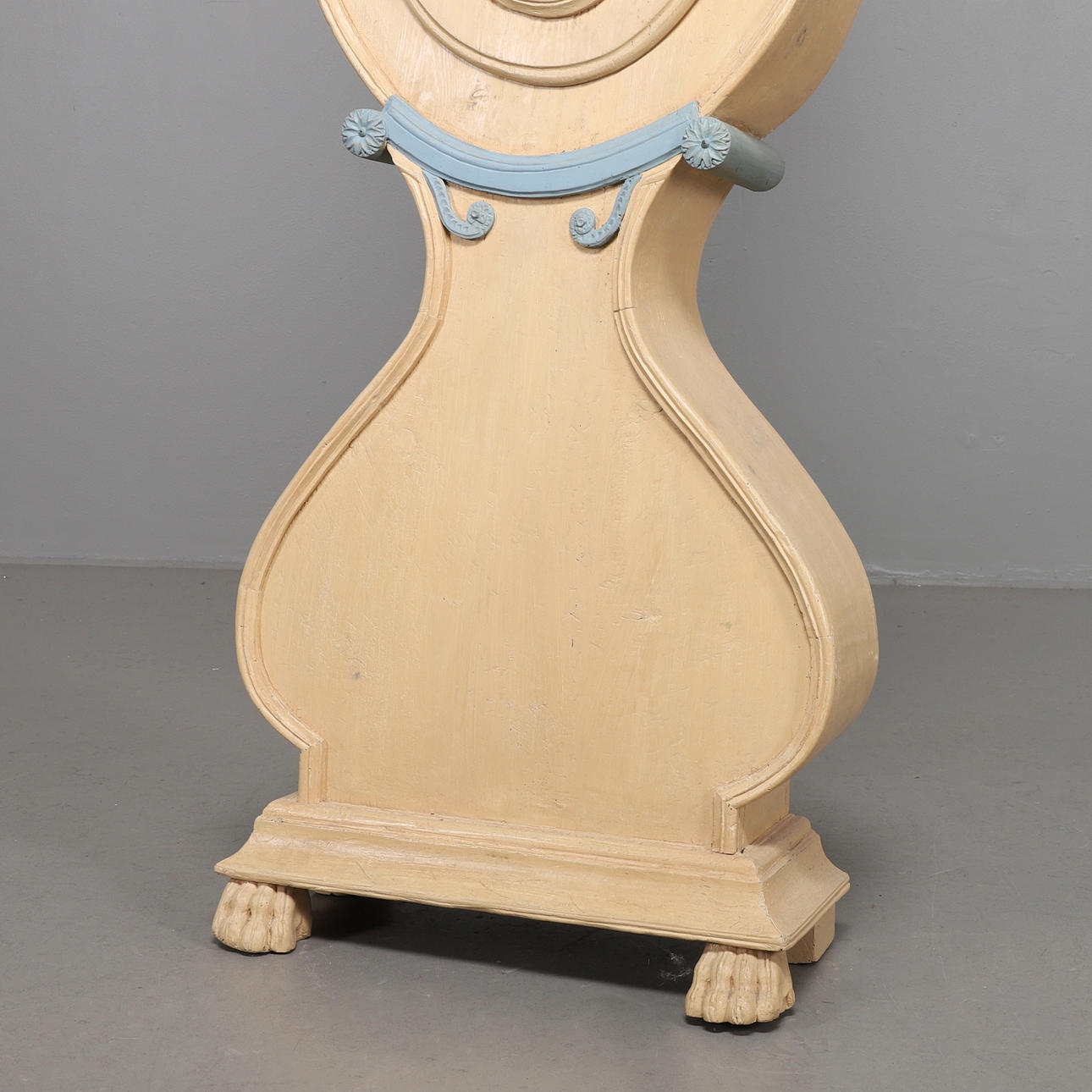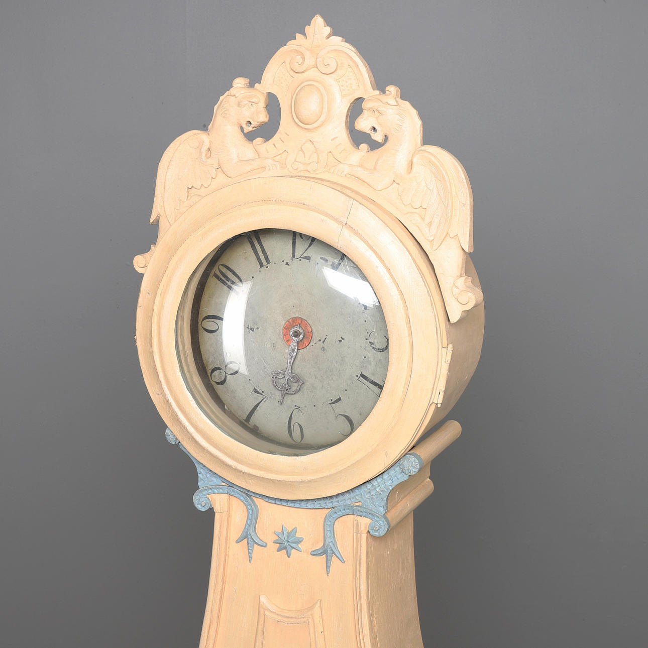 Standuhr mit holzgeschnitztem Dekor, Wappen mit geflügelten Löwen. Auf Füßen in Form von Löwentatzen.