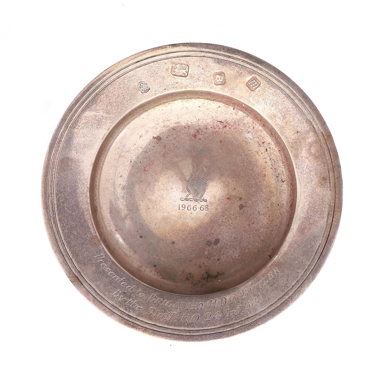 RB Wigfull & Son, London, 1968, und eingraviert „Presented to Brigadier HDG Butler By the staff, HQ 24 Unf. Bde“, mit Wappen und Jahreszahlen „1966-68“ in der Mitte, 11 cm Durchmesser.
