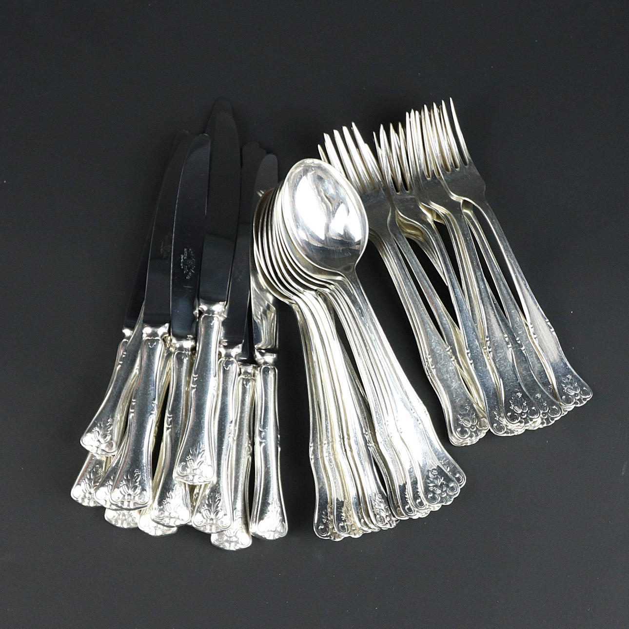 12 Gabeln, Länge ca. 17 cm 12 Esslöffel Länge ca. 17,5 cm 12 Tafelmesser Länge ca. 20,5cm.