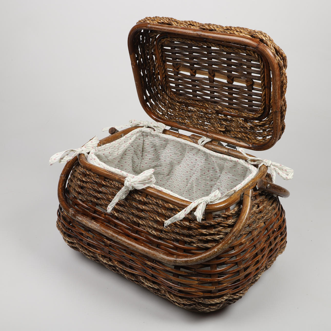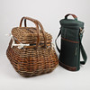 1 Picknickkorb innen mit Rattan bezogen, Höhe 27, Breite ca. 30, Länge ca. 40 cm 1 Weinkühltasche mit Korkenzieher und Weinkorken, Höhe 34, Breite 22 cm.