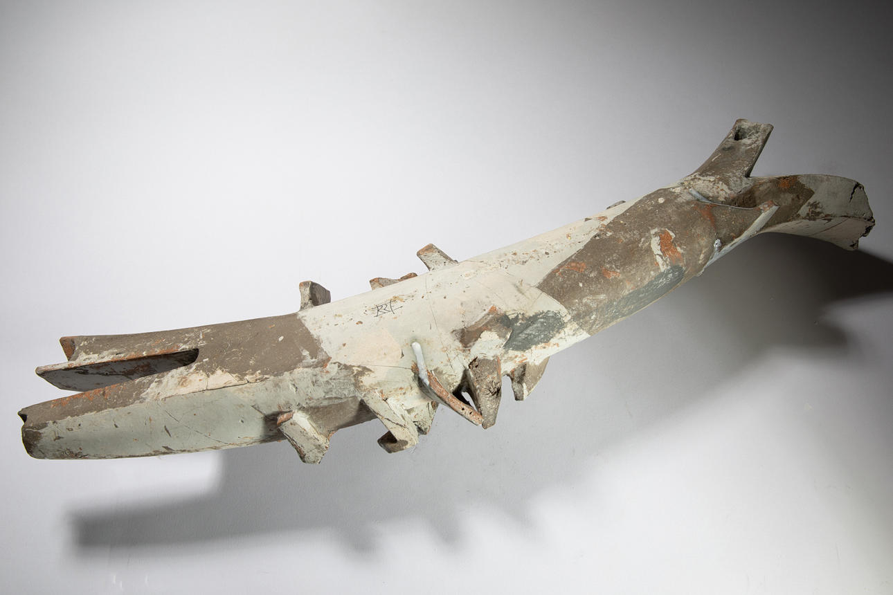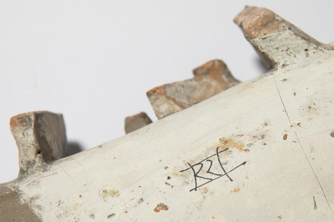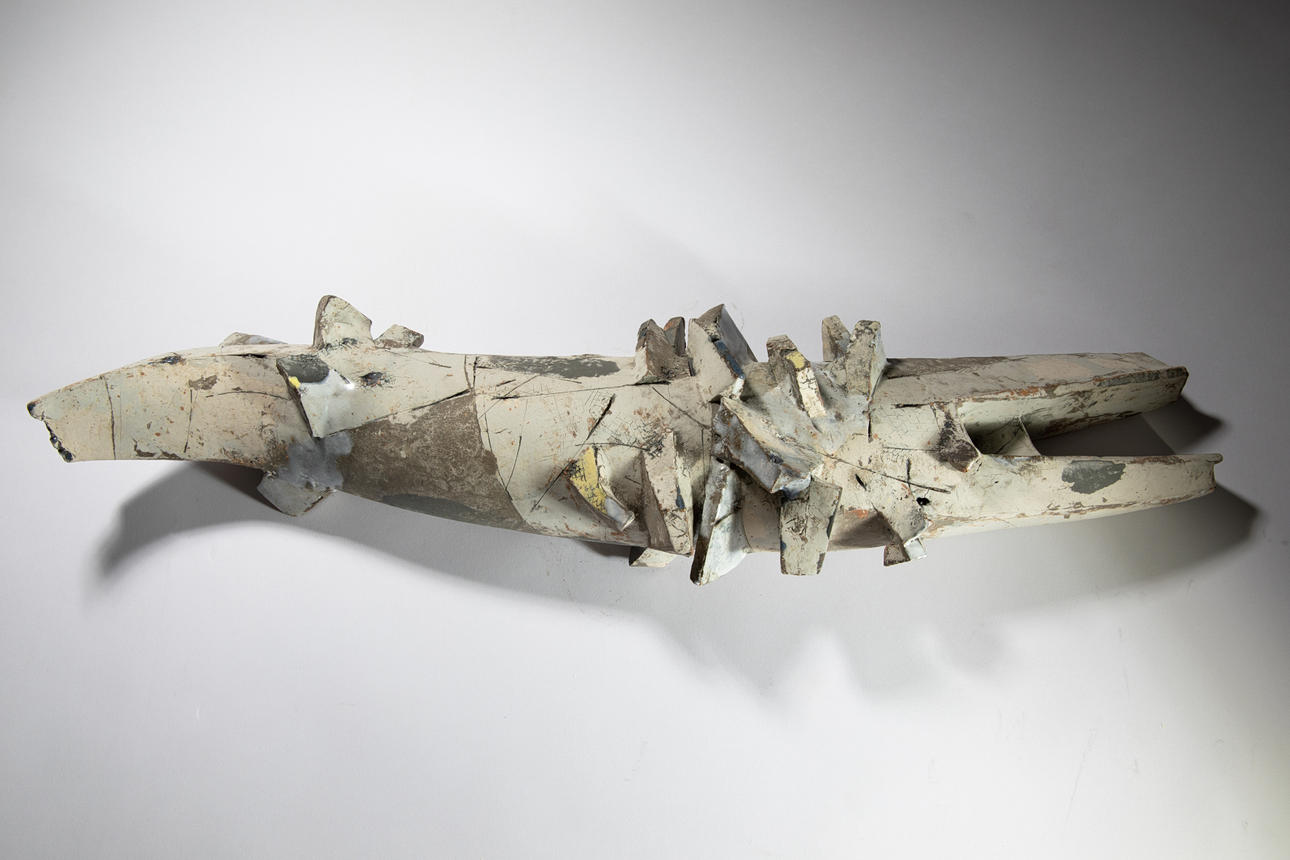 Fisch. Keramik. Weiße, gelbe und hellblaue Glasur. H. 11 cm, D. 67 cm. Signatur auf Unterseite.