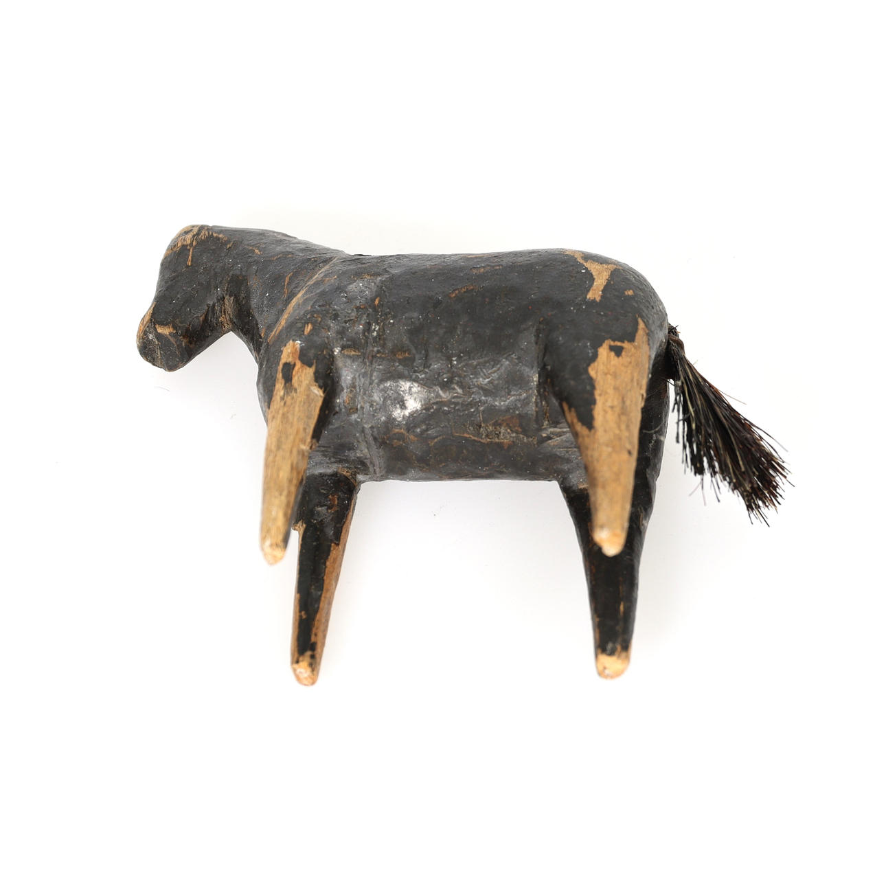 Kleines Holzpferd, teilweise bemalt, Schachtelhalmschweif. Schweden, 19. Jahrhundert. Höhe ca. 10,5 cm.